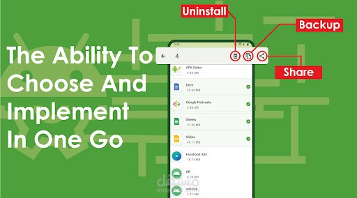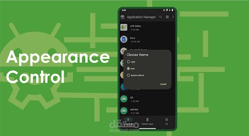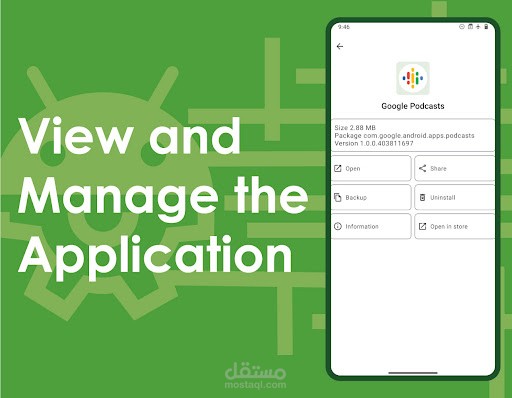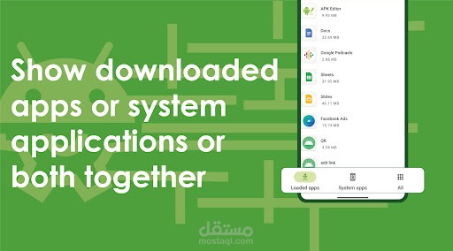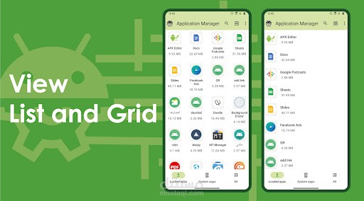 This app provides a display of your phone's applications in separate and collective lists, where you can view: