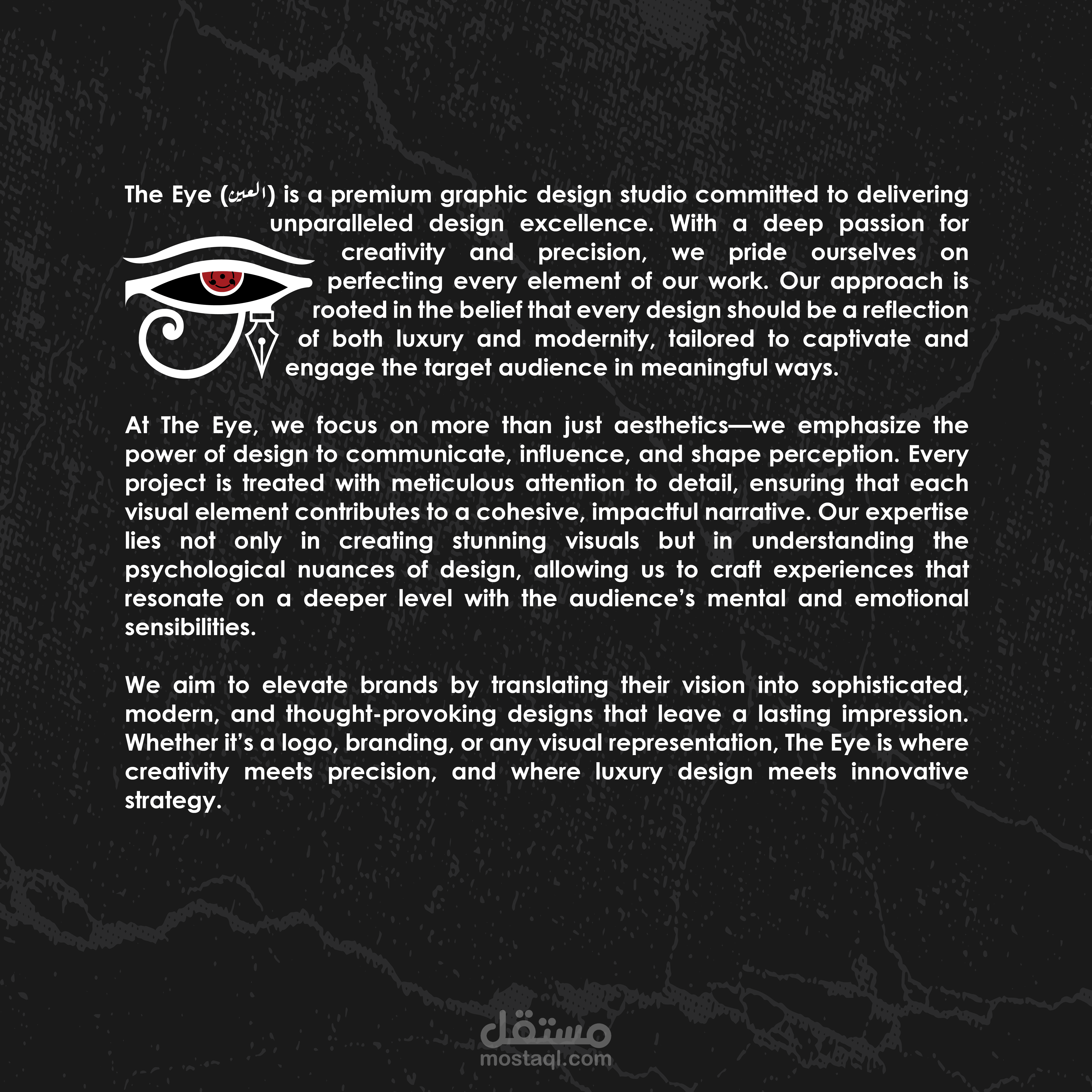 The Eye (العين) is a premium graphic design studio committed to delivering unparalleled design excellence. With a deep passion for creativity and precision, we pride ourselves on perfecting every element of our work. Our approach is rooted in the belief that every design should be a reflection of both luxury and modernity, tailored to captivate and engage the target audience in meaningful ways.