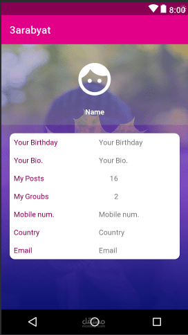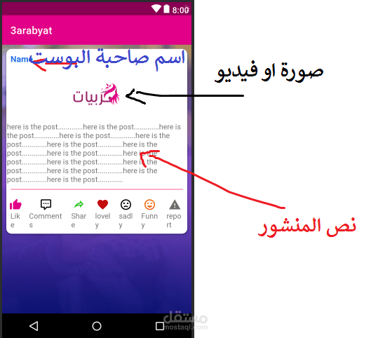 تطبيق للتواصل الاجتماعي (المجتمع الأنثوي) - تطبيق يقوم بتوفير منصة نسائية ، تقوم النسوة من خلالها بتشارك البوستات الخاصة بالطبخ والخياطة والرسم وفنون تربية الإطفال...إلخ. - يجمع كل خصائص وسائل التواصل الاجتماعي من بوستات ولايكات وتعليقات وبروفايلت وطلبات صداقة وتشاتينغ وبث مباشر قيد التطوير.. مع لوحة تحكم كاملة للإدارة. (مشروع غير مكتمل، بسبب ايقافه من طرف العميل لأسباب مادية )