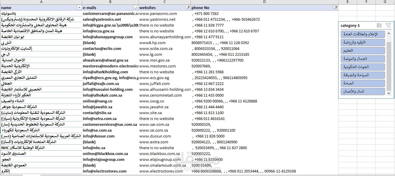 4- تم جدولة المعلومات فى شيت اكسل (قاعدة بيانات) يسهل على العميل فلترة الفئة / المجال المستهدف