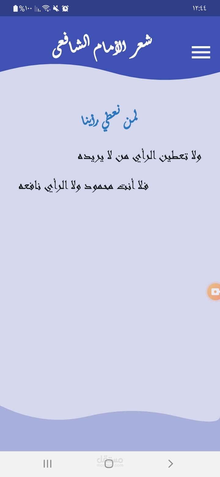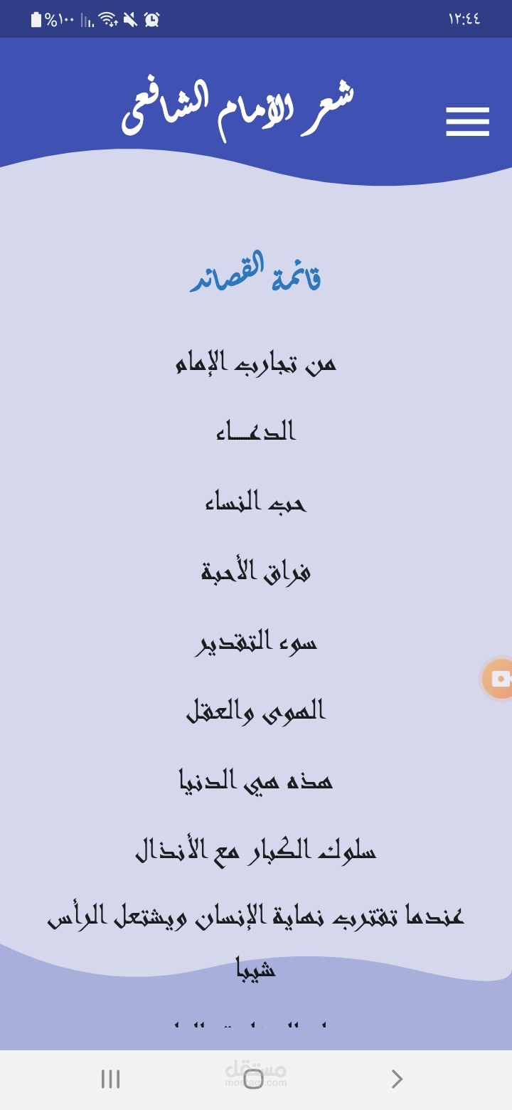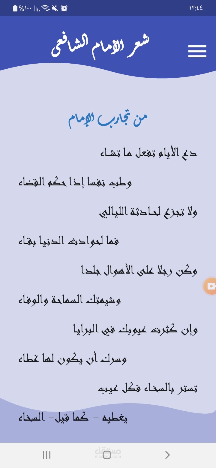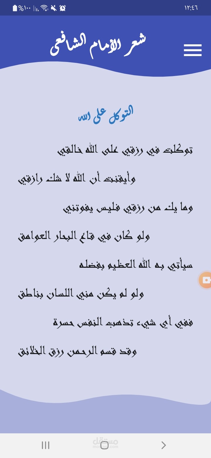 The 'Imam Shafi'i Poems' mobile application is an excellent platform for discovering and enjoying the profound religious poems of Imam Shafi'i. This project aims to develop a user-friendly and feature-rich mobile application that provides access to a collection of Imam Shafi'i's poems, allowing users to read, explore, and appreciate this valuable content.