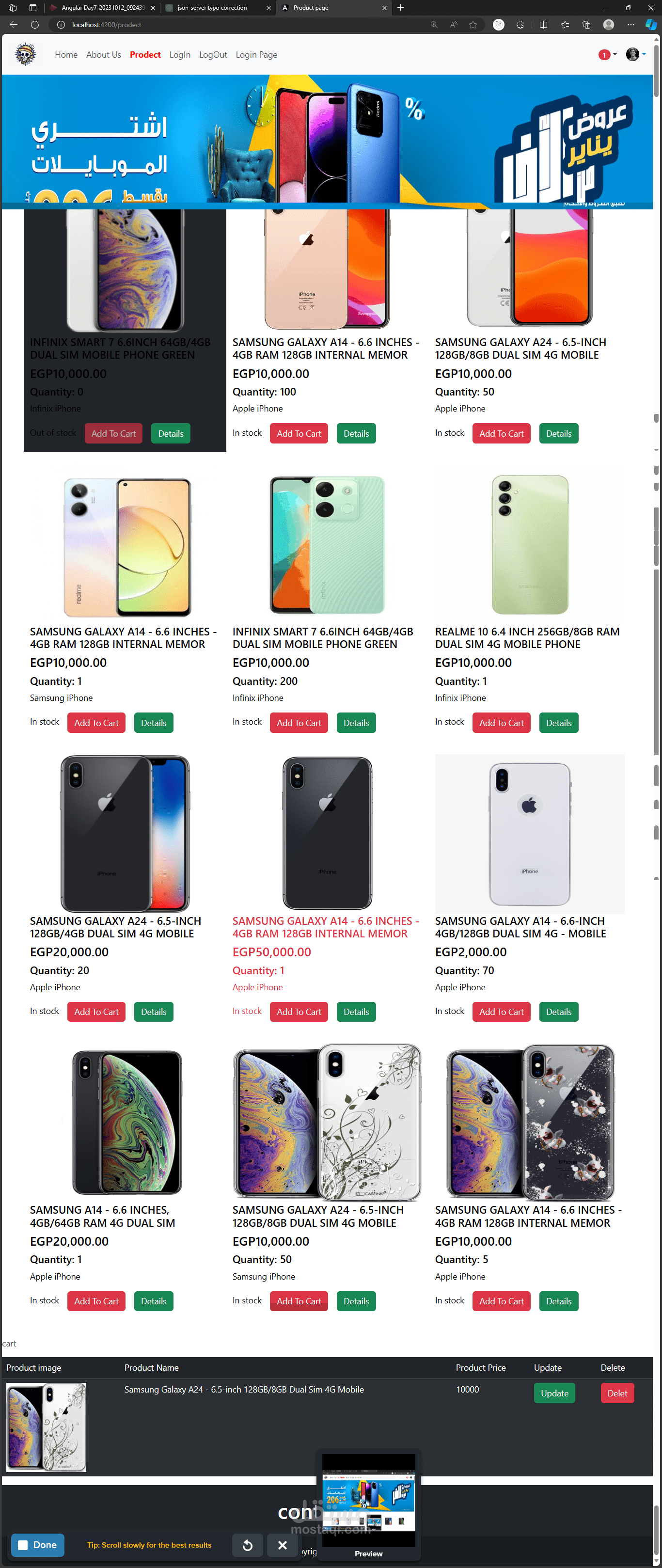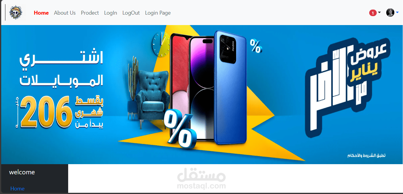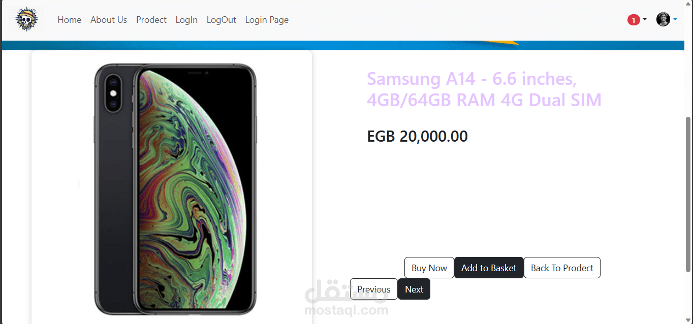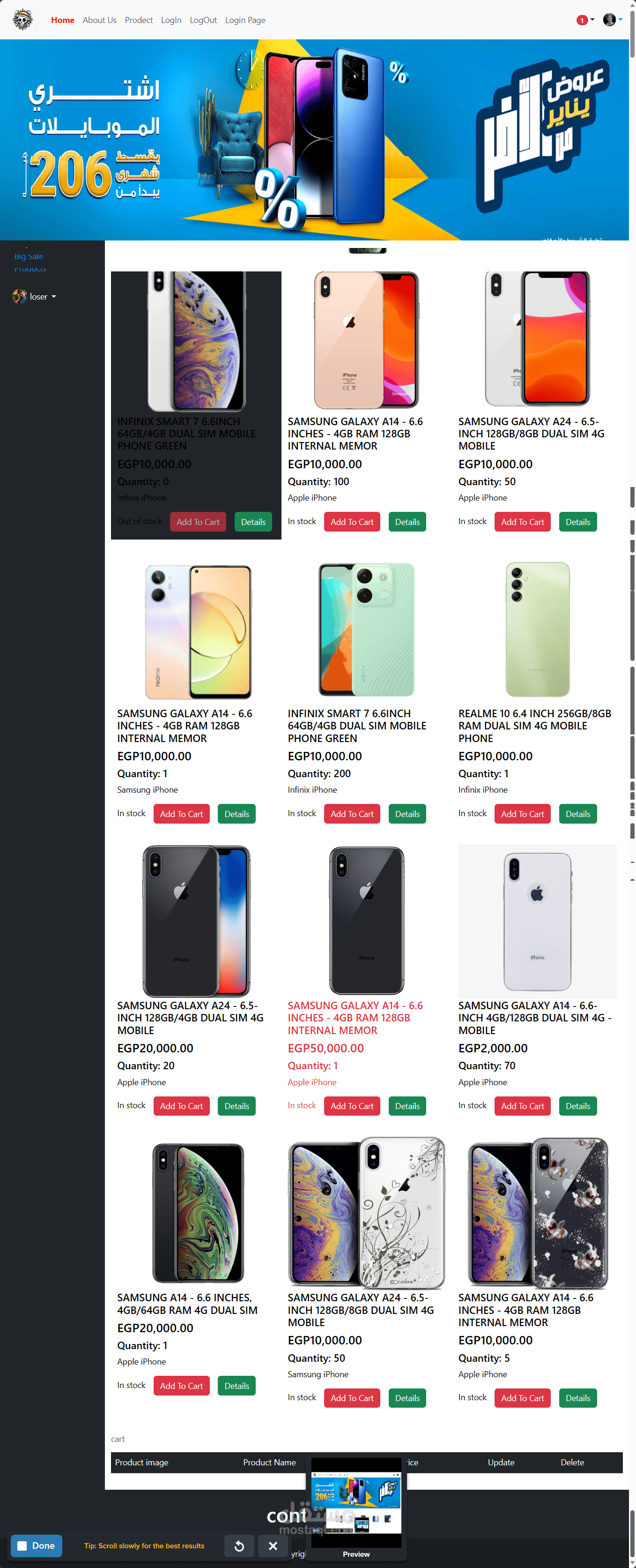 موقع لبيع الهواتف الجوالة يحتوي علي أكثر من صفحة صفحة رئيسية وصفحة للمنتجات وصفحة لتسجيل الدخول وبة كارد يمكن من خلالة تخزين الهواتف المشتراة