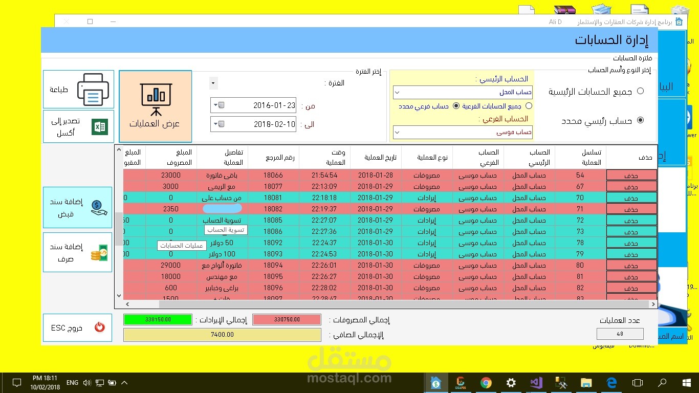 حسابات عامة وفرعية لإضافة جميع أنواع الإيرادات والمصروفات بطريقة محاسبية وحساب الرصيد لكل حساب.