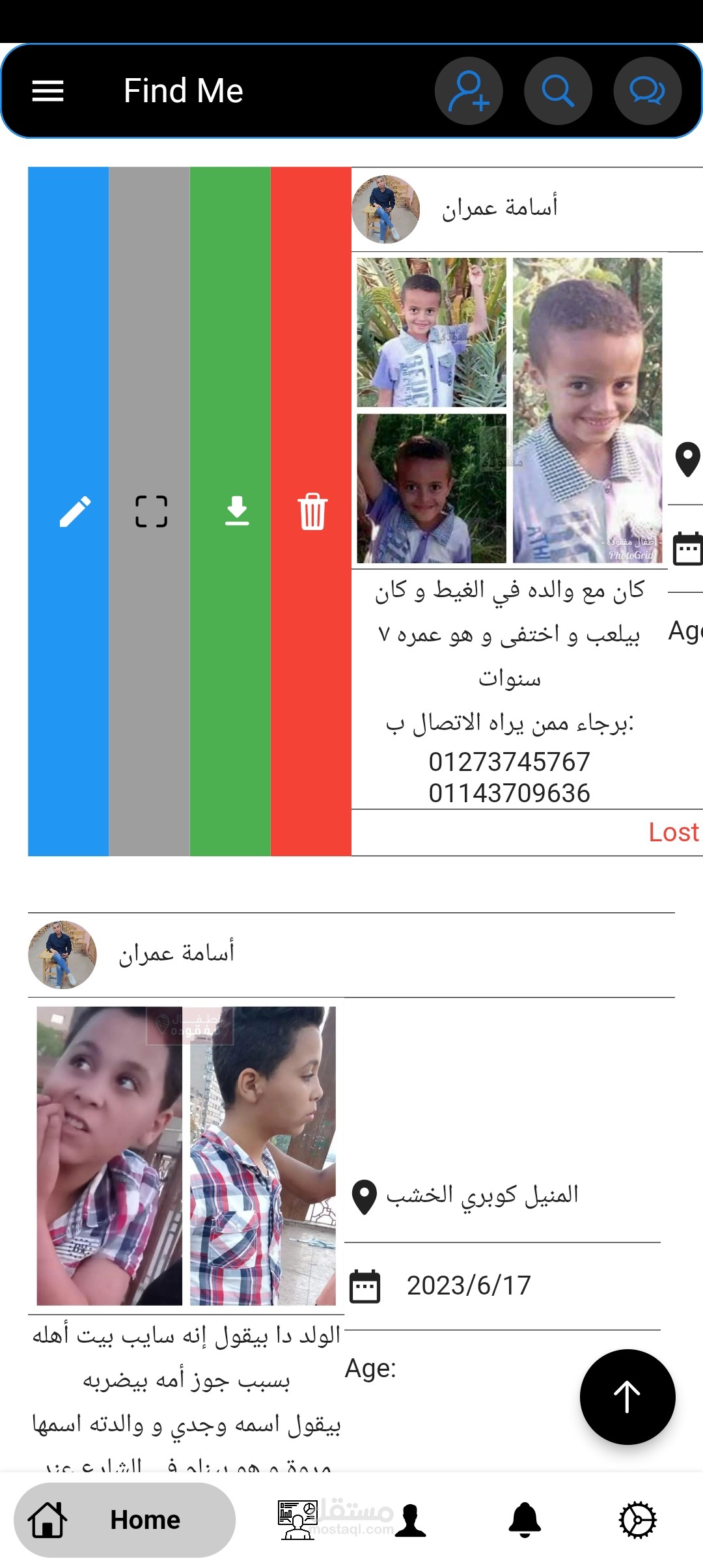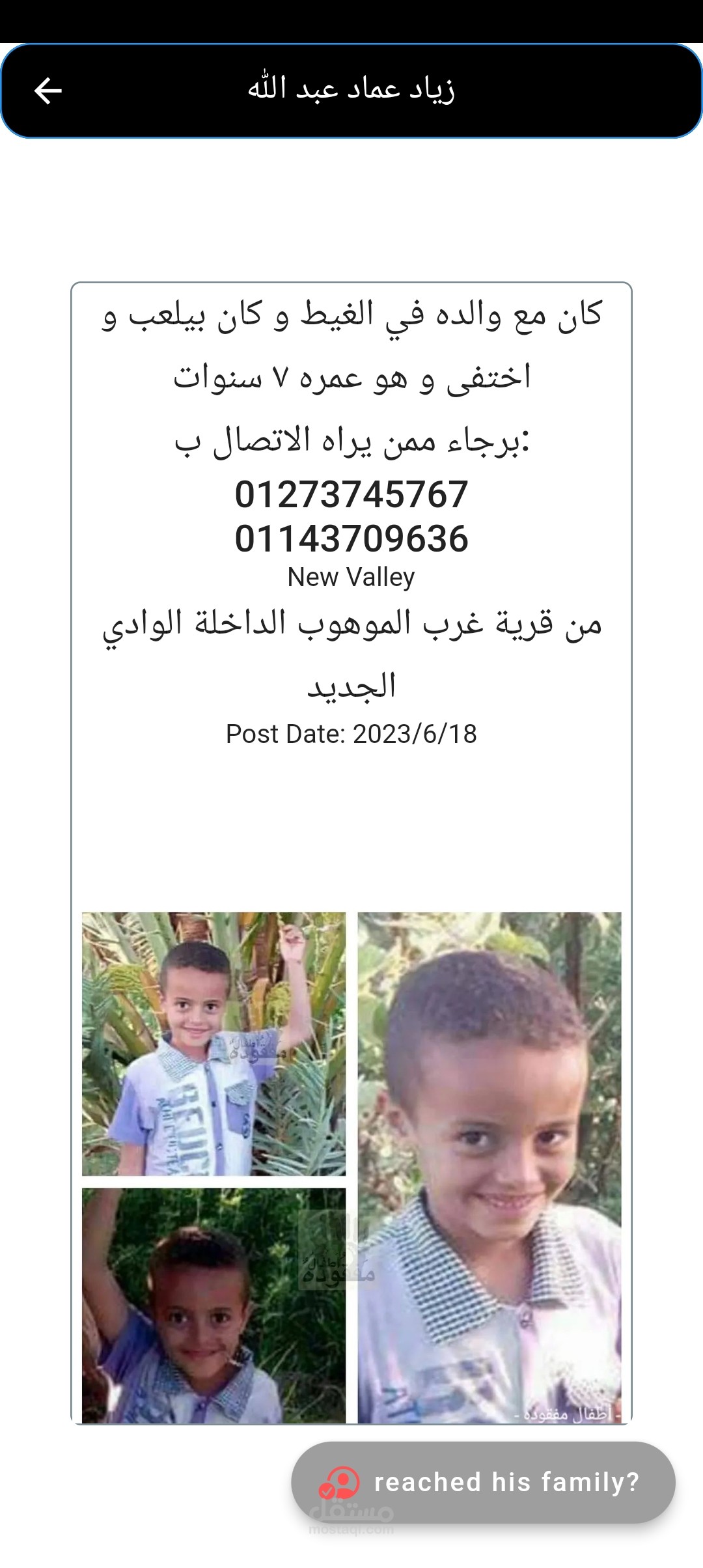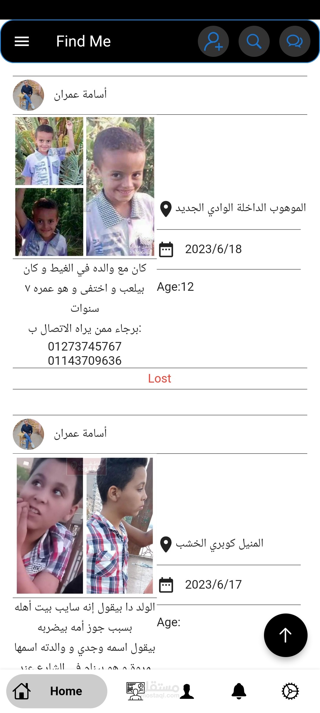 تطبيق موبايل للبحث و التنويه عن المفقودين في منشورات تشبه منشورات فيسبوك و السماح بالتواصل الكتابي بين المستخدمين.