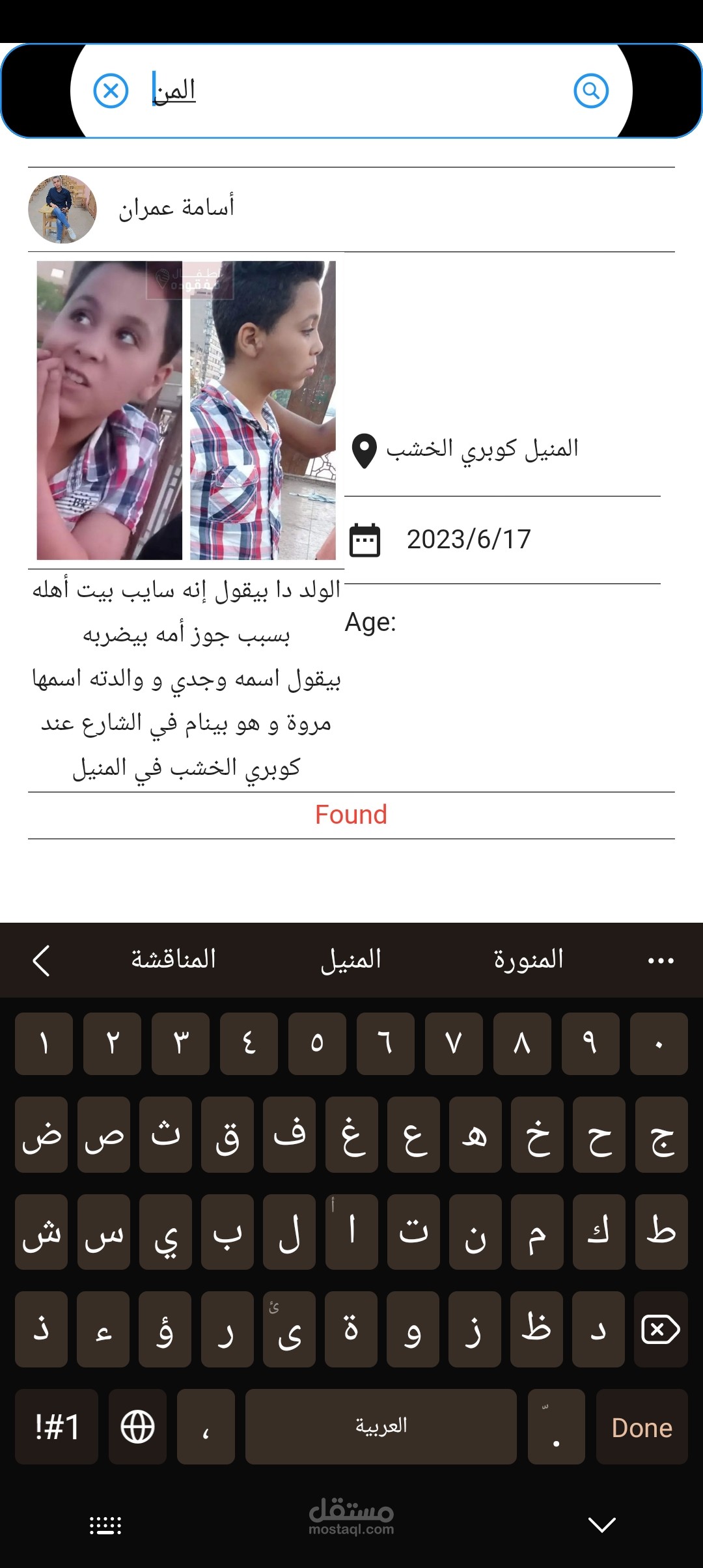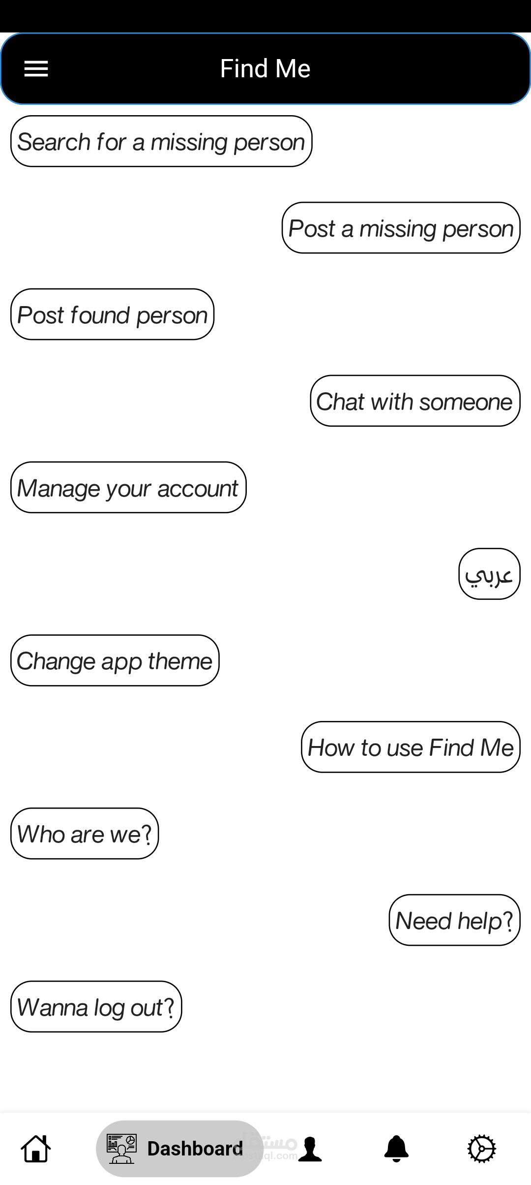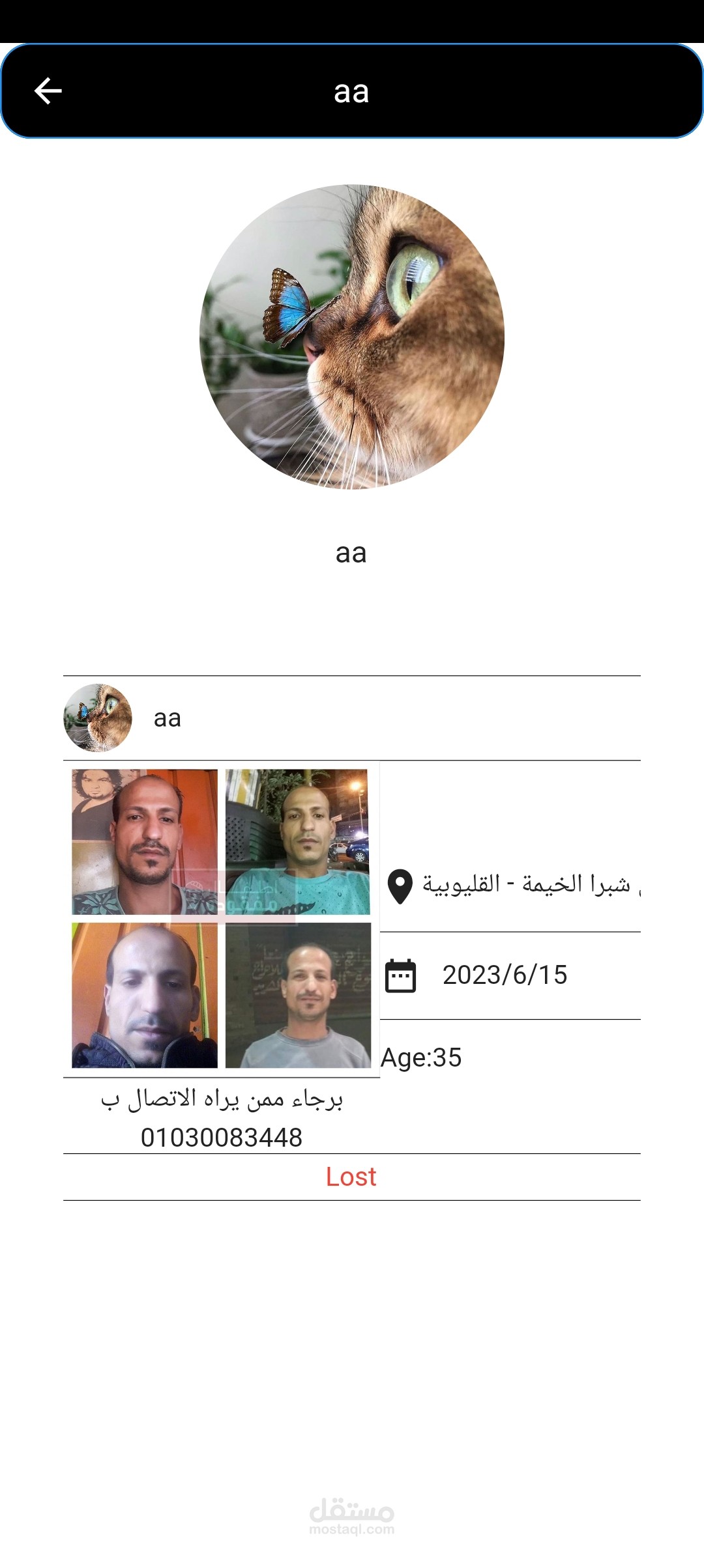تطبيق موبايل للبحث و التنويه عن المفقودين في منشورات تشبه منشورات فيسبوك و السماح بالتواصل الكتابي بين المستخدمين.