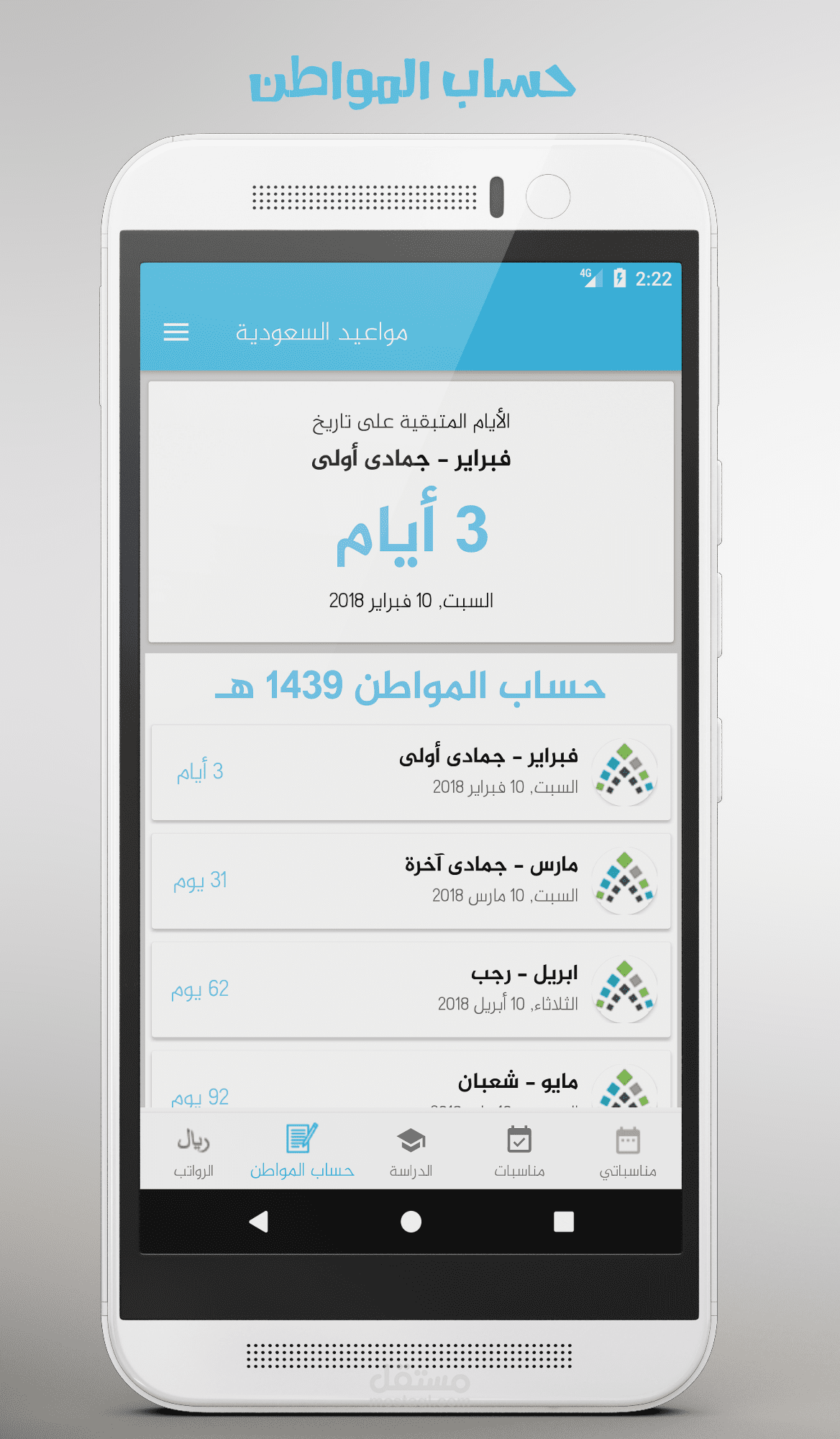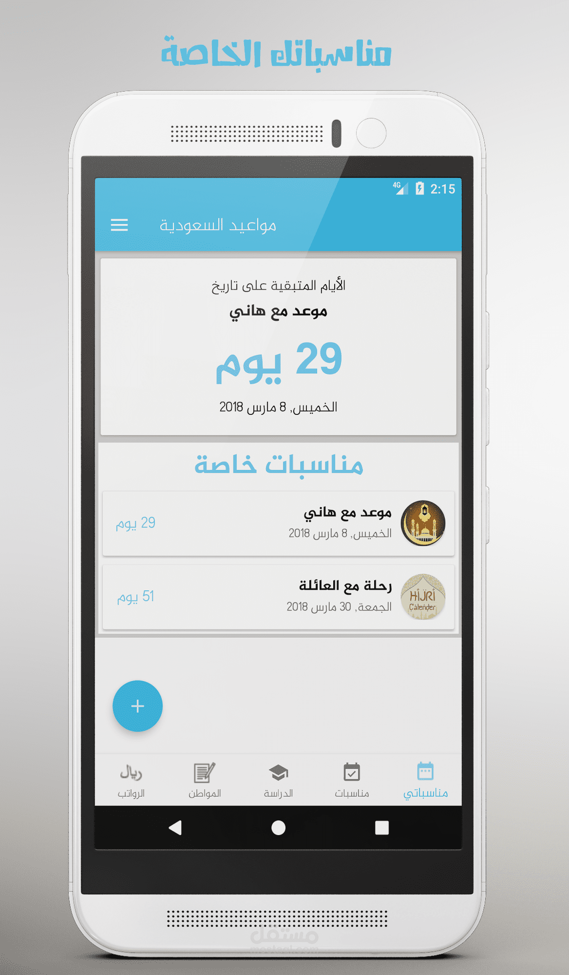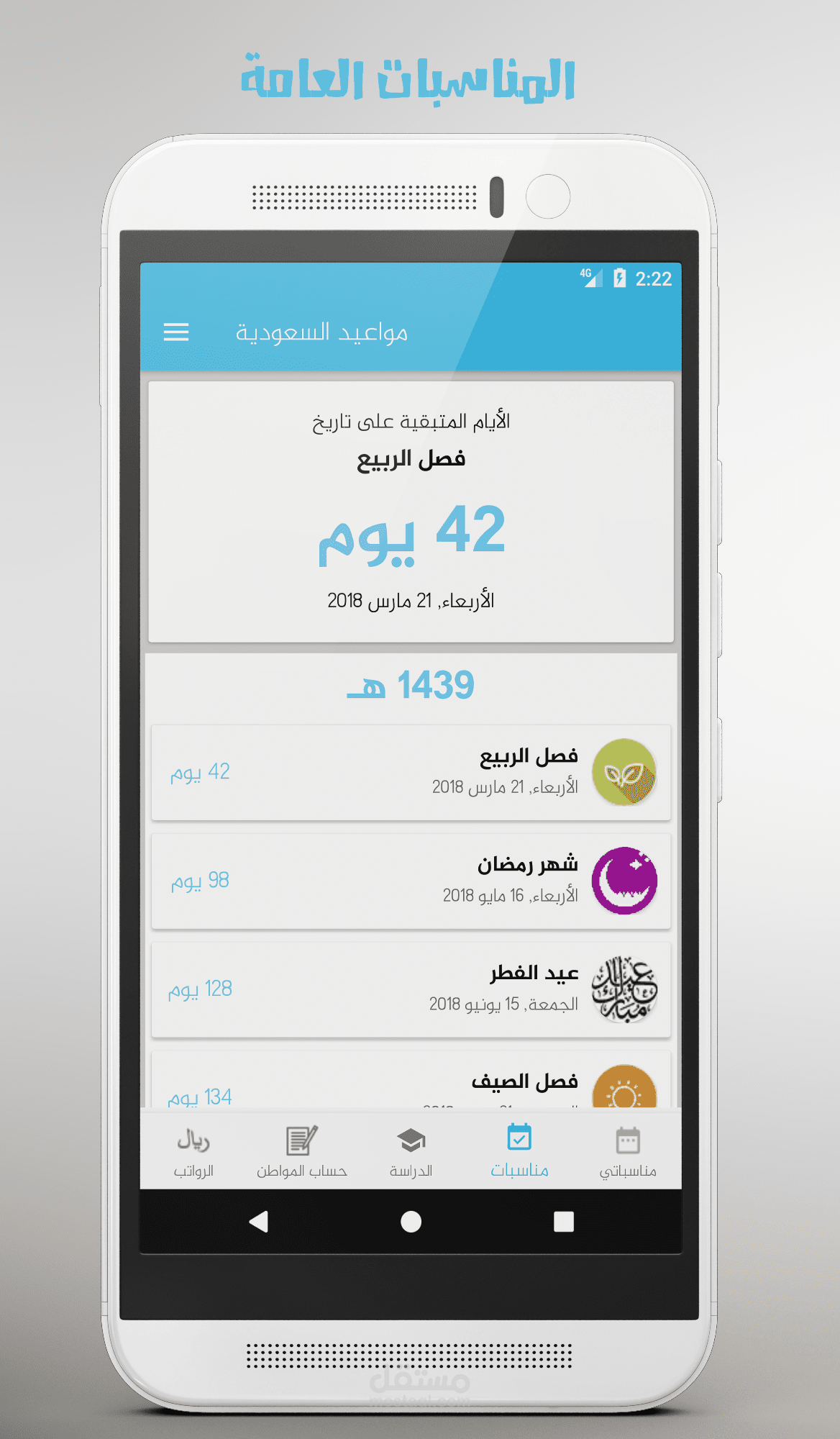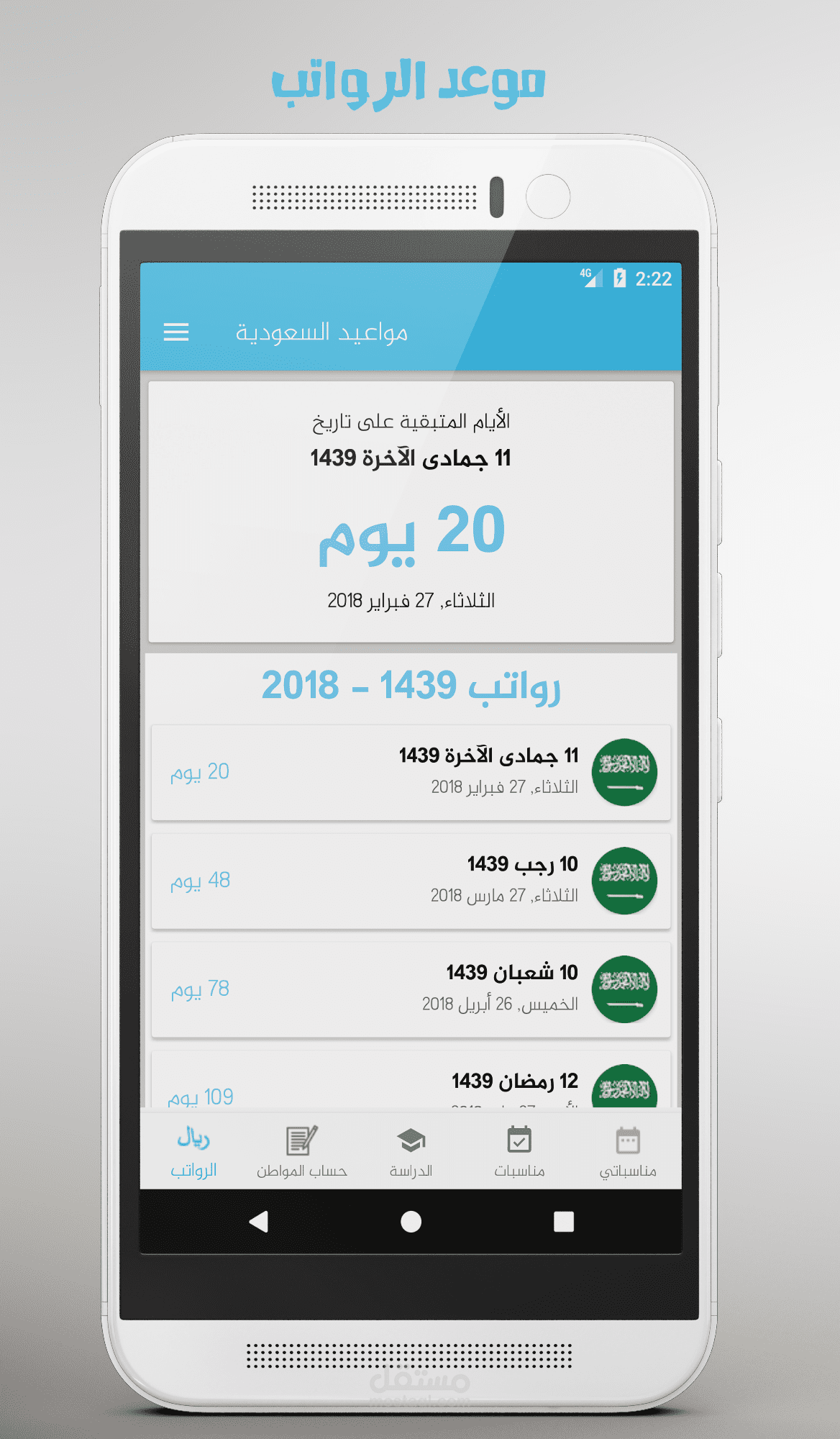 تطبيق يعرض العد التنازلي للأيام المتبقية للمناسبات مثل الرواتب وحساب المواطن والاجازات الدراسية والاعياد ويمكنكم ايضاً اضافة مناسبات خاصة بكم وعمل تنبيه لها.