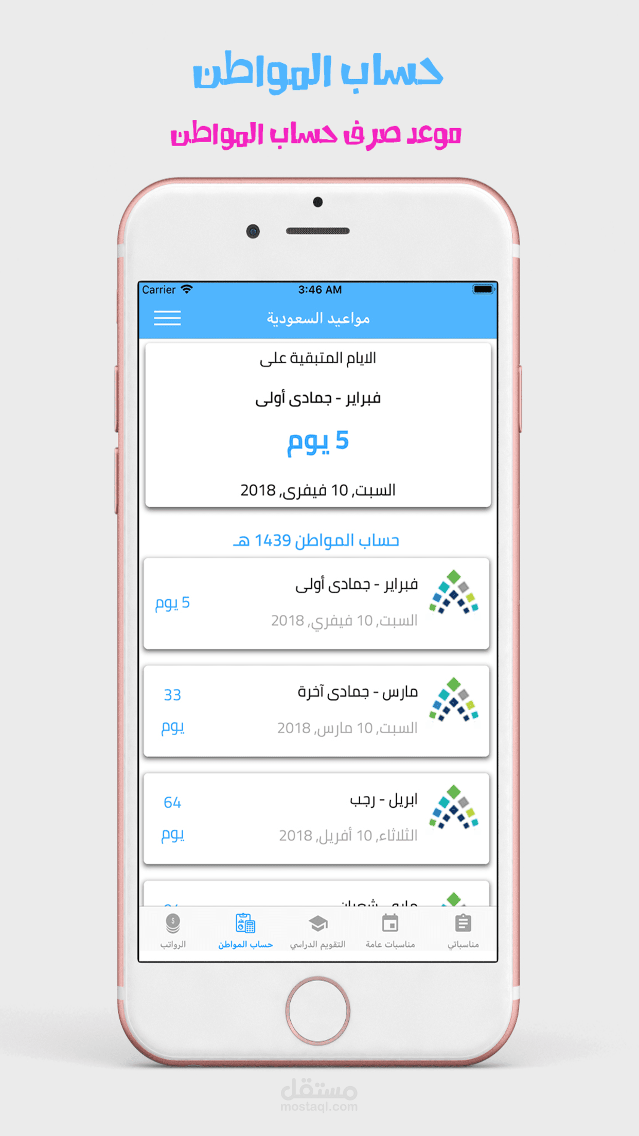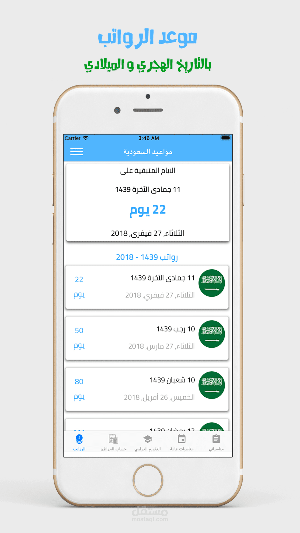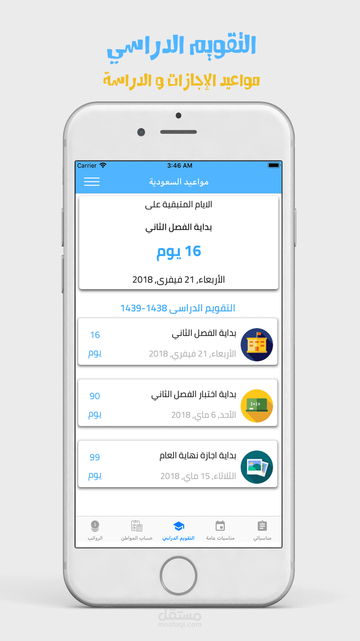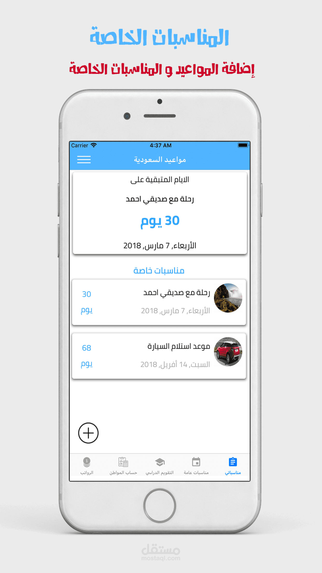 تطبيق يعرض العد التنازلي للأيام المتبقية للمناسبات مثل الرواتب وحساب المواطن والاجازات الدراسية والاعياد ويمكنكم ايضاً اضافة مناسبات خاصة بكم وعمل تنبيه لها