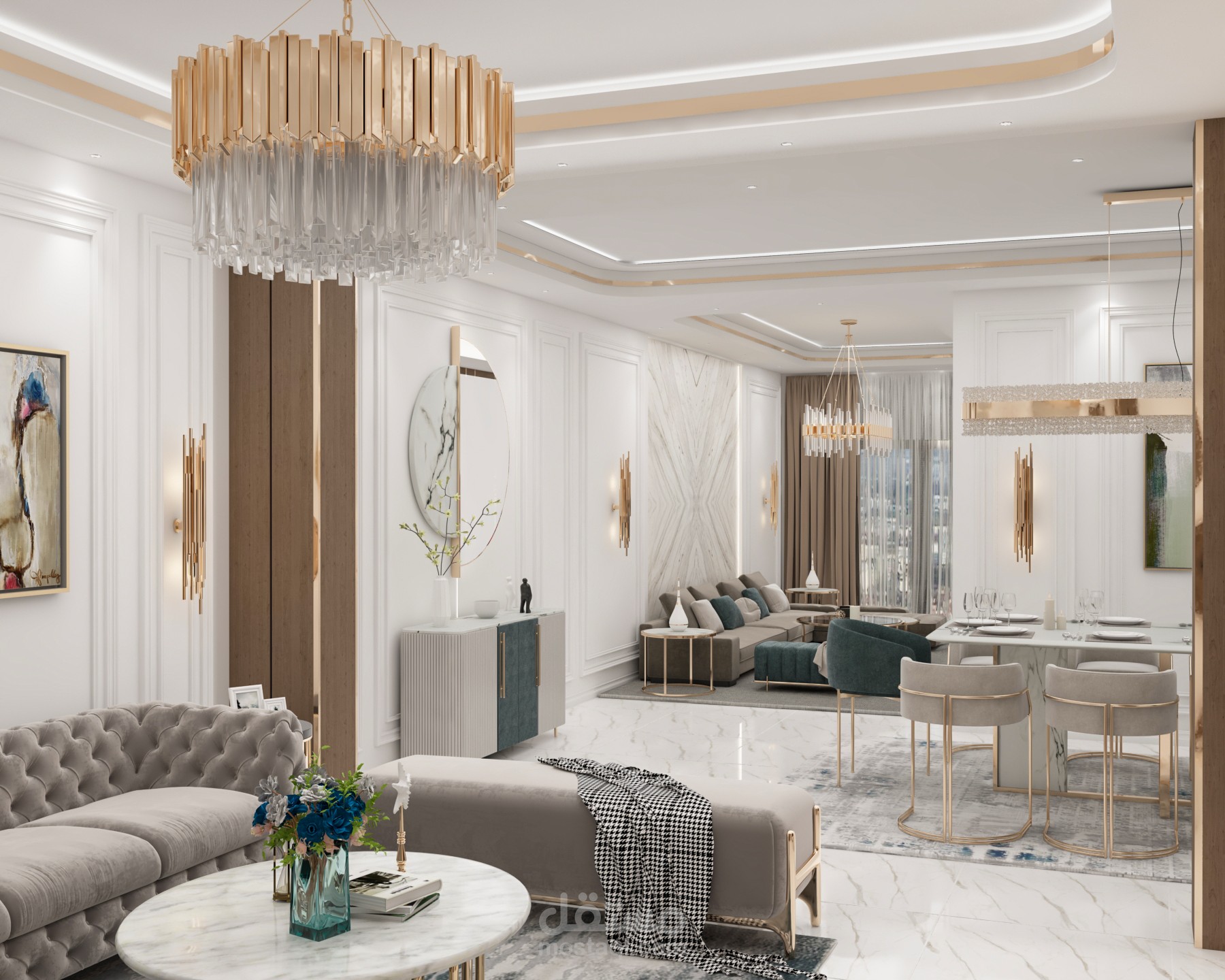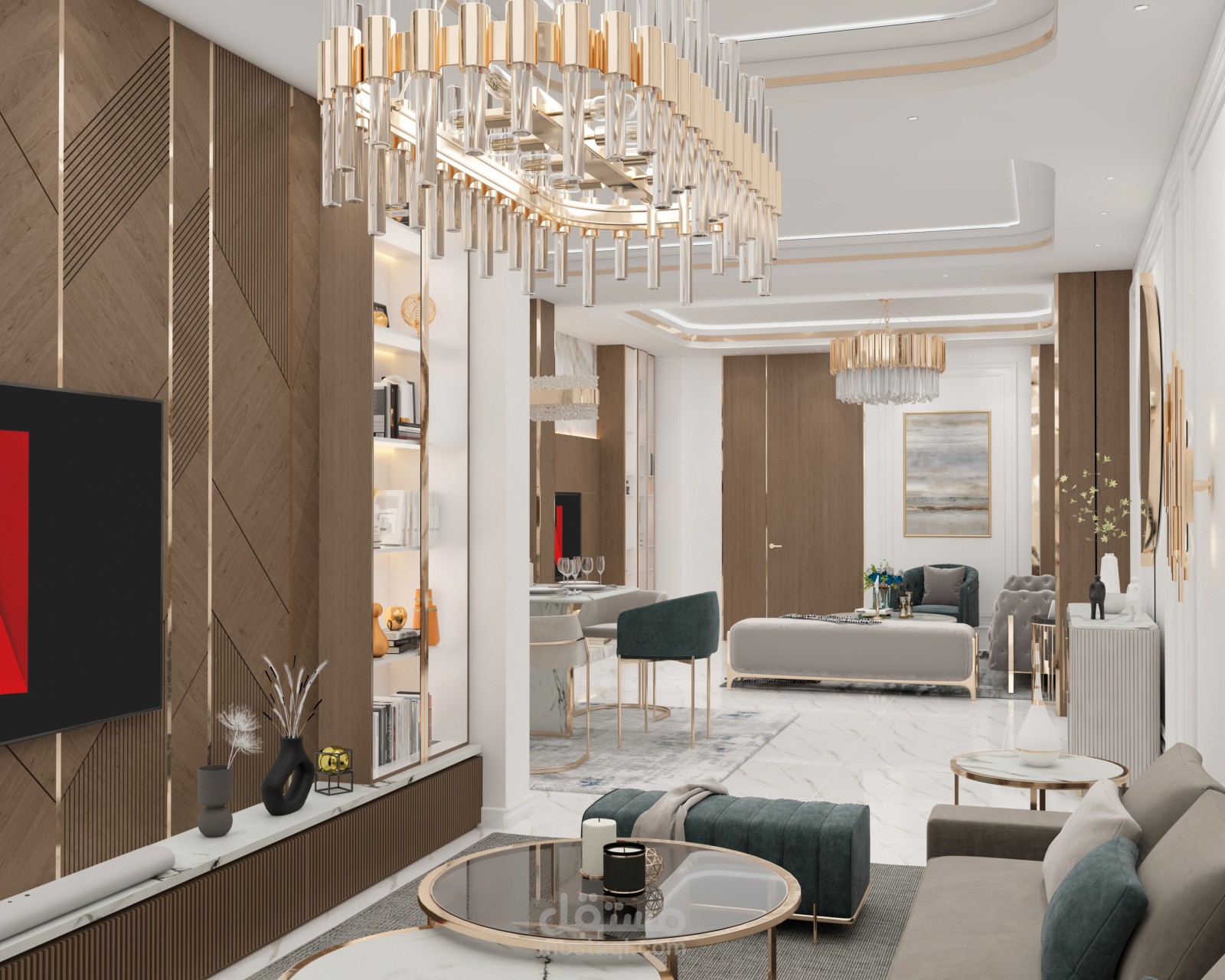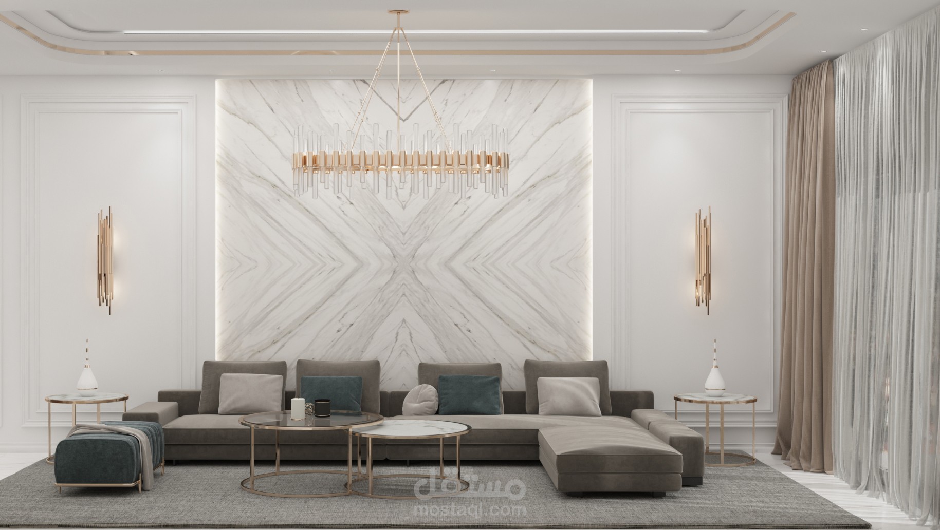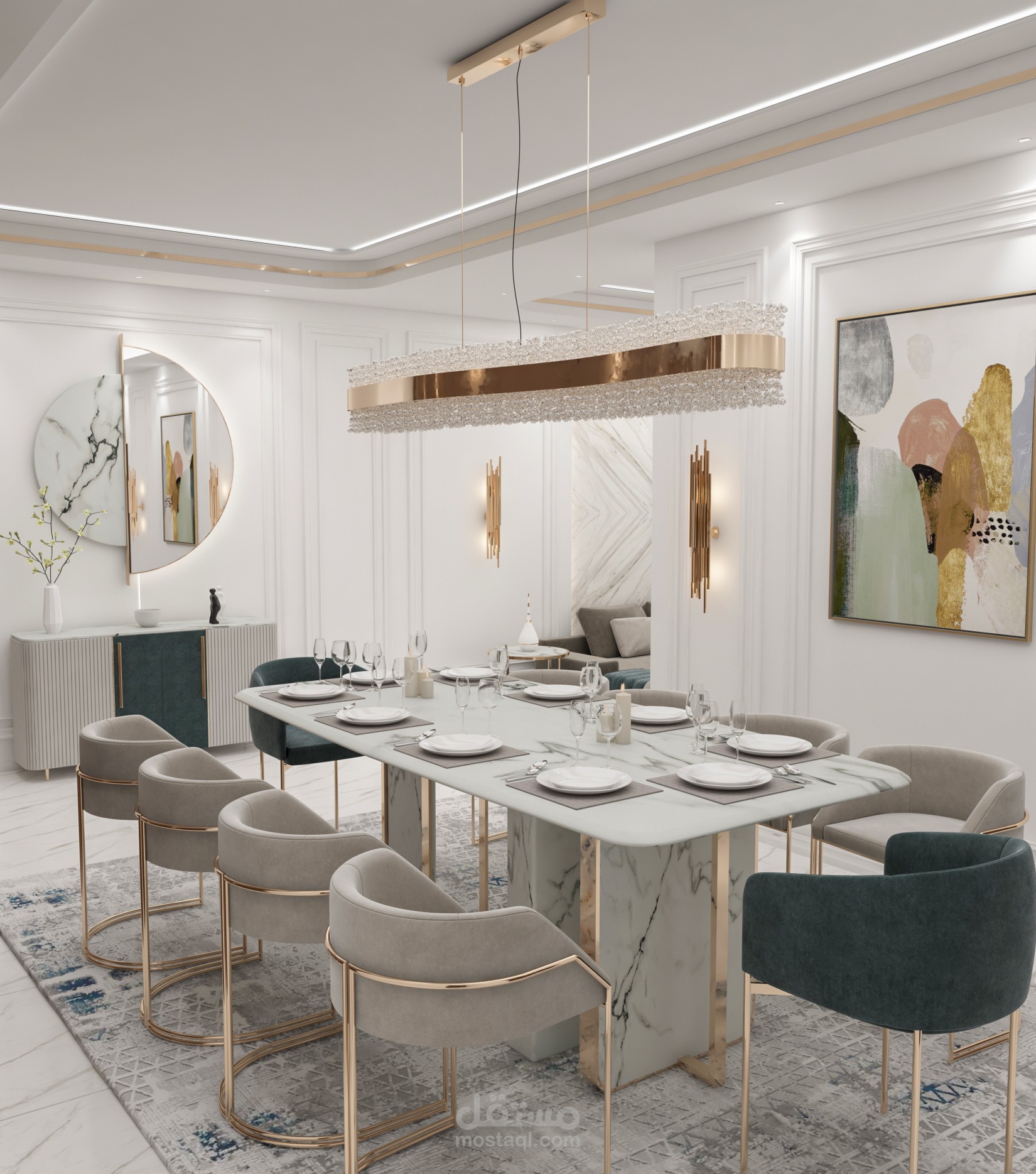 ثلاث فراغات ( صالون - غرفة طعام - معيشة ) تم التصميم على الأسلوب New classic وتم عمل بارتشن متحرك للصالون من اجل الخصوصية