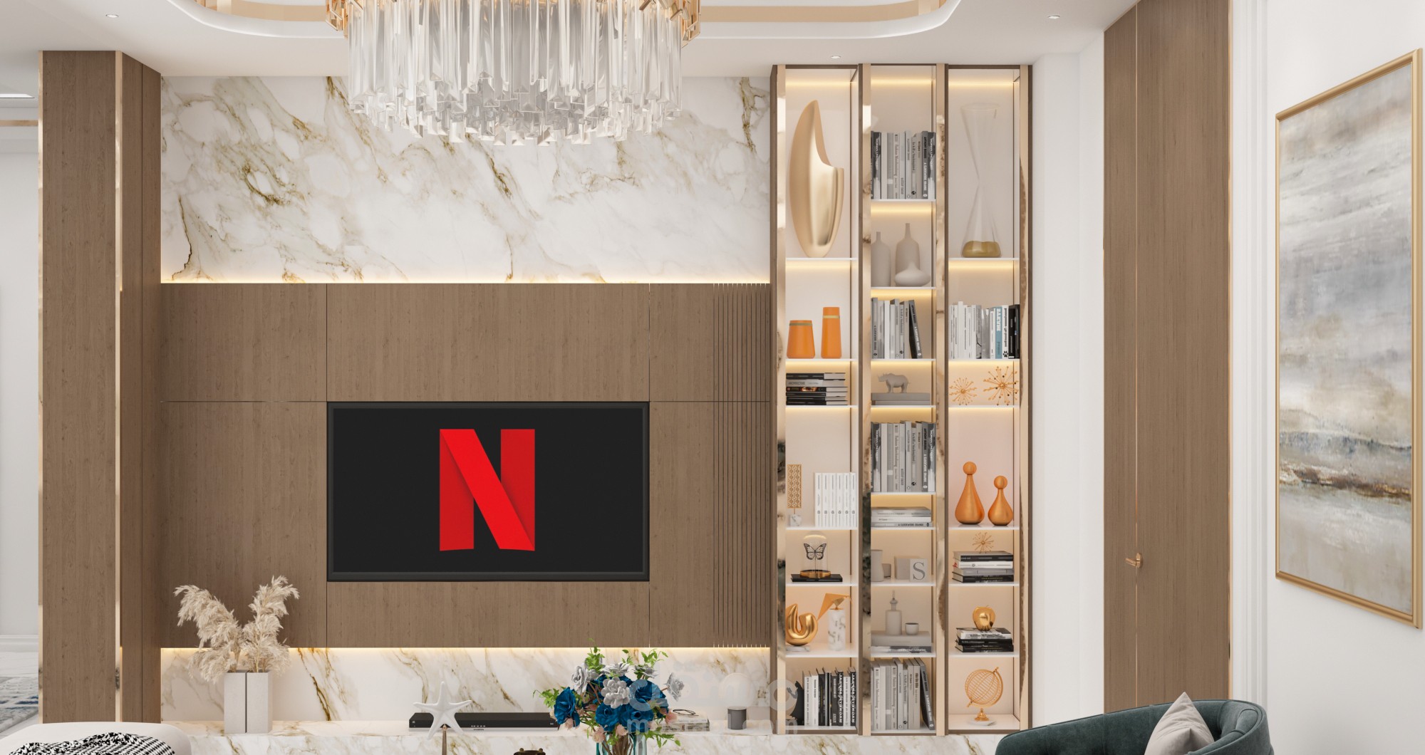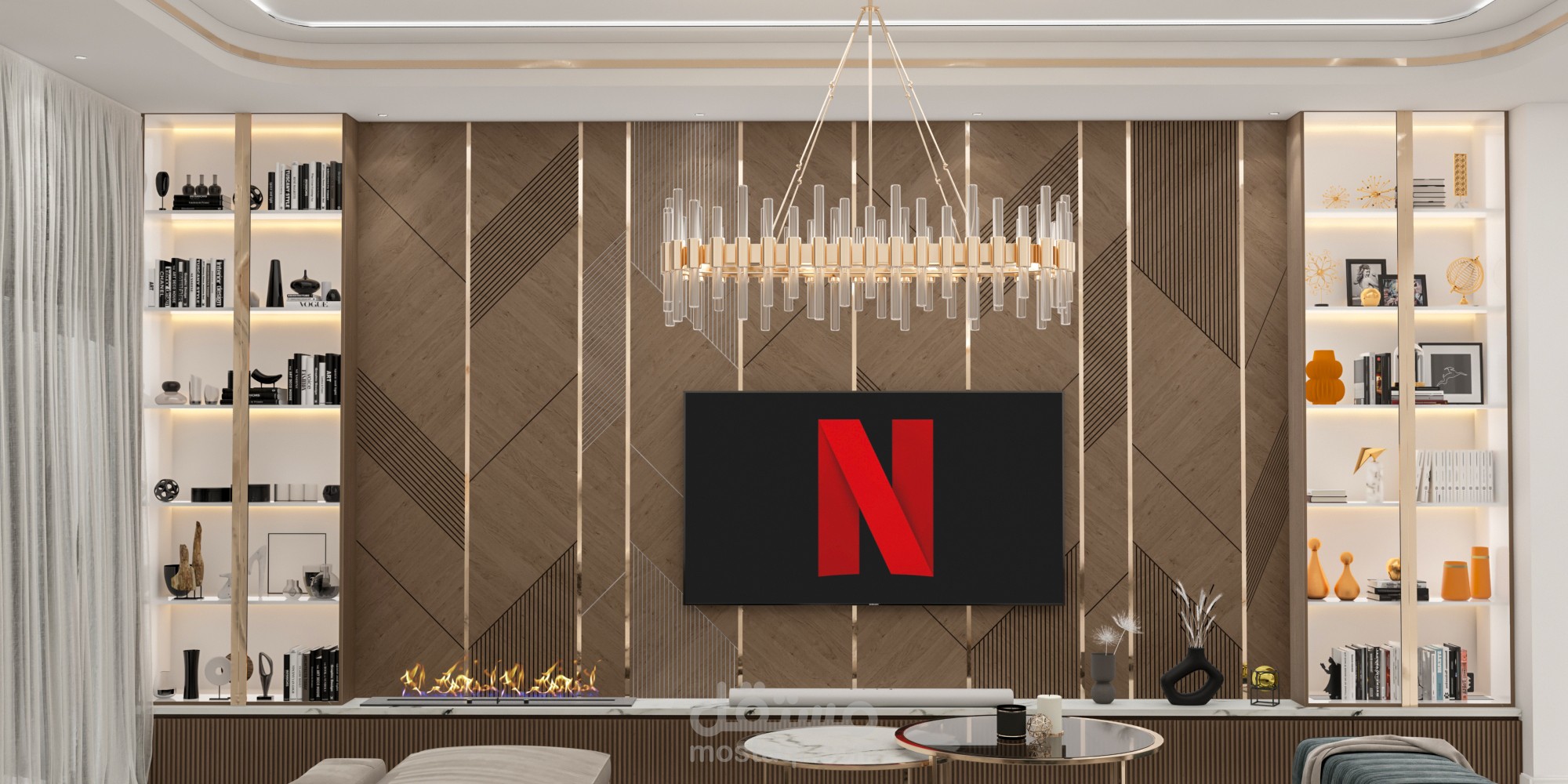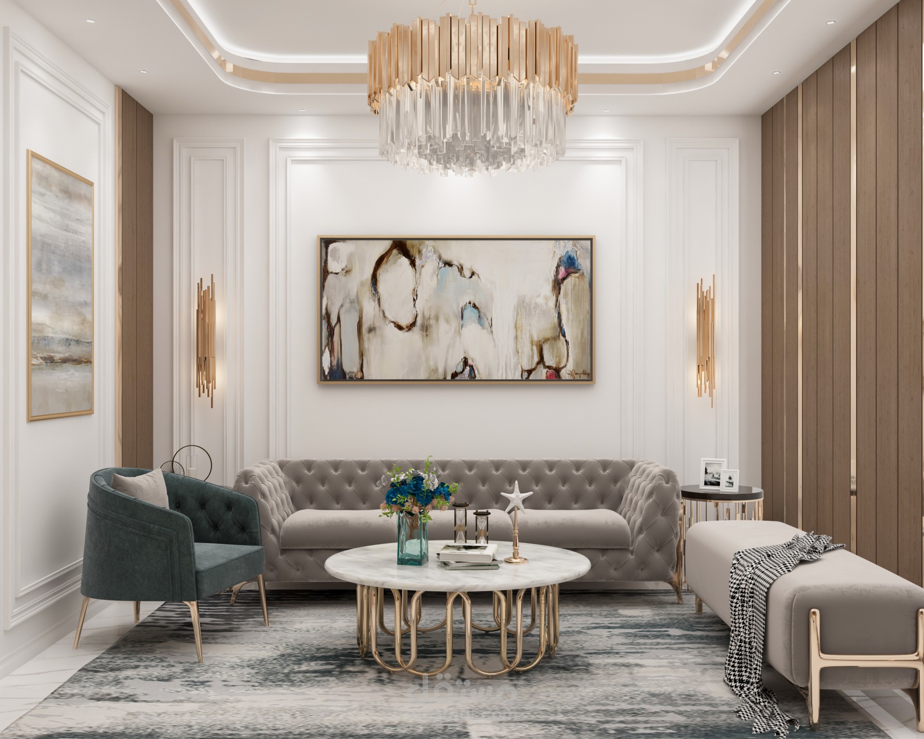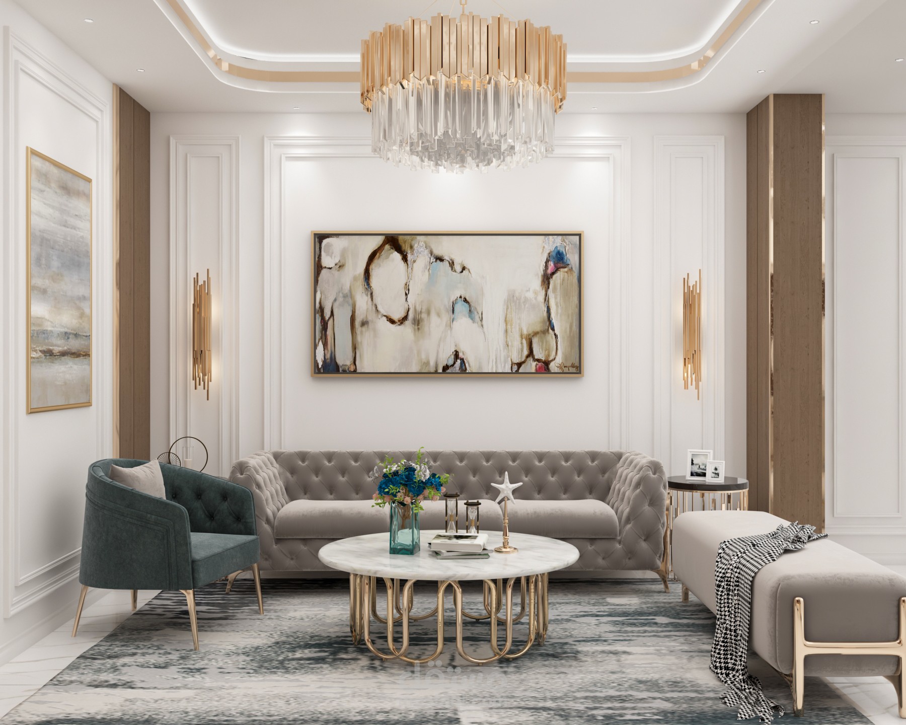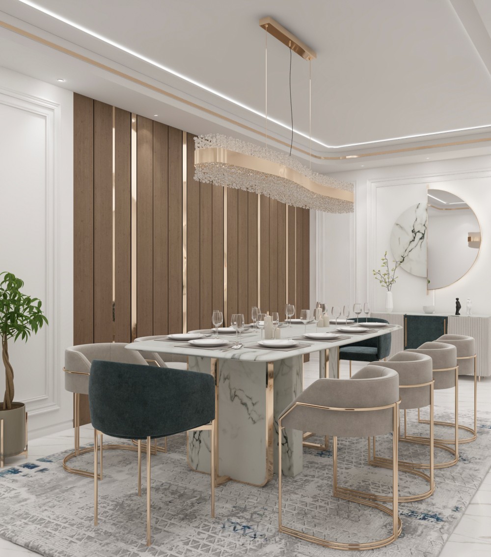 ثلاث فراغات ( صالون - غرفة طعام - معيشة ) تم التصميم على الأسلوب New classic وتم عمل بارتشن متحرك للصالون من اجل الخصوصية