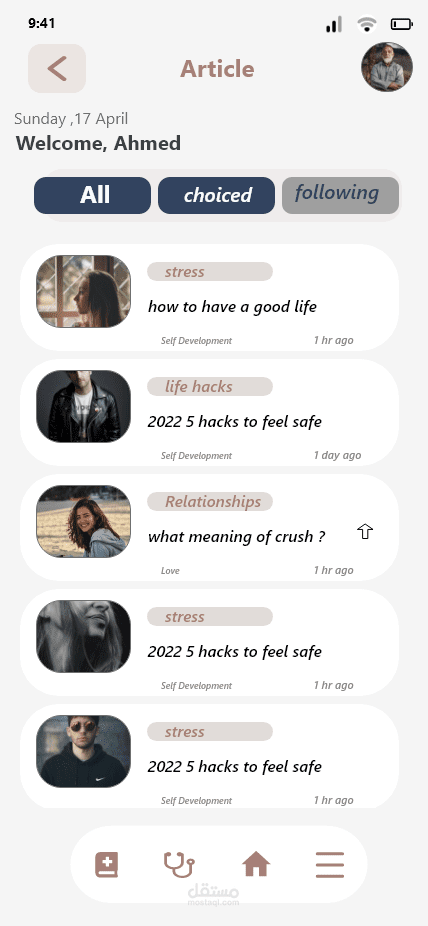 تطبيق عبارة عن حجز مواعيد مع الداكاترة المتاحين فى البرنامج ويوجد قسم خاص بالبودكاست لفهم الذات وكذلك قسم للكتب المتعلقة بالتنمية البشرية