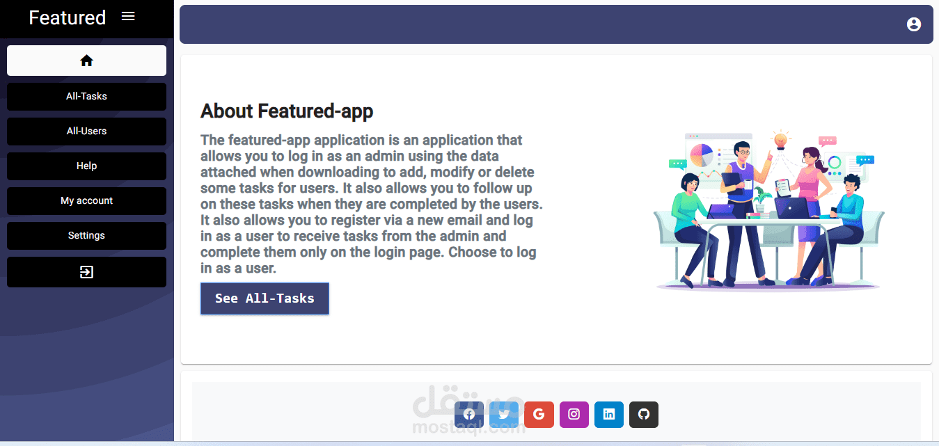 The featured-app application is an application that allows you to log in as an admin using the data attached when downloading to add, modify or delete some tasks for users. It also allows you to follow up on these tasks when they are completed by the users. It also allows you to register via a new email and log in as a user to receive tasks from the admin and complete them only on the login page. Choose to log in as a user.