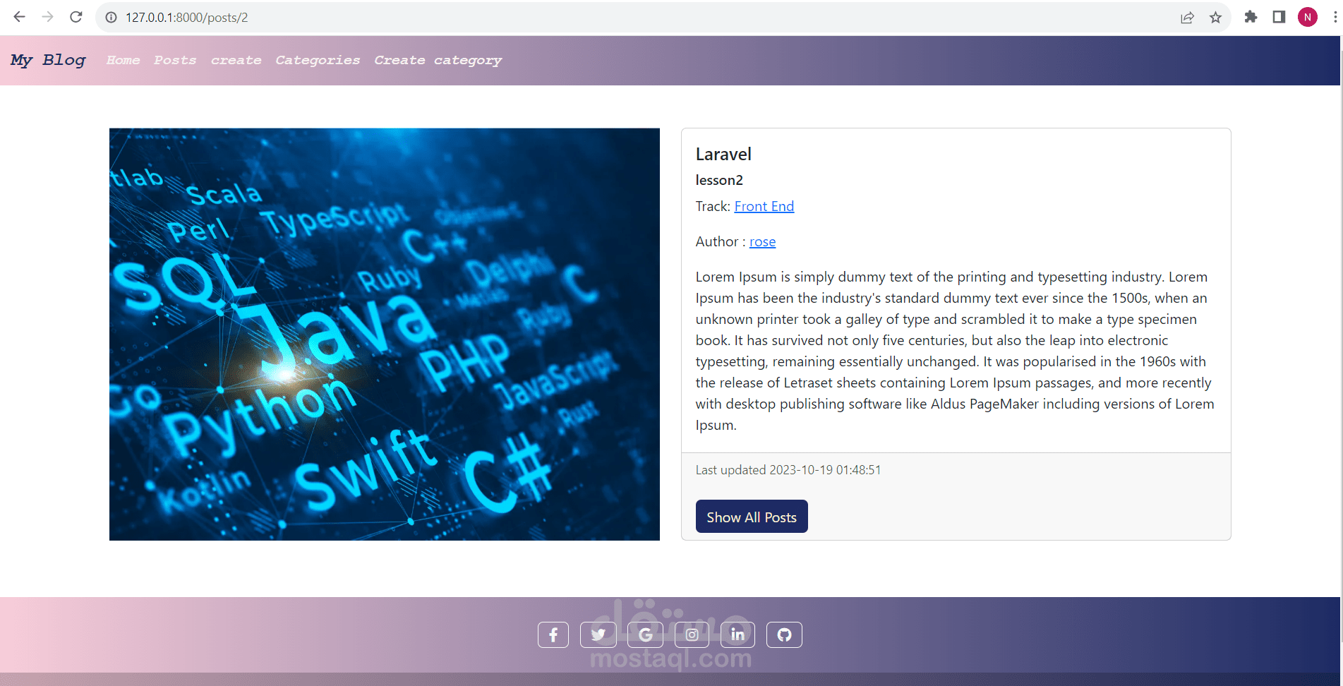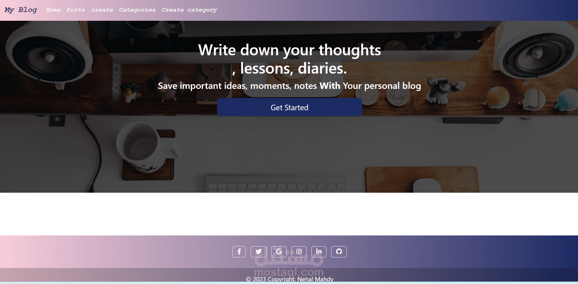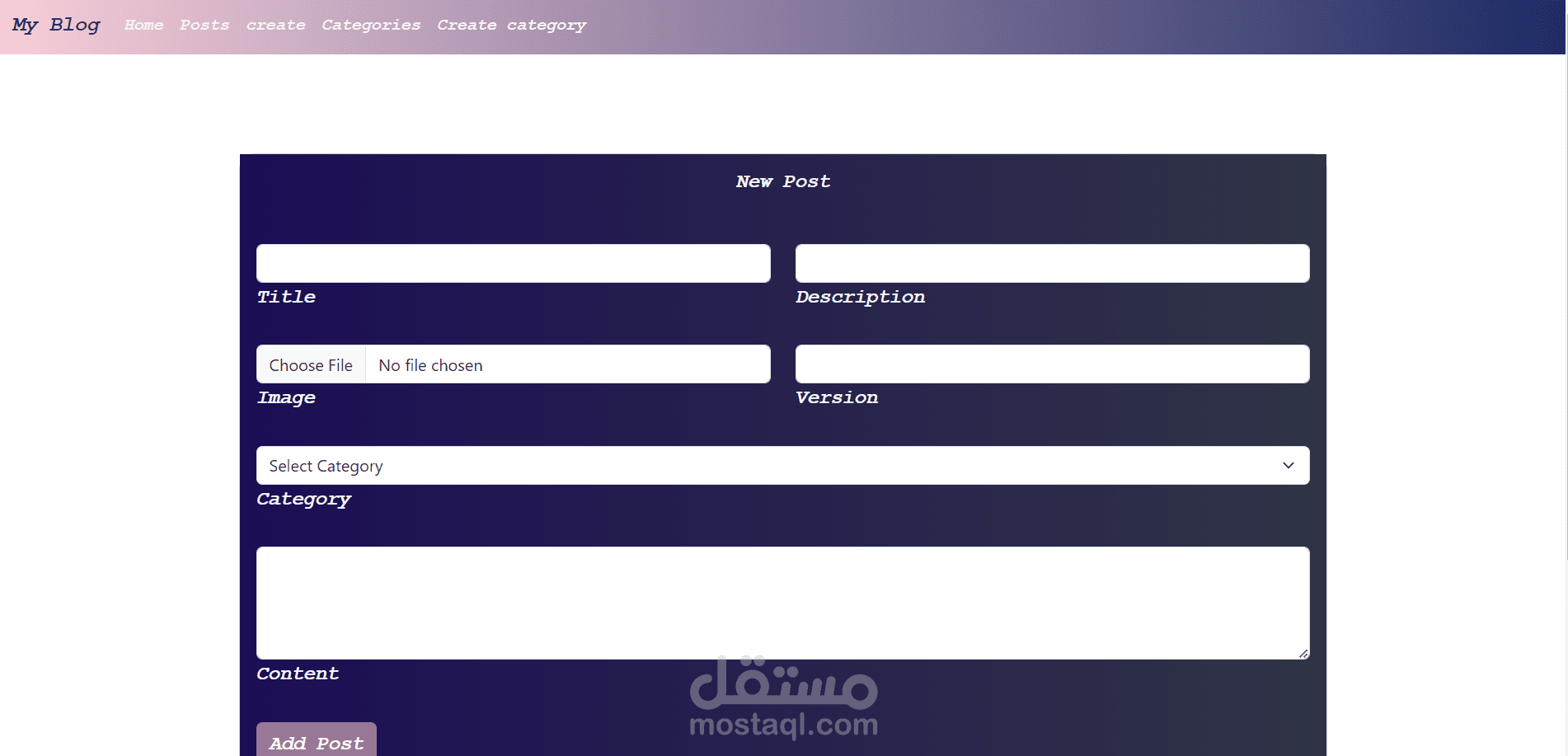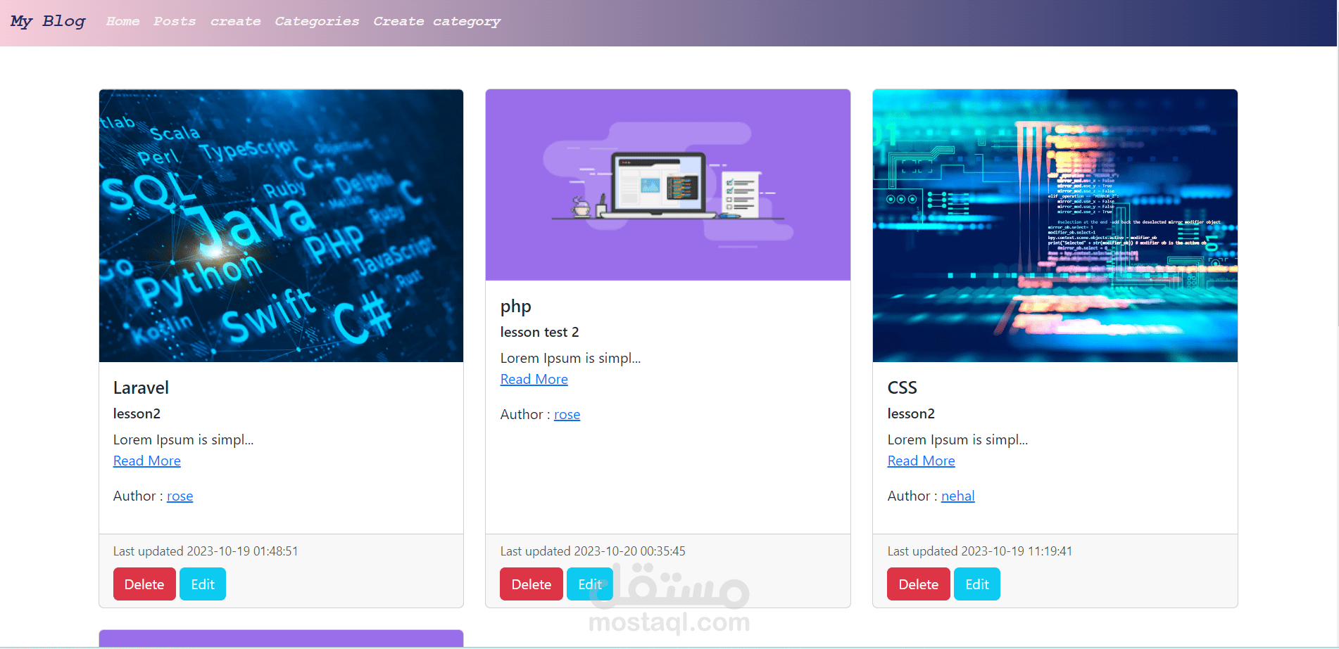 - في هذا المشروع بامكان المستخدم ان بقوم بتسجيل الحساب لاول مرة وبامكانه تسجيل الدخول كما بامكانه (حسب تمتعه بالصلاحية المحدده له) أن يقوم باضافة (posts) او تعديلها او حذفها وذلك اذا كان هو مؤلفها فقط اما ان لم يكن مؤلفها فليس بامكانه سوا قرائتها اما ان كان المستخدم (admin) ف بامكانه بالاضافة اللي صلاحية اضافة (posts) وتعديلها وحذفها حتى وان لم يكن مؤلفها و بامكانه ايضا (يتمتع وحده بتلك الصلاحية)تأليف (categories) وتعديلها وحذفها ويختار منها المستخدم العادي عندما يقوم بتأليف post خاص به.