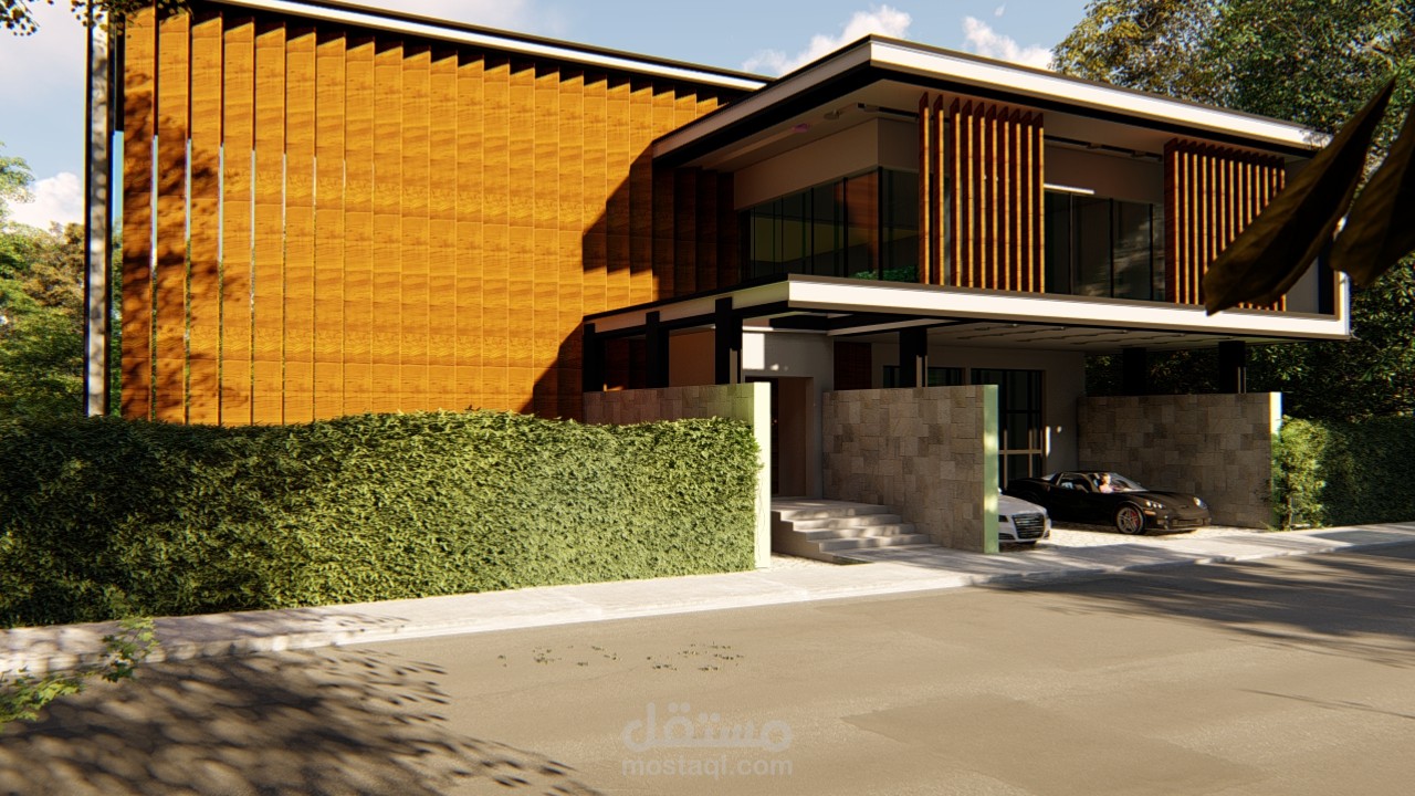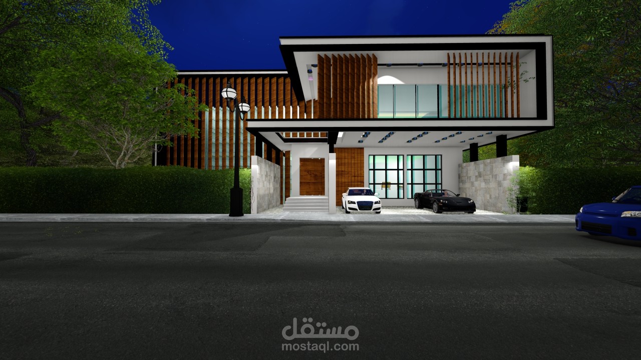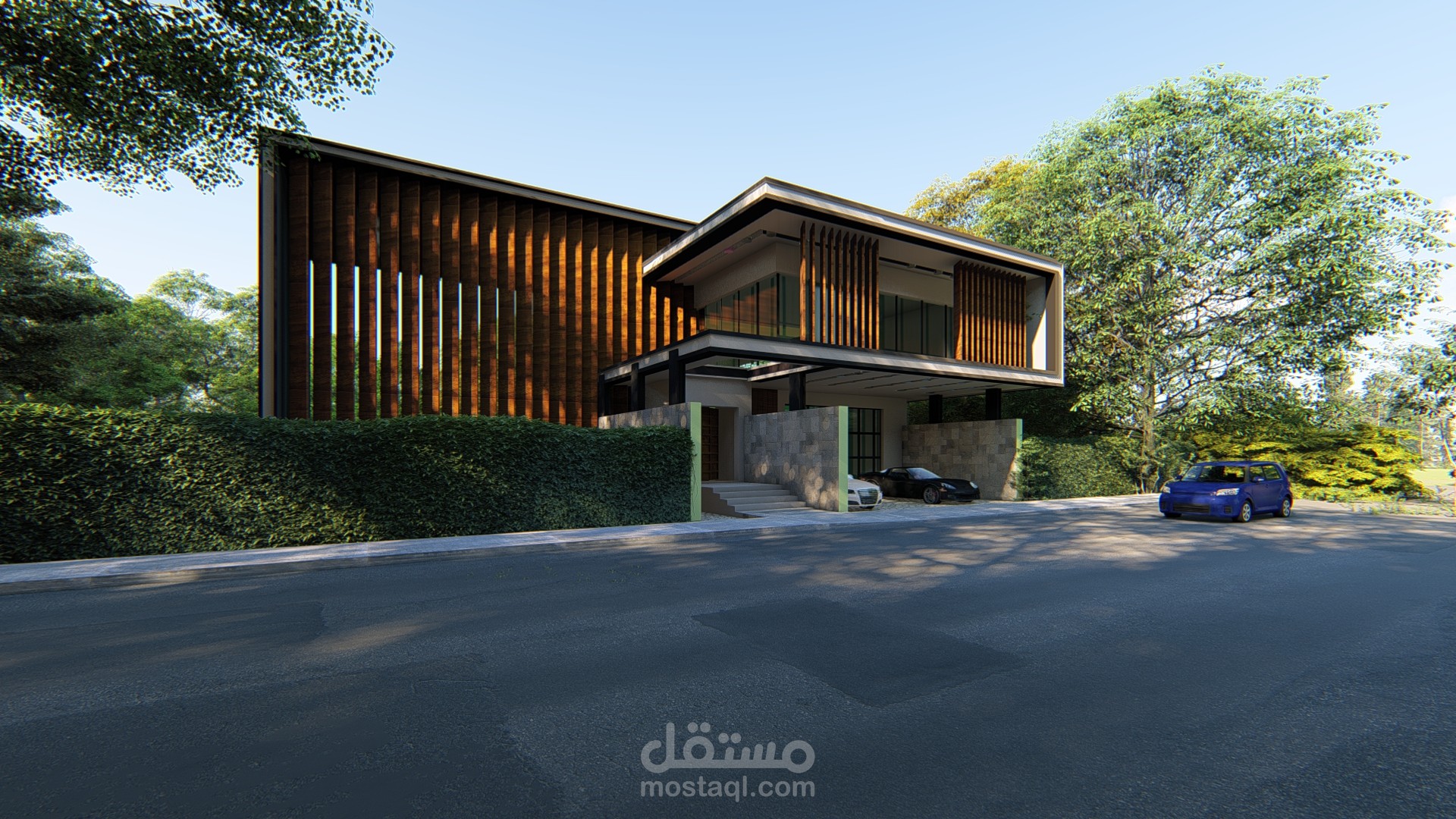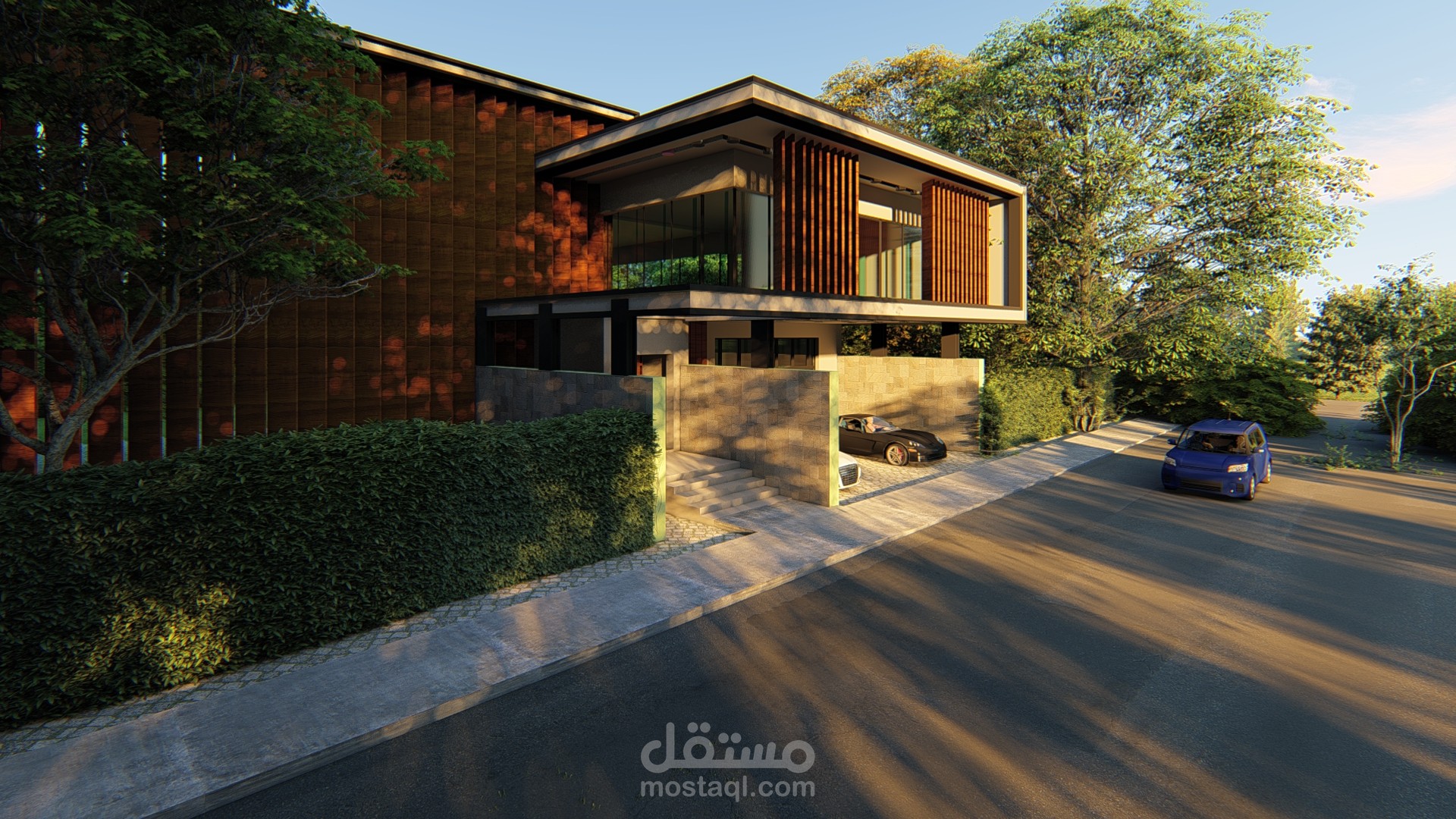 الطابق الأرضي مؤلف من صالتين للجلوس وحمام وقسم خدمي مؤلف من غرفة خادمة ومطبخ وغرفة غسيل وكوي