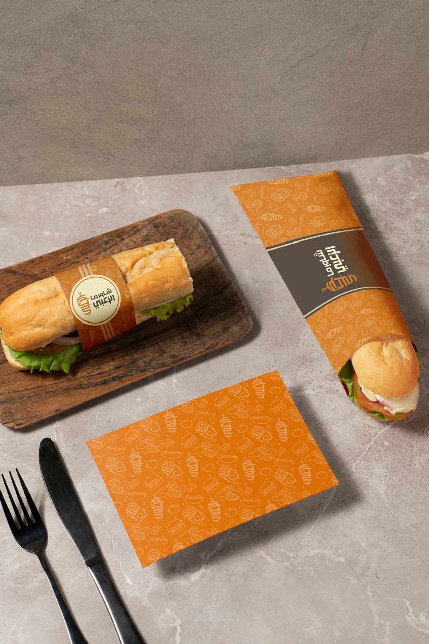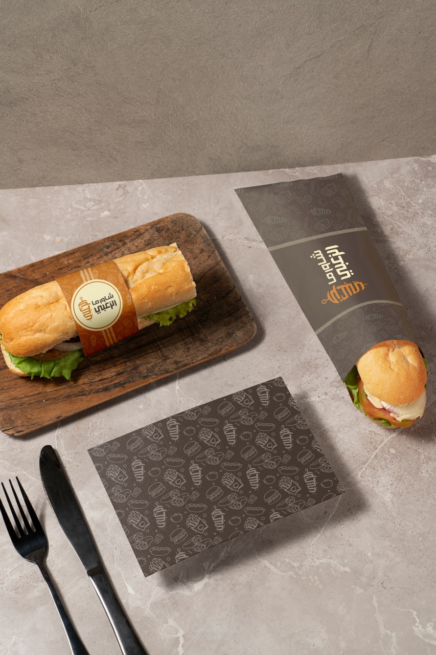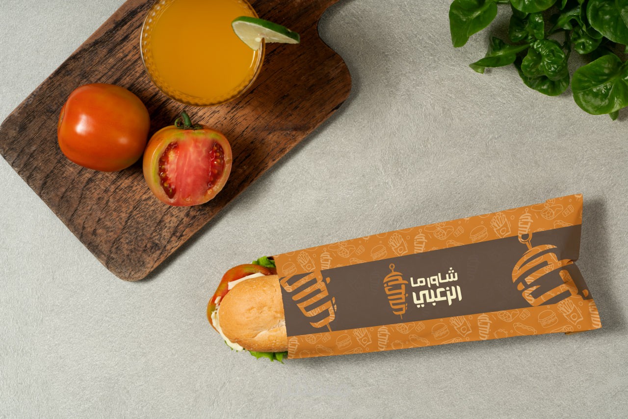علامة تجارية وهوية بصرية لمطعم شاورما تشمل الباكيجينج كامل لعلب الطعام واغلفة السندوتشات وغيرها من المطبوعات الورقية