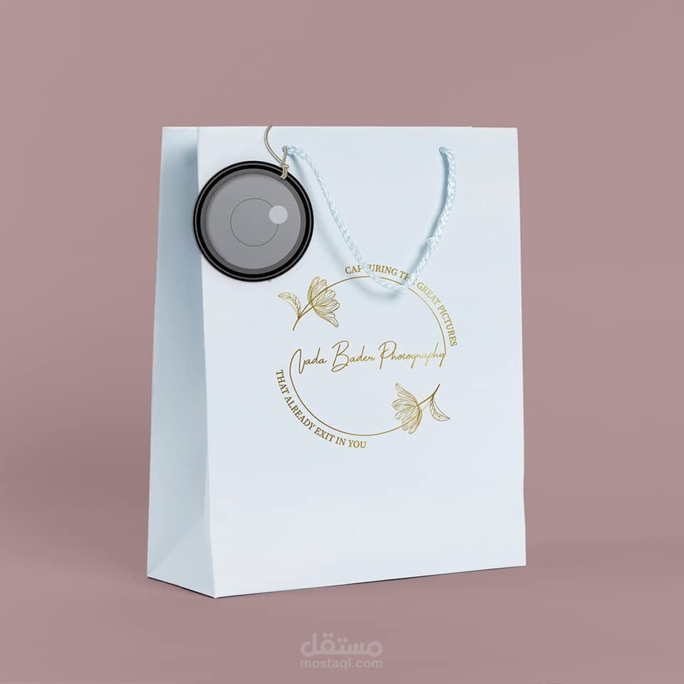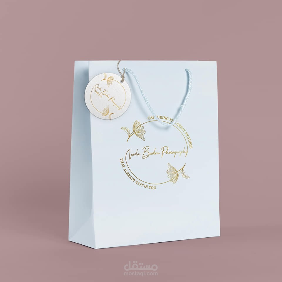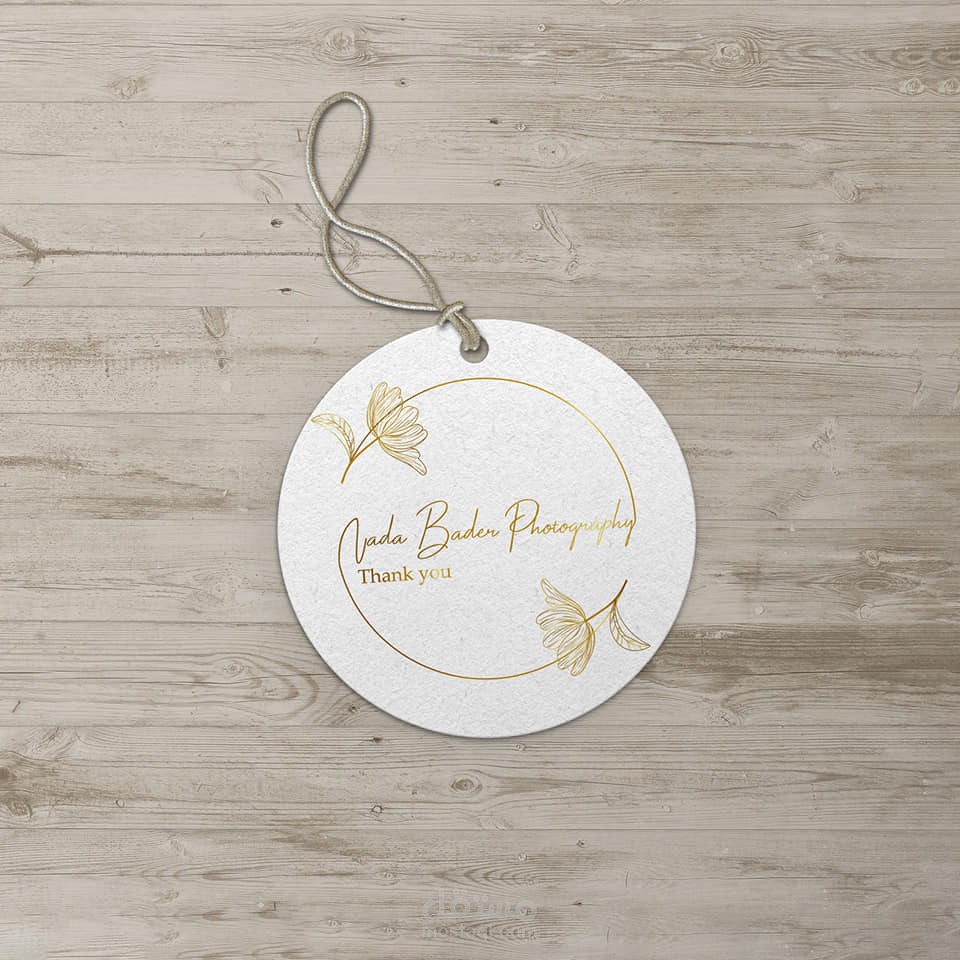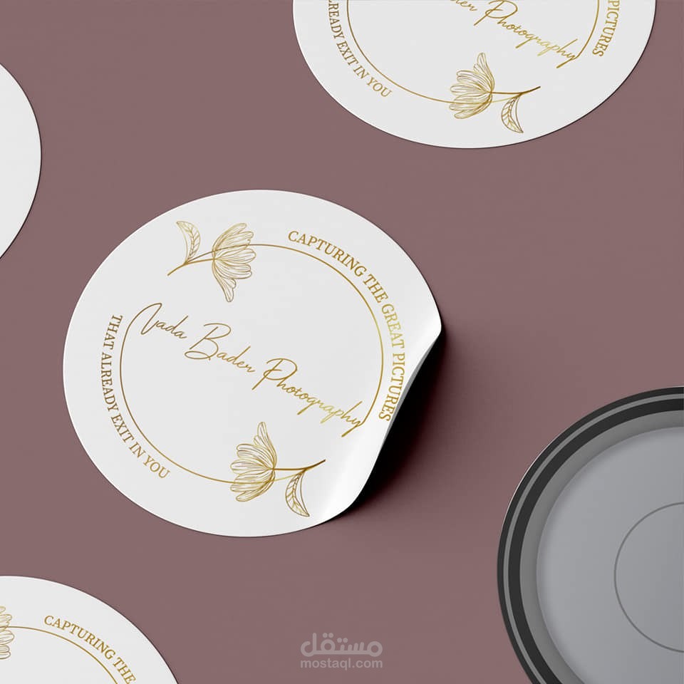 كما صممت ملصق للأكياس والألبومات بلون ذهبي متناسب مع لون الكرت والمكان بشكل عام