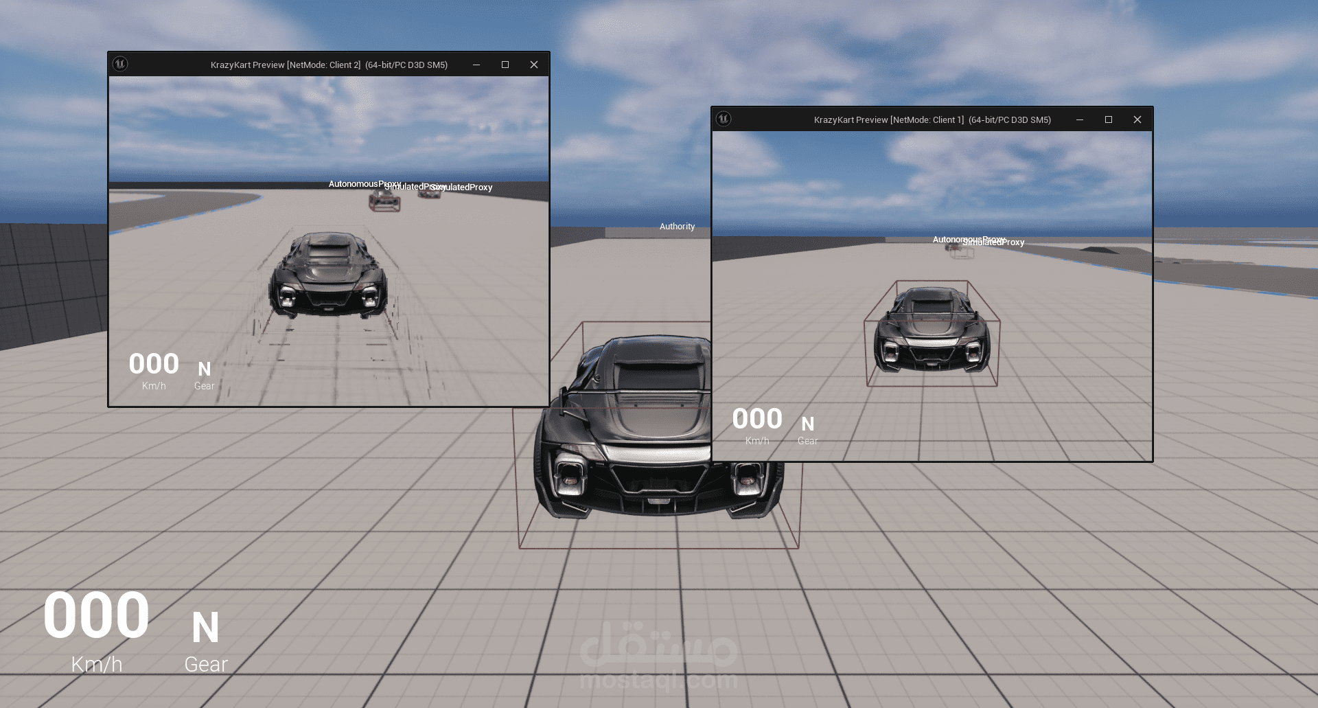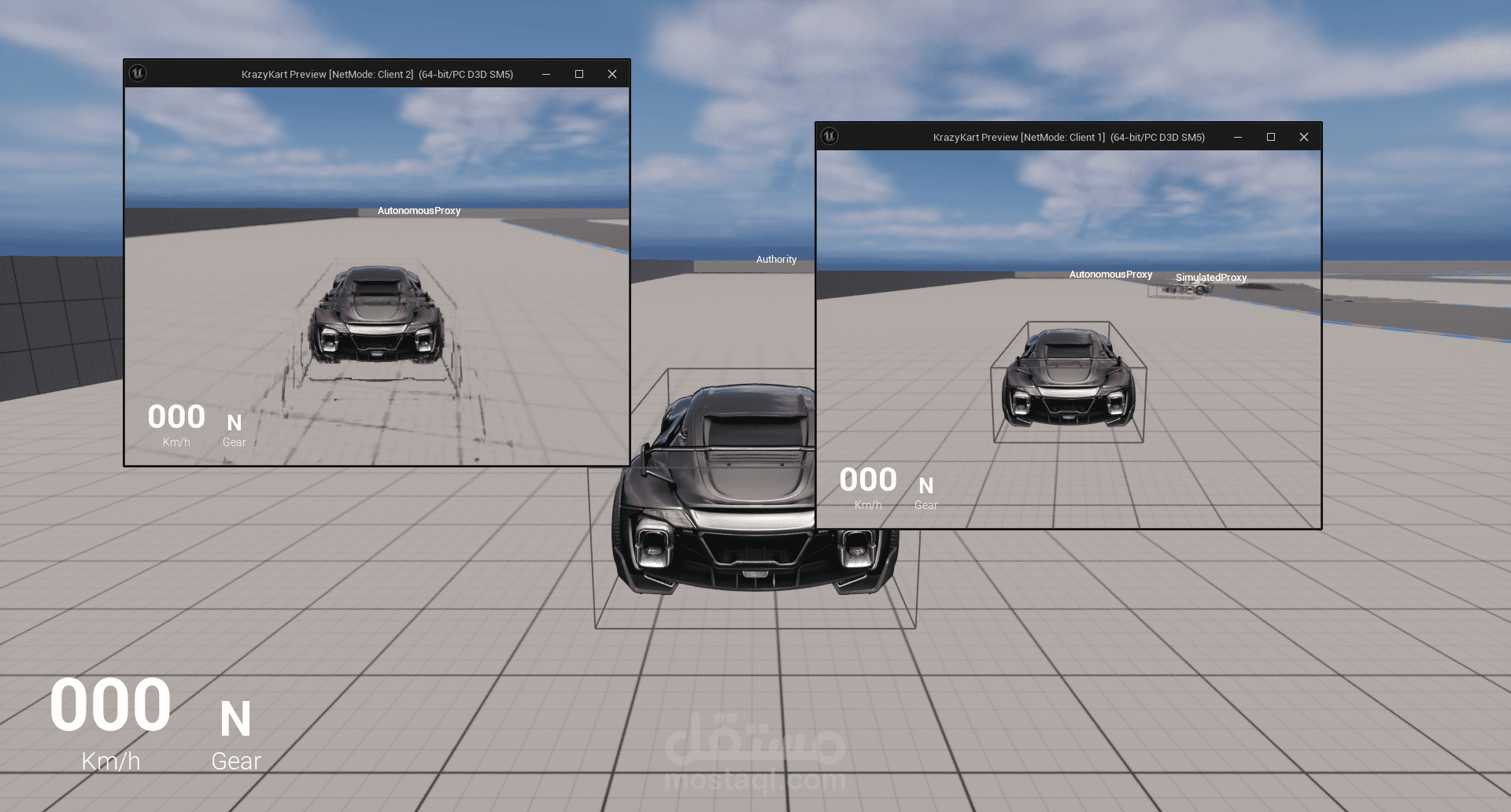 لعبة كانت عبارة عن إنجاز مكونات لعبة سباق سيارات عبر الشبكة و جعل الملفات البرمجية الخاصة بعنصر الشبكة كعنصر يمكن إزالته وتركيبه بسلاسة وبدون أي اعتمادية عليه في الكود الأساسي للعبة بمعنى اذا تم إزالة هذا العنصر تعمل اللعبة كلعبة لاعب واحد بدون مشاكل , تم في هذا المشروع إنجاز نظام فيزيائي بسيط للسيارة عوضا عن استخدام الكود الجاهز في المحرك للتحكم بمستوى أعلى في البيانات التي يتم نقلها عبر الشبكة وجعل المكون الحركي لفيزيائية السيارة أيضا Component منفصل يمكن إزالته وتركيبه . ومن أبرز المواضيع من المنجزة هو Unreal Engine Replication System وهو النظام الخاص بالشبكة الذي يتناقل البيانات بين السيرفر والزبائن وتم معالجة أمور تأخير التحديثات بشكل جدا مرن حيث حتى وإن وصل التأخير في الشبكة إلى ثانية كاملة بالإضافة إلى كون السيرفر لا يحدث إلى مرة واحدة كل ثانية تكون الصورة المدركة للاعبين الآخرين على شاشة أحد اللاعبين سلسة بشكل جدا ممتاز حيث تم استخدام تقنية Hermite Cubic Interpolation وهي عملية رياضية تستطيع توقع حركة الغرض بين تحديثات السيرفر بشكل قريب لحدوثها على السيرفر . وتم معالجة الكثير من الأمور الأخرى كجعل السيرفر بتعديل مكان السيارة التي يتحكم بها أحد اللاعبين بشكل يجعل اللاعب يشعر بتأخير(حيث أن السيرفر يكون له كلمة الفصل في مكان الأغراض في اللعبة وكونه يعاني من تأخير وقلة التحديثات فسيحاول تحديث مكان اللاعب على شاشته إلى نقطة سابقة للموقع الذي وصله ) وهذا الأمر تم معالجته بعدم تمكين السيرفر من تعديل مكان اللاعب وإنما إعادة محاكاة النقطة التي وصل إليها اللاعب عند السيرفر للتأكد من صحة خطواته ووجود بصمة زمنية لكل خطوة يقوم بها اللاعب ويرسلها للسيرفر.