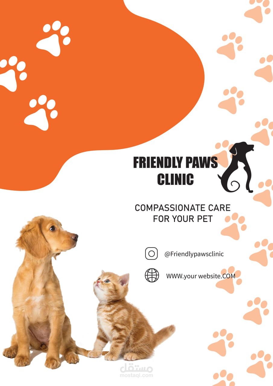 The clinic name surrounds the logo in paw shaped outline , using eye catching colors and typography.