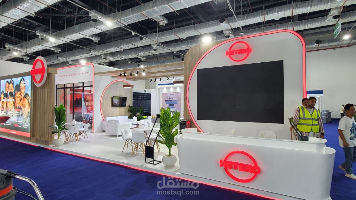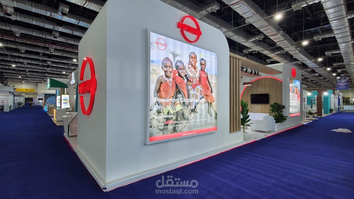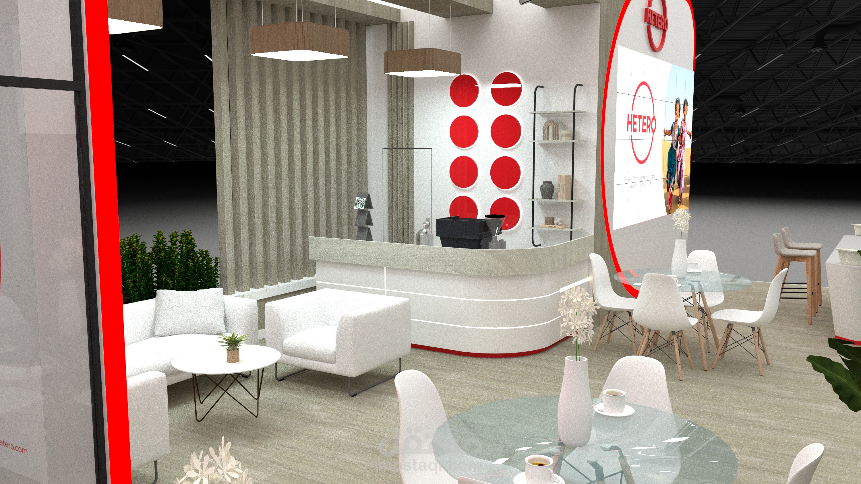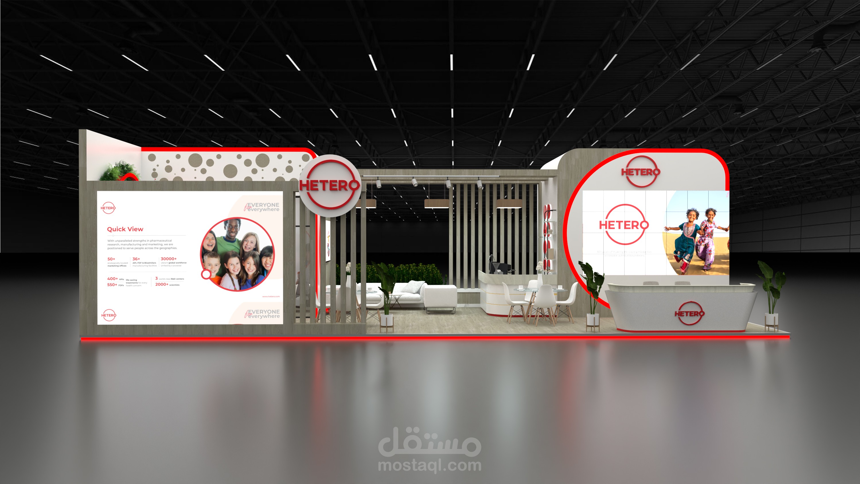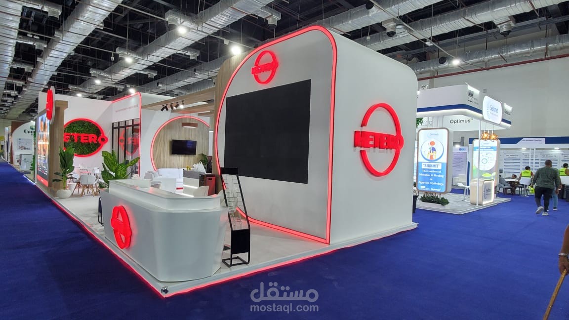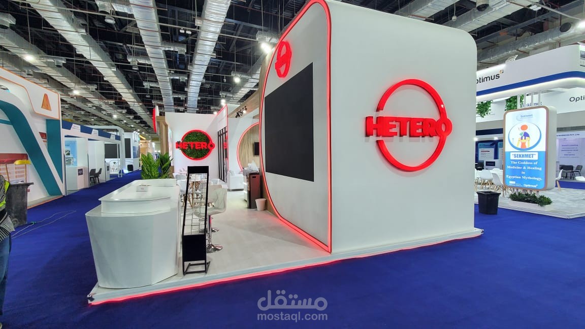 مفهوم التصميم: "ربط الاحترافية بالتواصل الإنساني". يرتكز تصميم جناح معرض صيدلية هيتيرو على مفهوم "ربط الاحترافية بالتواصل الإنساني". ويهدف إلى خلق مساحة ديناميكية تعكس في آنٍ واحد موثوقية العلامة التجارية، ودقتها العلمية، والتزامها الراسخ برفاهية الإنسان. من خلال مزج الخطوط الأنيقة والعصرية مع عناصر دافئة وجذابة، ودمج شاشات رقمية متطورة، يُجسّد الجناح ثلاثي الأبعاد وعد علامة هيتيرو التجارية: ابتكار دوائي موثوق يُؤثر على الحياة الواقعية. ? وصف مفصل: يتميز هذا الجناح المُصمم خصيصًا لصيدلية هيتيرو بجماليات عصرية ومنحنيات لتعزيز التأثير البصري وانسيابية الحضور داخل قاعة المعرض. الميزات الرئيسية: تصميم هندسي منحني ولوحة ألوان مميزة للعلامة التجارية: يستخدم الهيكل منحنيات سلسة وواسعة تُحددها إضاءة حمراء جريئة.