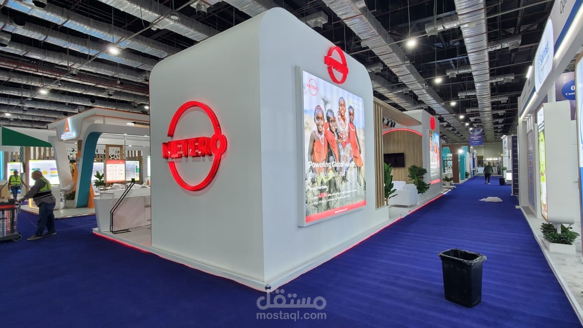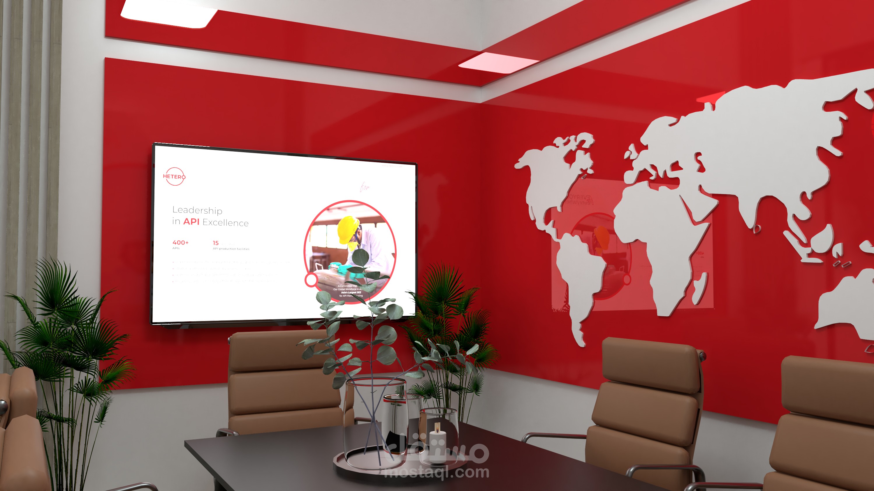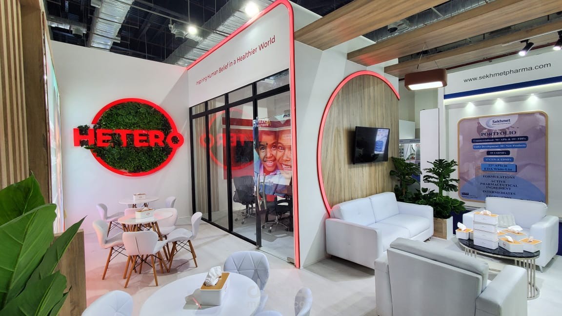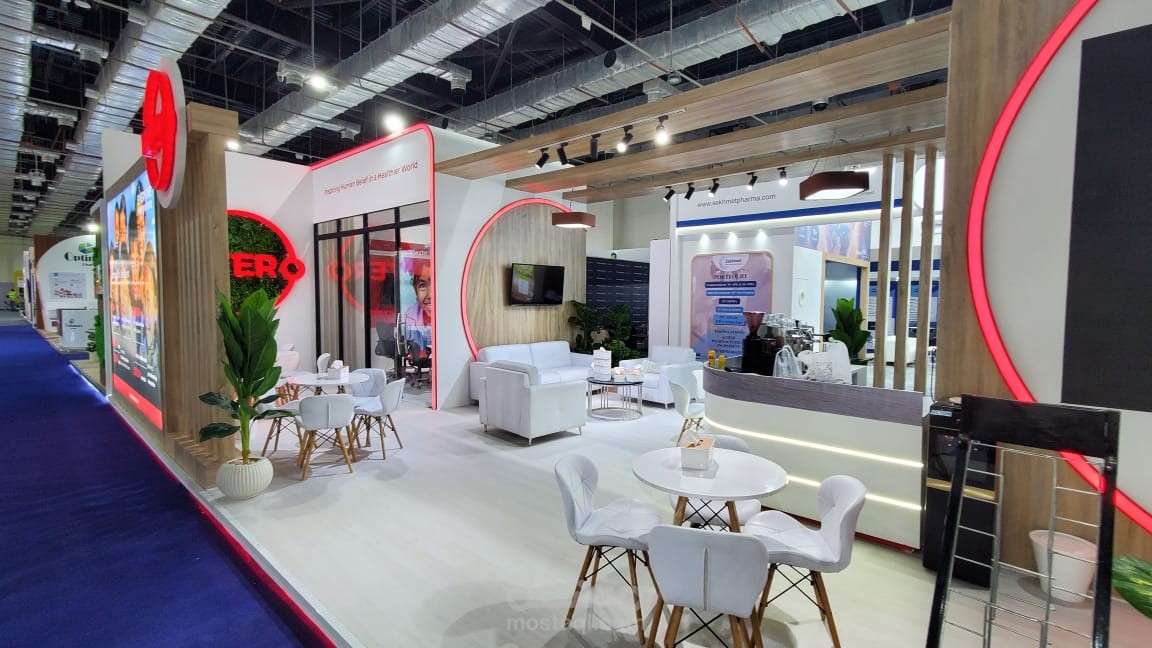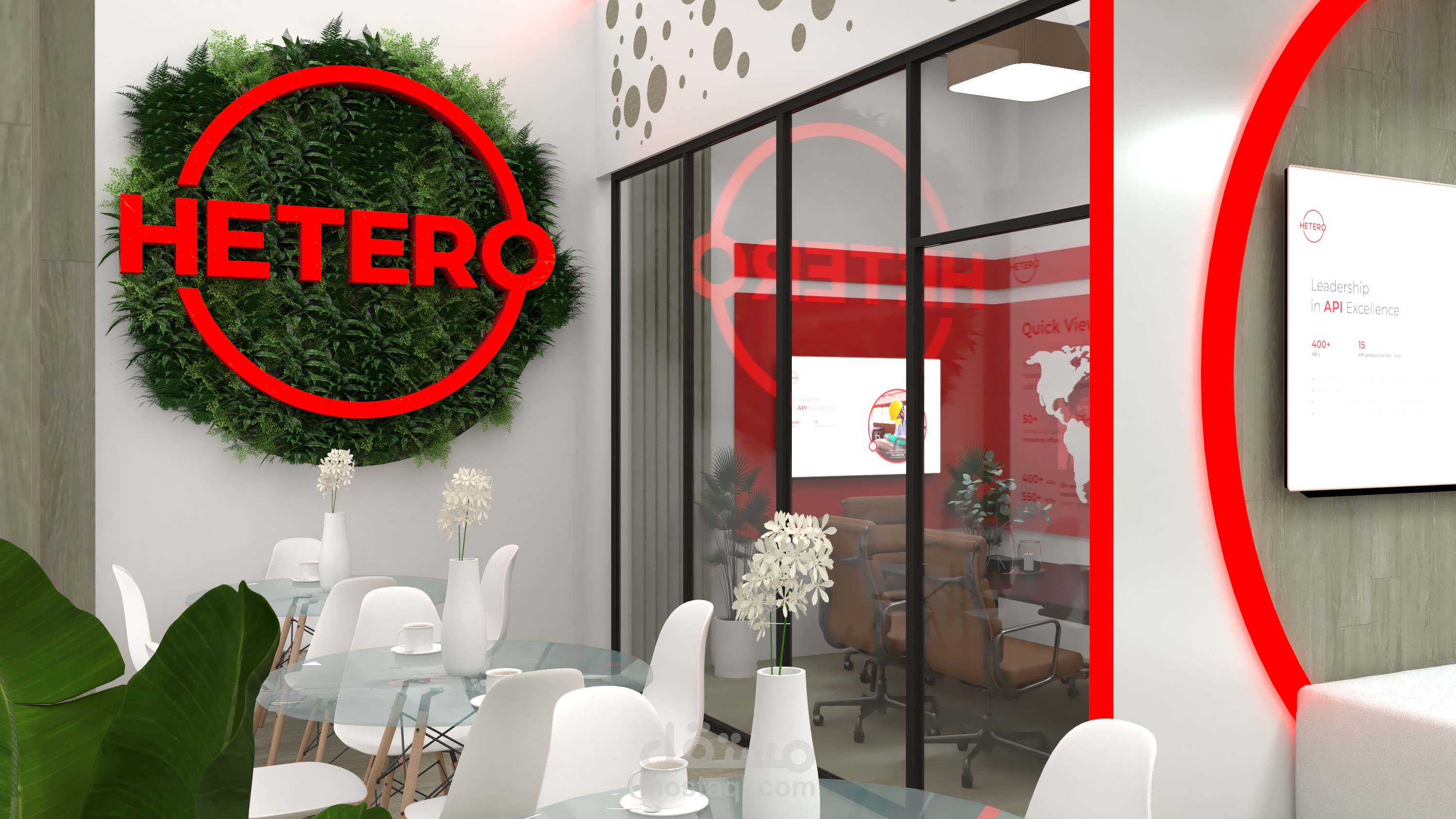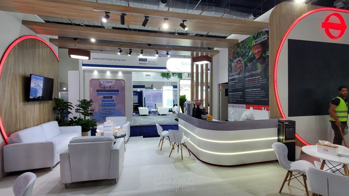 مفهوم التصميم: "ربط الاحترافية بالتواصل الإنساني". يرتكز تصميم جناح معرض صيدلية هيتيرو على مفهوم "ربط الاحترافية بالتواصل الإنساني". ويهدف إلى خلق مساحة ديناميكية تعكس في آنٍ واحد موثوقية العلامة التجارية، ودقتها العلمية، والتزامها الراسخ برفاهية الإنسان. من خلال مزج الخطوط الأنيقة والعصرية مع عناصر دافئة وجذابة، ودمج شاشات رقمية متطورة، يُجسّد الجناح ثلاثي الأبعاد وعد علامة هيتيرو التجارية: ابتكار دوائي موثوق يُؤثر على الحياة الواقعية. ? وصف مفصل: يتميز هذا الجناح المُصمم خصيصًا لصيدلية هيتيرو بجماليات عصرية ومنحنيات لتعزيز التأثير البصري وانسيابية الحضور داخل قاعة المعرض. الميزات الرئيسية: تصميم هندسي منحني ولوحة ألوان مميزة للعلامة التجارية: يستخدم الهيكل منحنيات سلسة وواسعة تُحددها إضاءة حمراء جريئة.