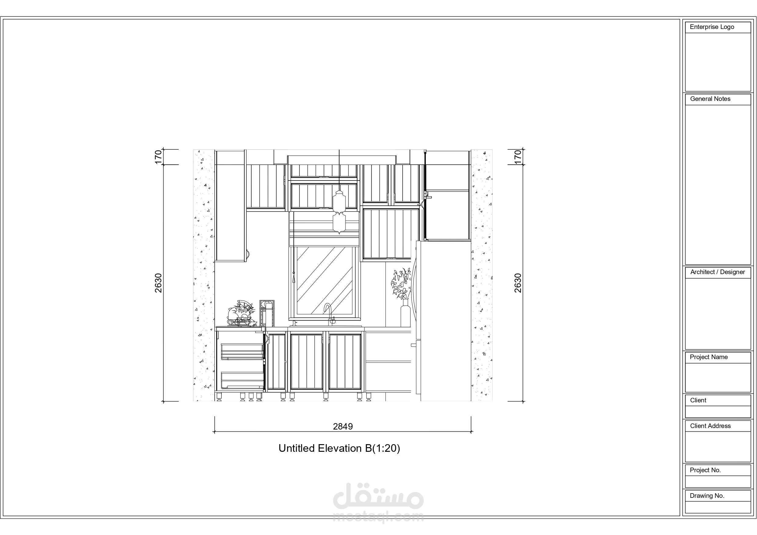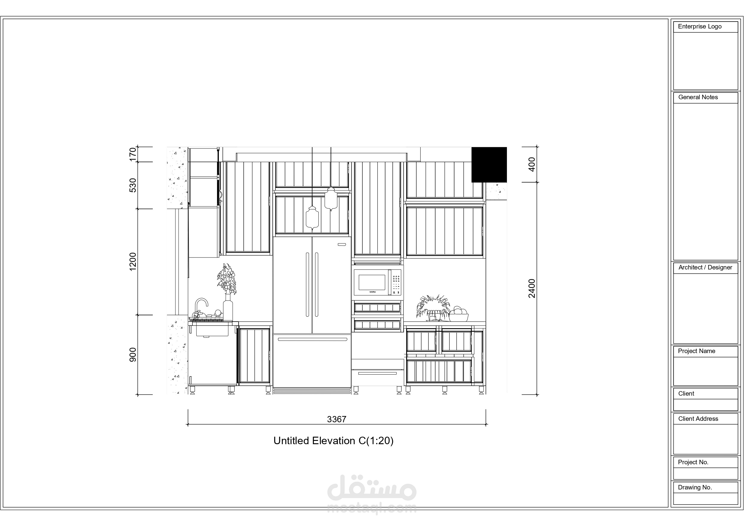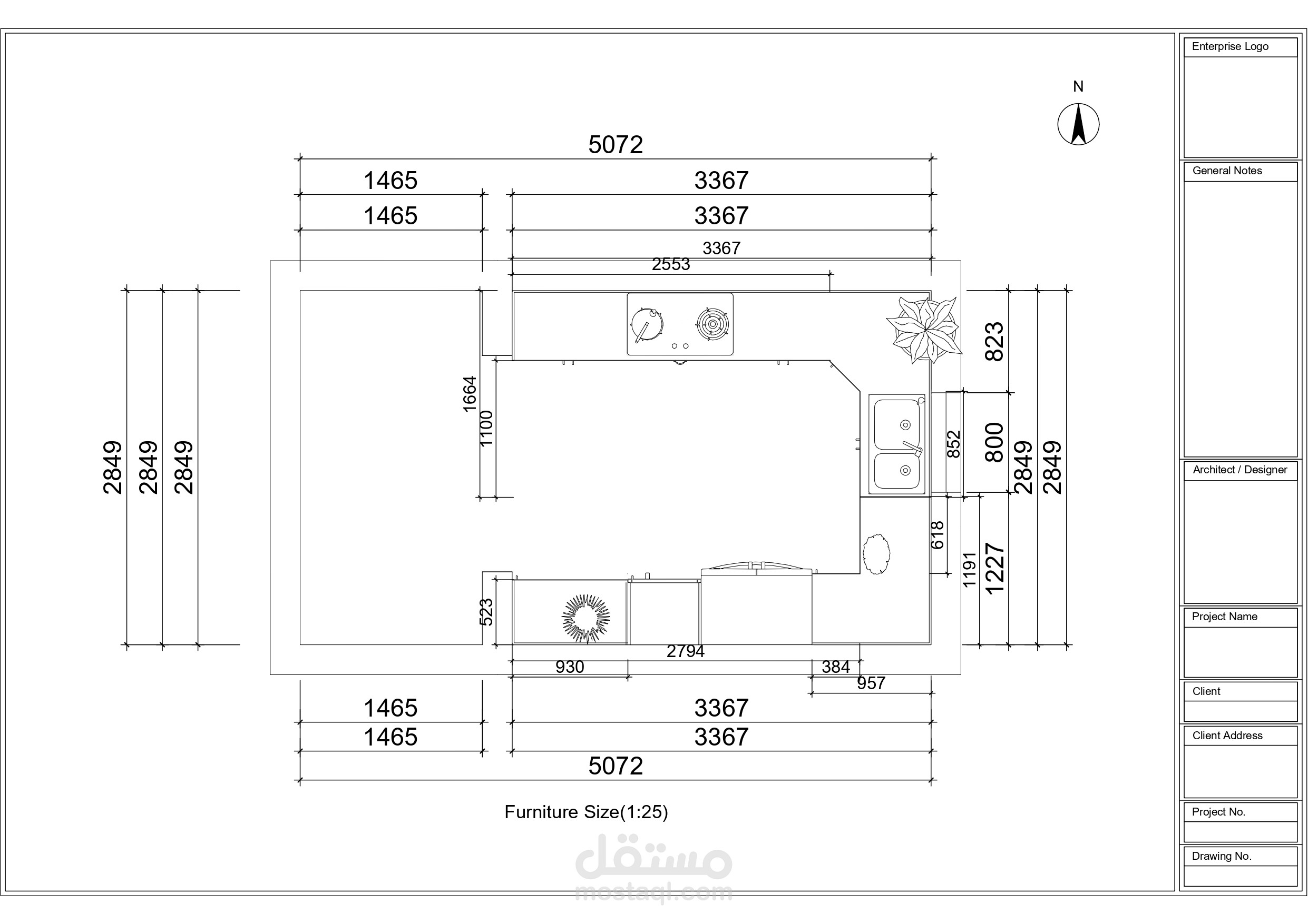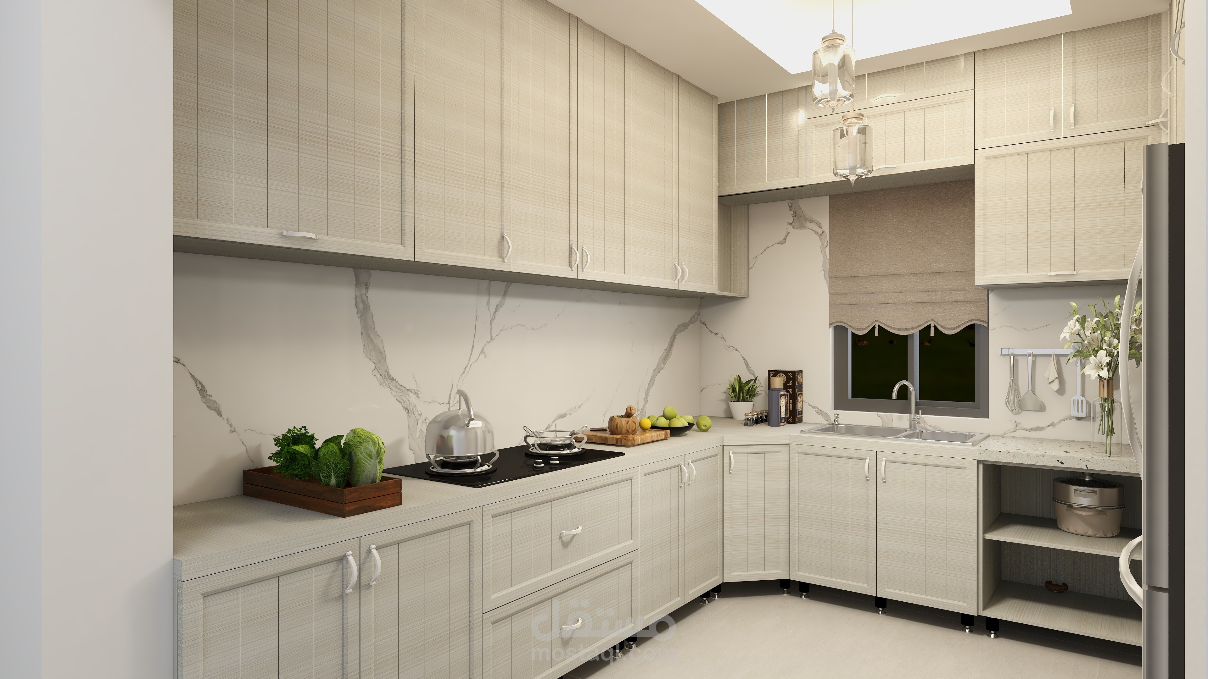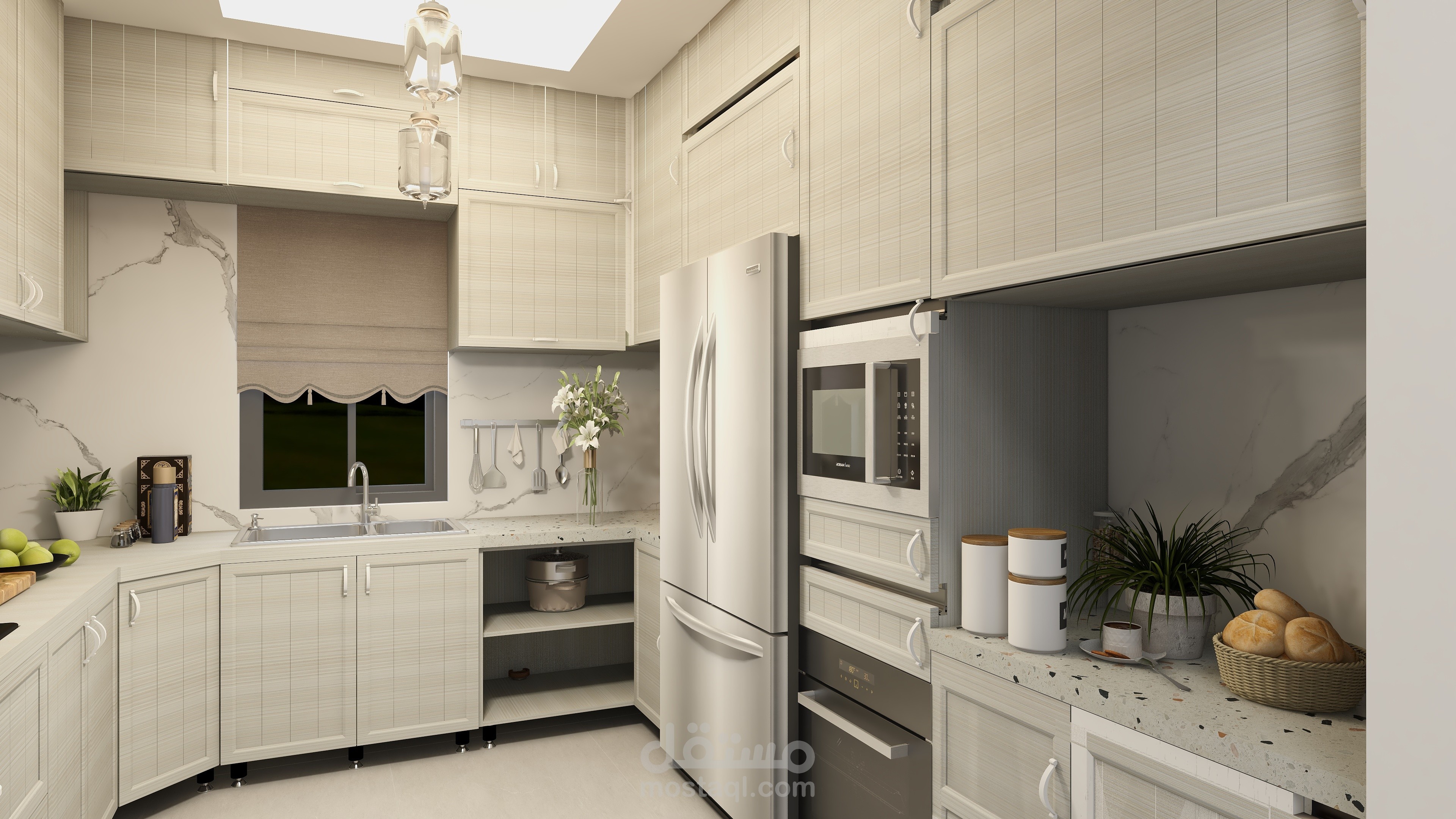 تصميم مطبخ بسيط هاءئ يحتوي علي مايتطلبه المطبخ من اجهزه ووحدات