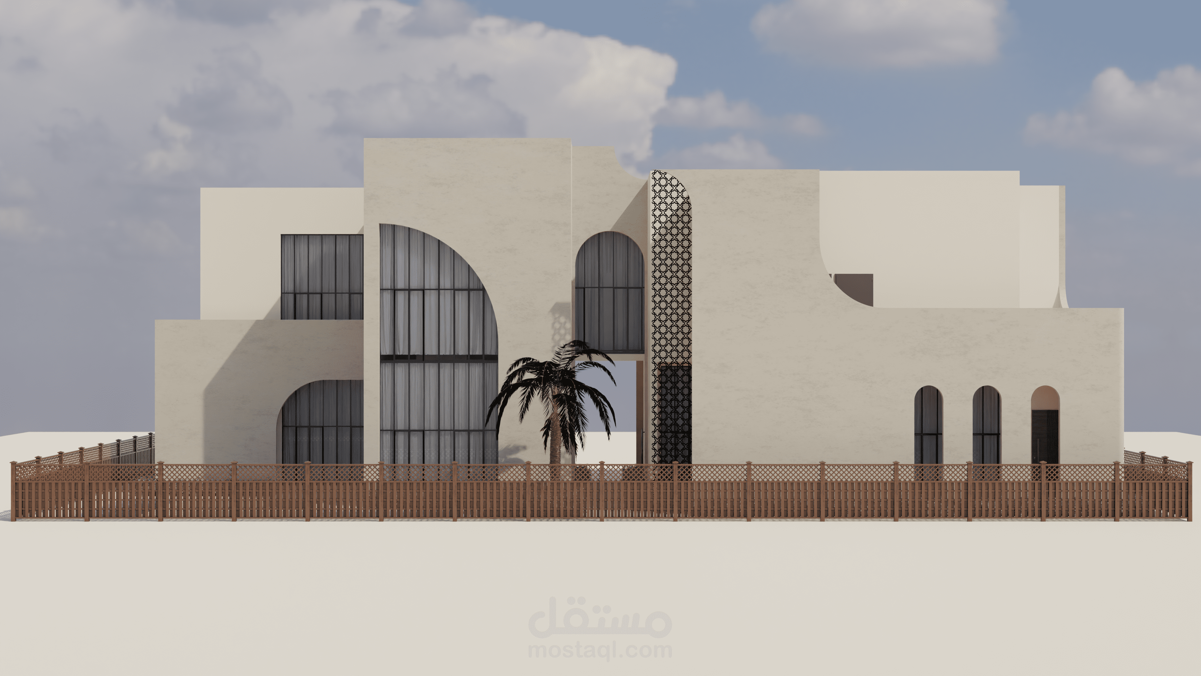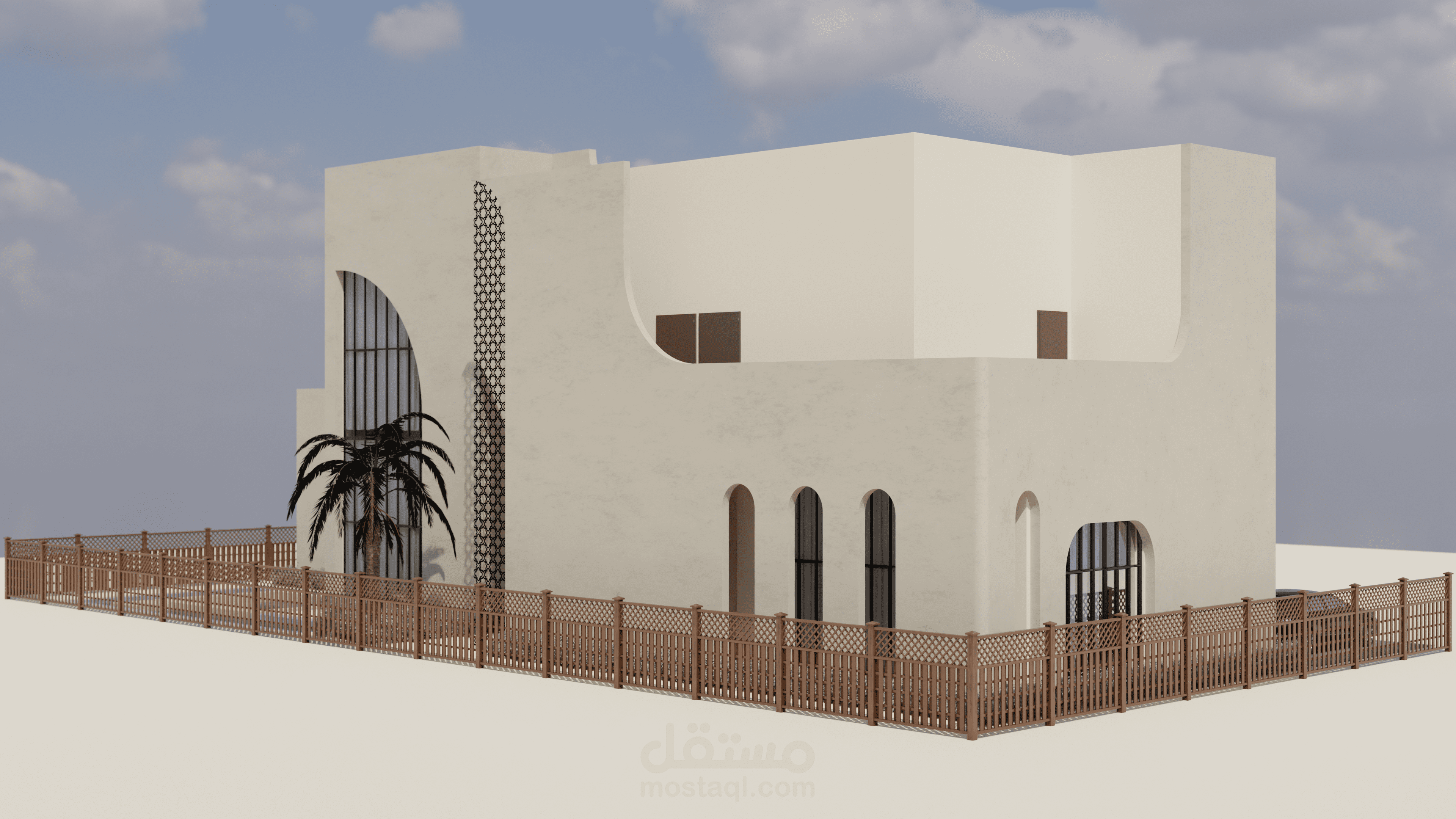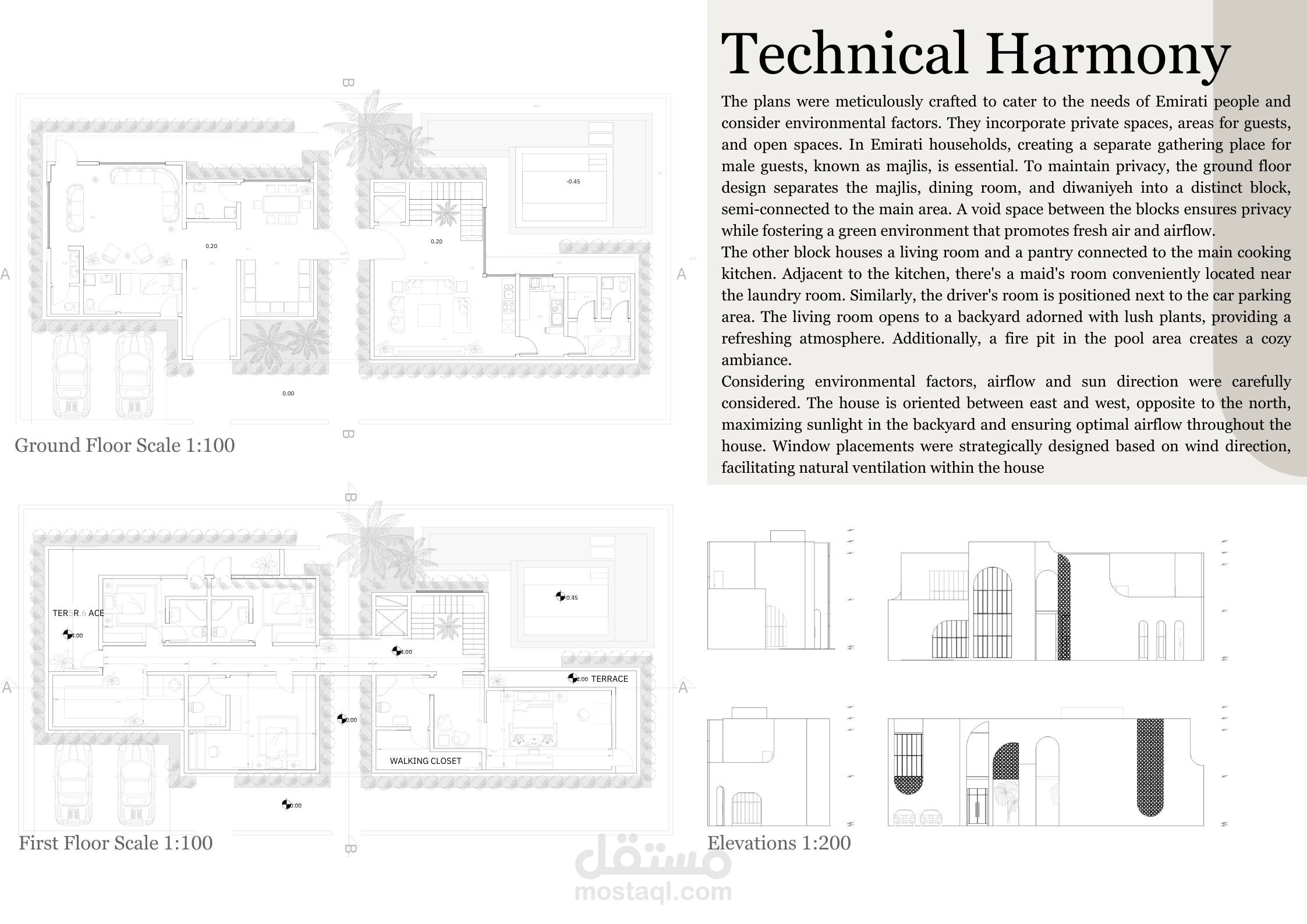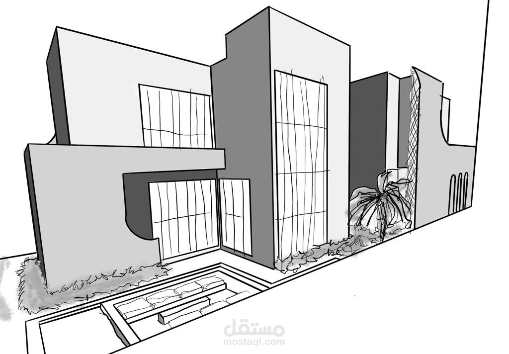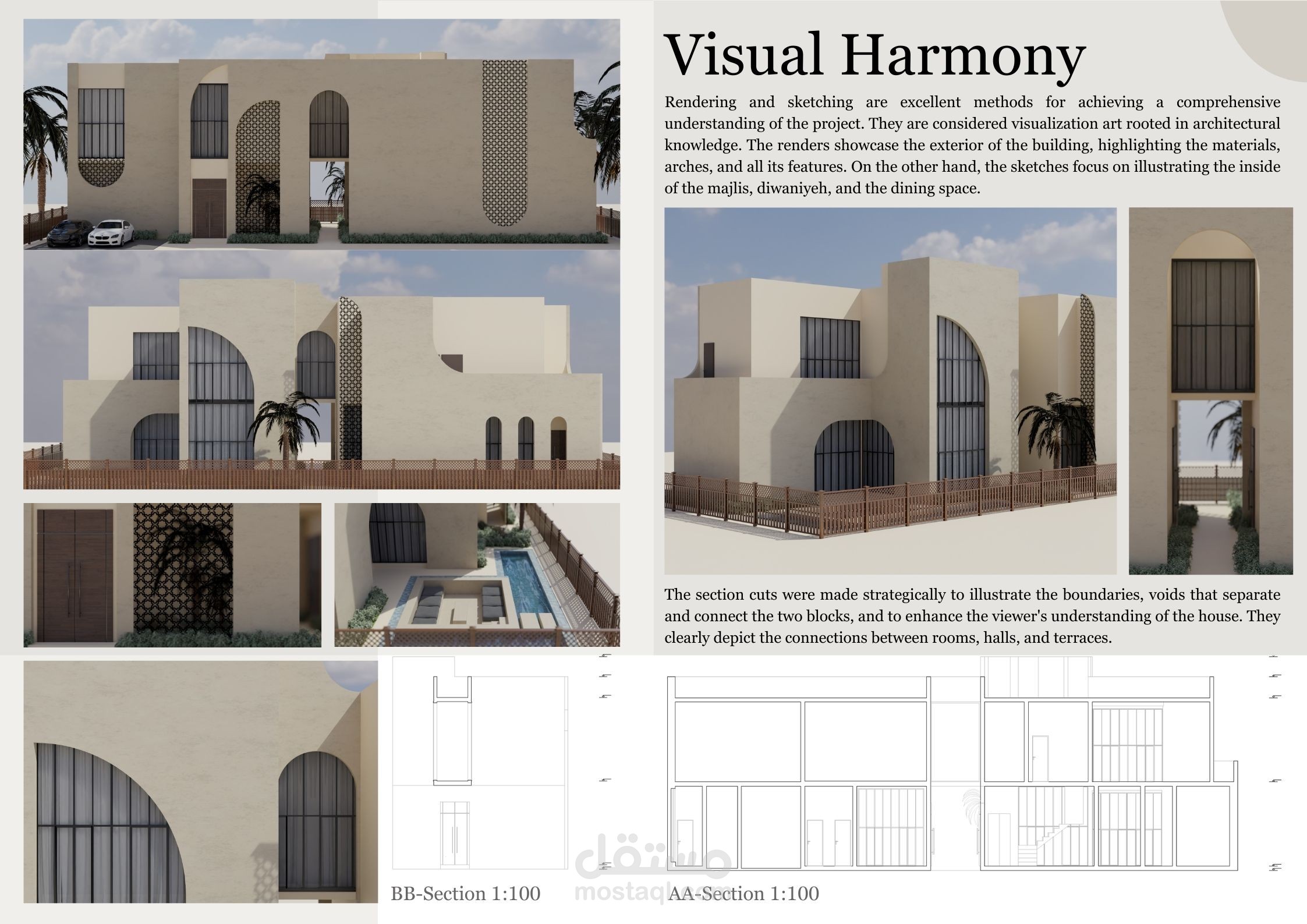 منزل المستقبل هو مشروع يهدف إلى توفير منزل لعائلة إماراتية نموذجية يلبي جميع احتياجاتها ويكون مستدامًا أيضًا. يستند التصميم إلى الهياكل الإسلامية والبيوت العربية بطريقة حديثة لمنح شعورًا دافئًا ولعكس التقاليد في المبنى. قمت بإعداد رسومات يدوية للحصول على التصاميم الأولية، ثم استخدمت أوتوكاد لرسم الخطط التقنية، وبعد ذلك استخدمت سكتش أب للنمذجة وبليندر لتصدير الرندرات. ثم قمت بتصميم الملصقات باستخدام فوتوشوب.
