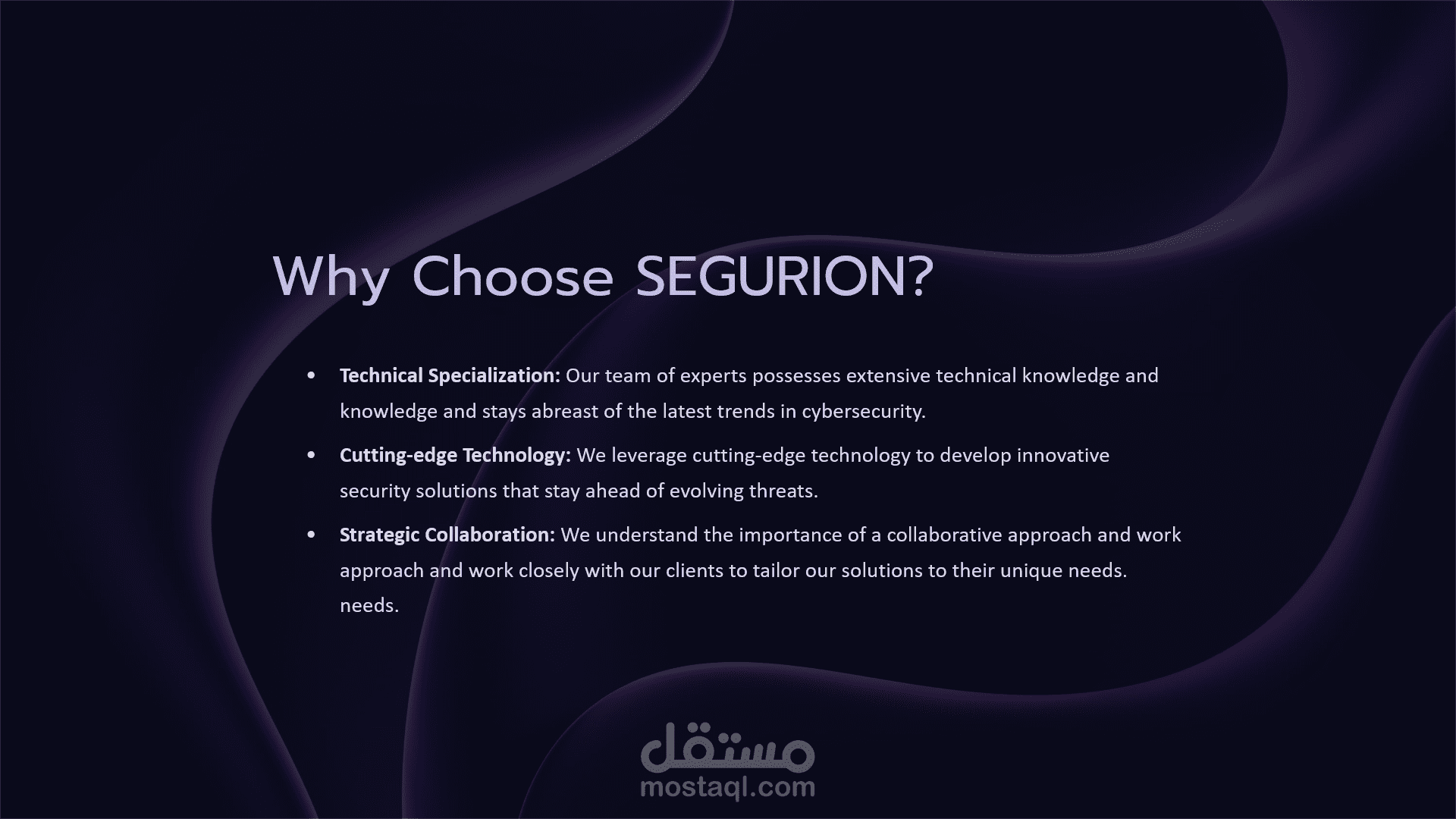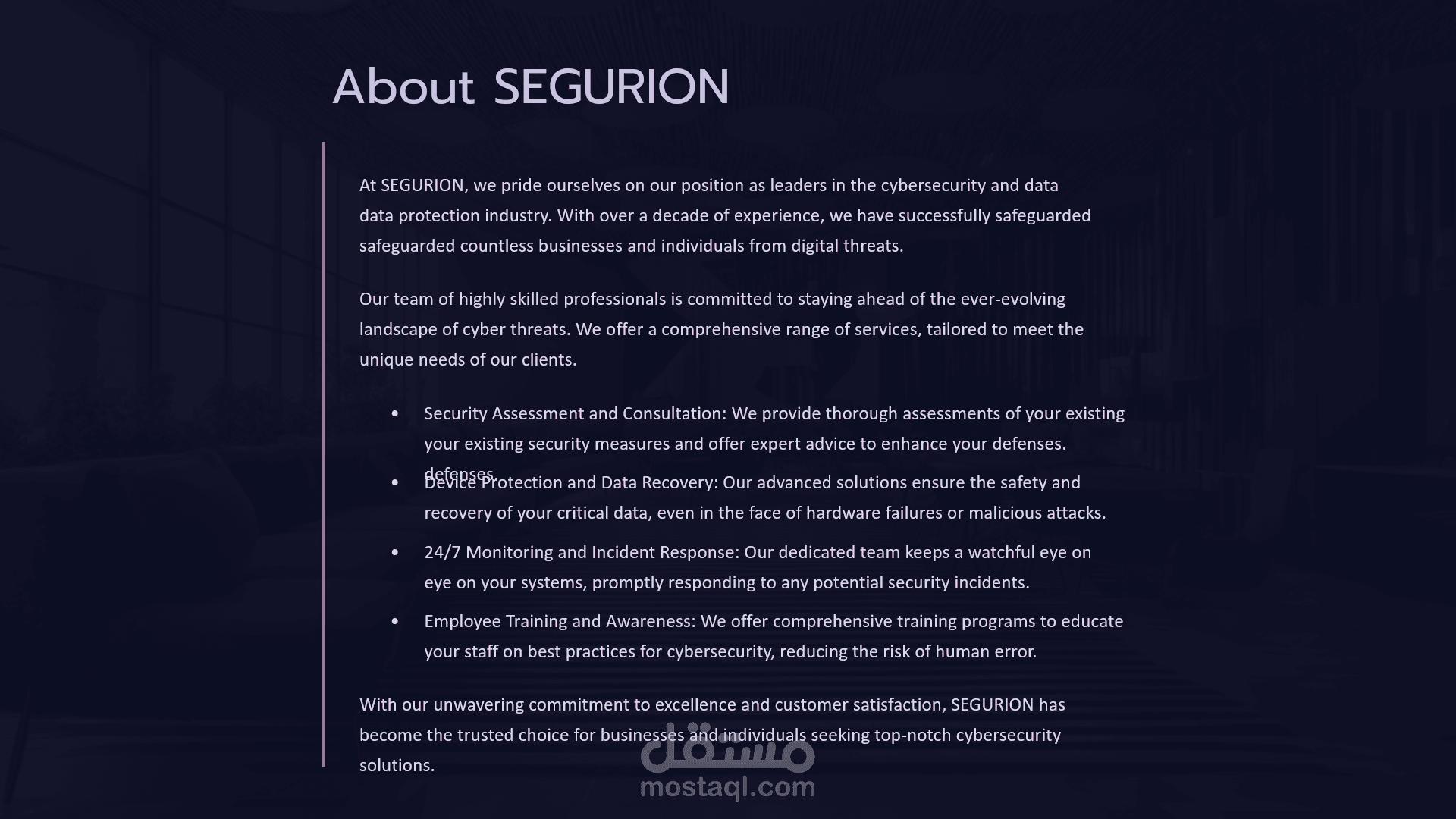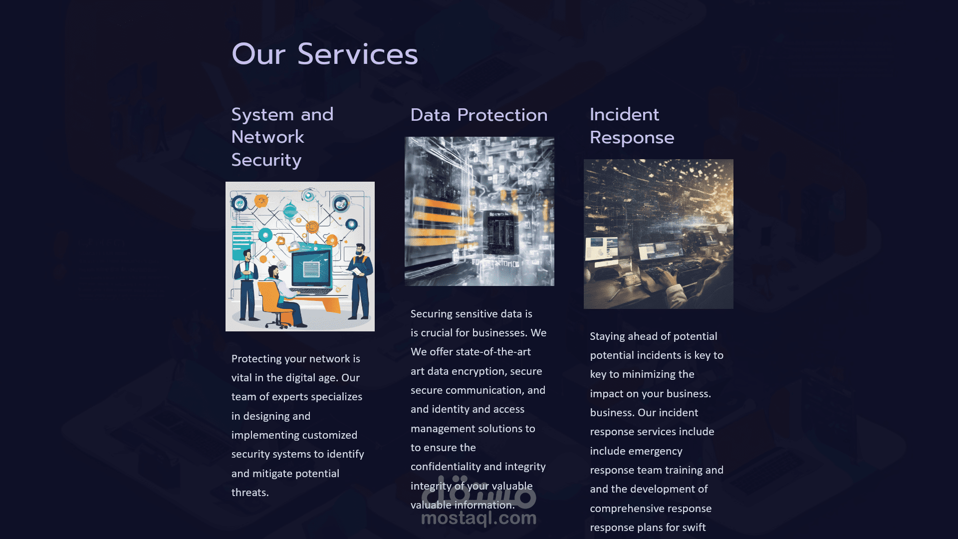 •تخصص تقني عالي: نفخر بفريقنا المتخصص في تكنولوجيا الأمان والسيبرانية.