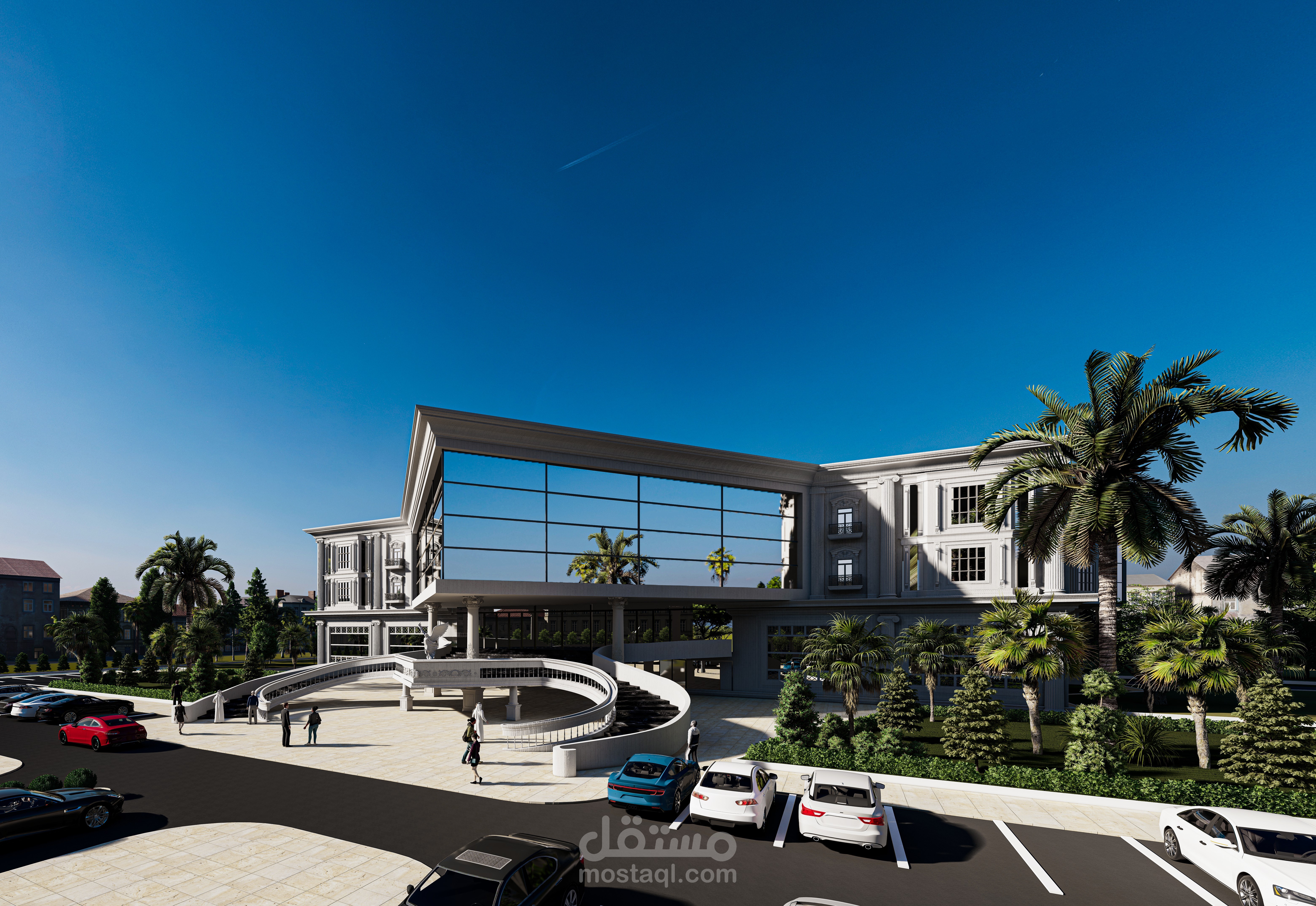 تم استخدام الاعمدة و الكورنيشات و الدمج بينها و بين الزجاج ( مواكبة العمارة الحديثة )