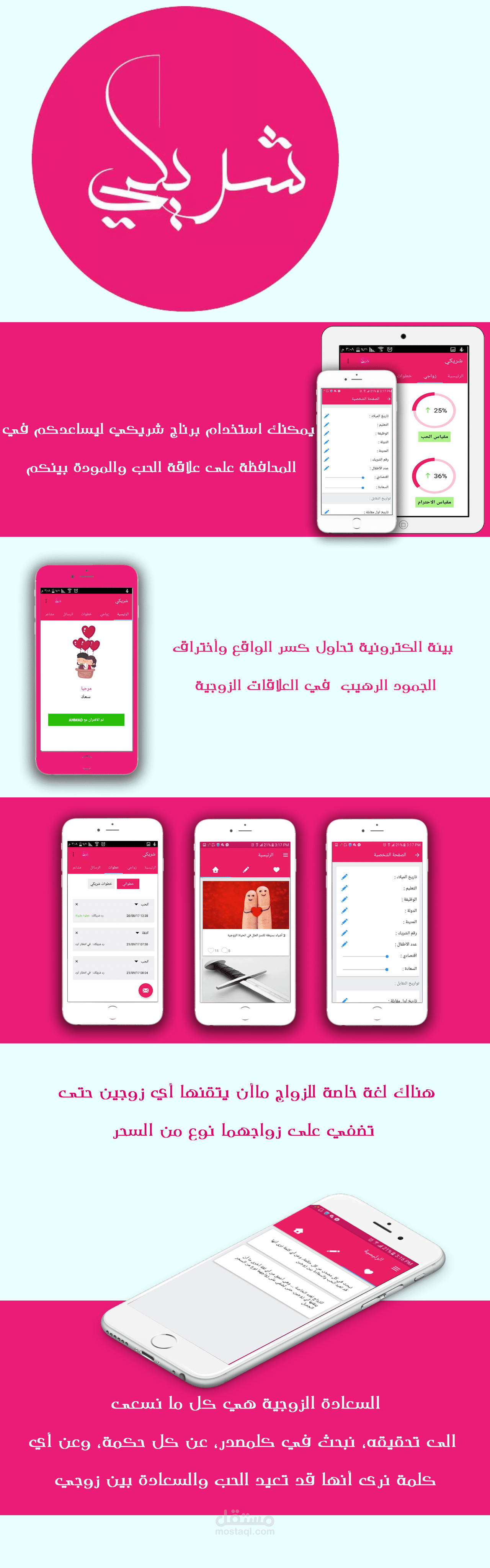 تطبيق شريكي يساعد الأزواج على المحافظة على علاقة الحب والمودة بينهما حيث يعرض العلاقة بينهما على شكل نسبة مئوية بطريقة جرافيكية