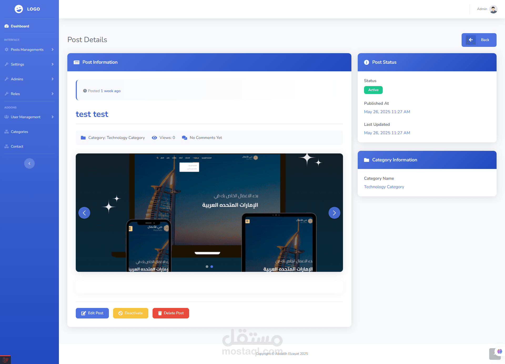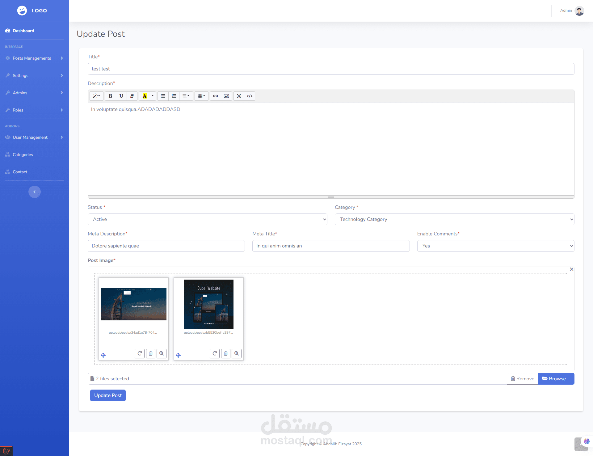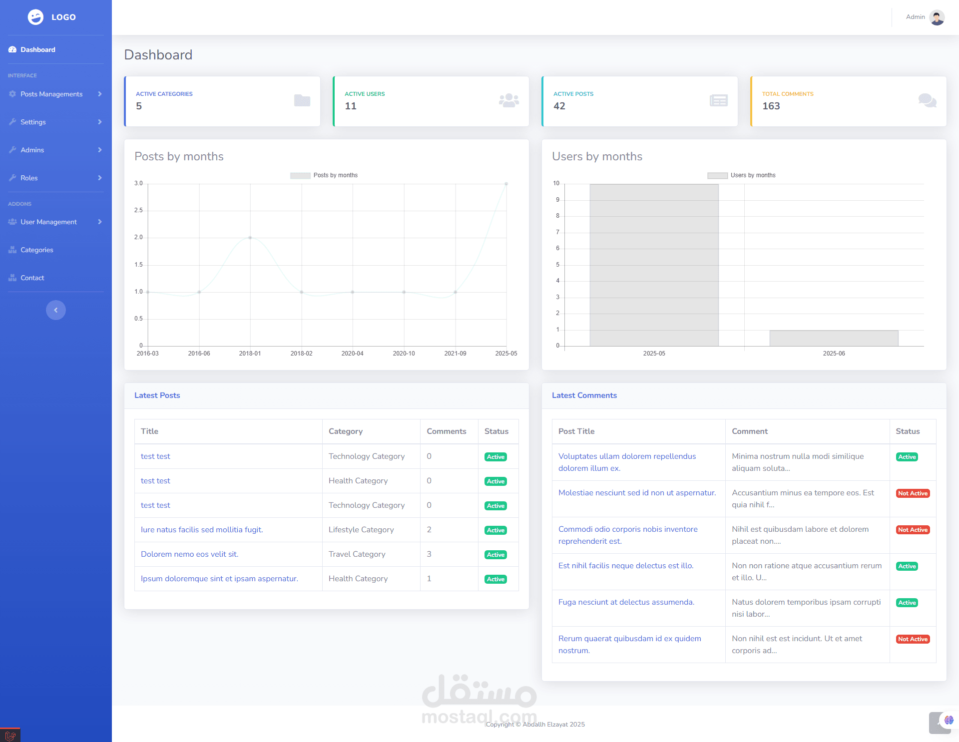 قمت ببناء نظام مدونة متكامل باستخدام Laravel يتميز بلوحة تحكم قوية وصلاحيات مرنة لتسهيل إدارة المحتوى والمستخدمين بكفاءة عالية.