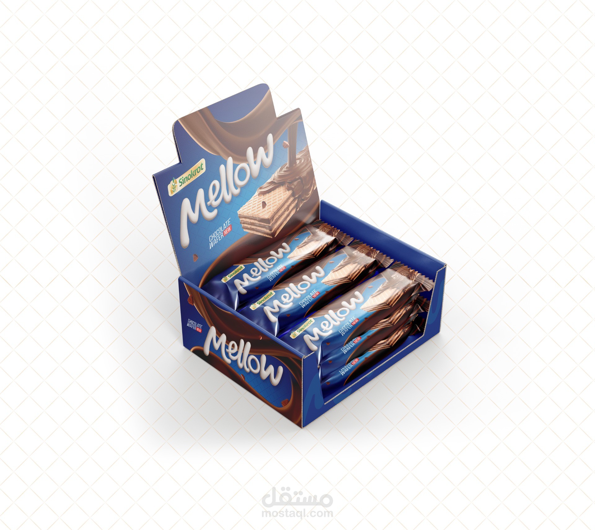التصميم الثاني يأتي بخلفية زرقاء داكنة، مما يخلق تباينًا قويًا ويعكس قوة الطعم الشوكولاتي. الشوكولاتة تتدفق بشكل غني فوق قطع الويفر، مشيرةً إلى الحشوة السخية بداخله. الخط المستخدم لاسم "Mellow" هنا أيضاً يبدو مماثلاً للتصميم الأول، مما يؤكد على الهوية العلامة التجارية.