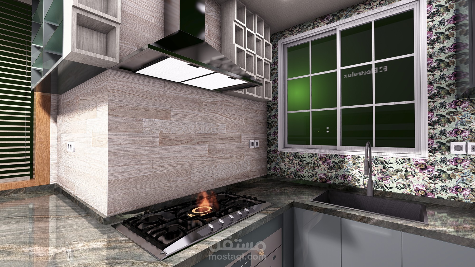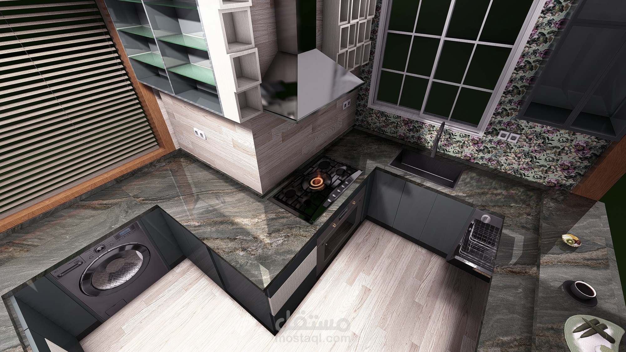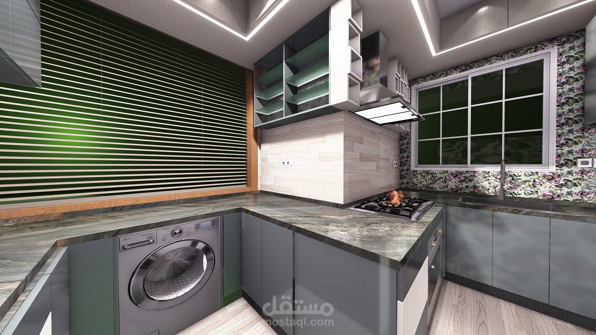 تصميم 3d مطبخ حديث باخشاب والوان على احدث صيحه عالميه وافضل استغلال للمساحات مما يتلأم مع احتيجاتك الفعليه ويفر لك مساحات تخزينيه كبيره تستوعب كل ادوات المطبخ