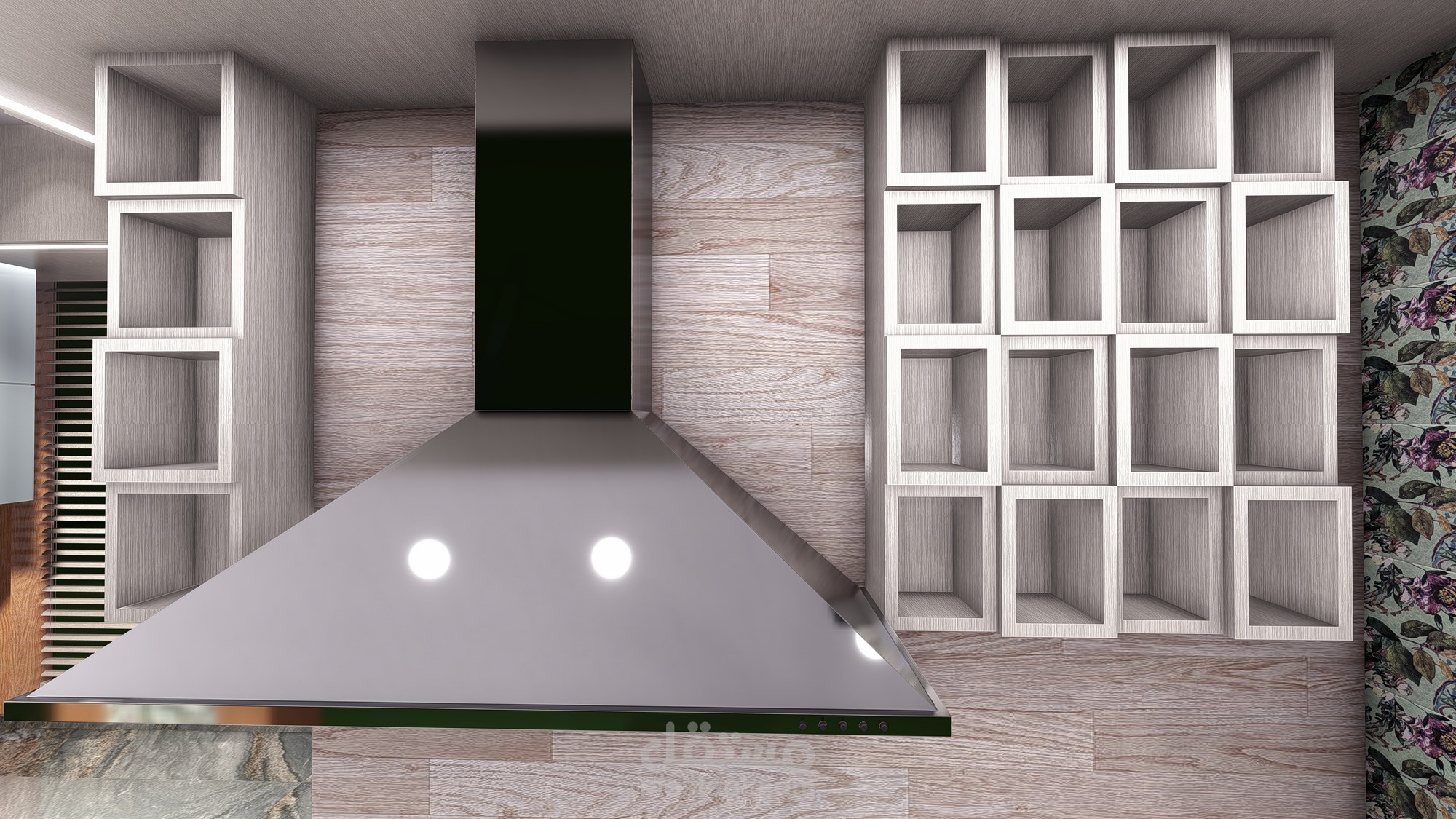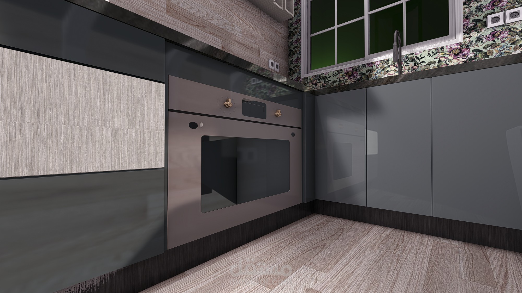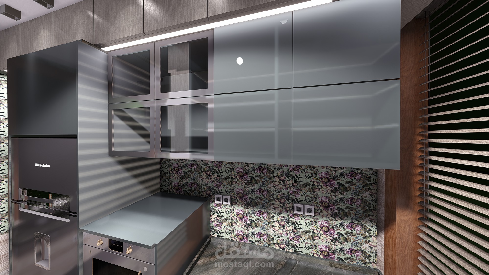 تصميم 3d مطبخ حديث باخشاب والوان على احدث صيحه عالميه وافضل استغلال للمساحات مما يتلأم مع احتيجاتك الفعليه ويفر لك مساحات تخزينيه كبيره تستوعب كل ادوات المطبخ