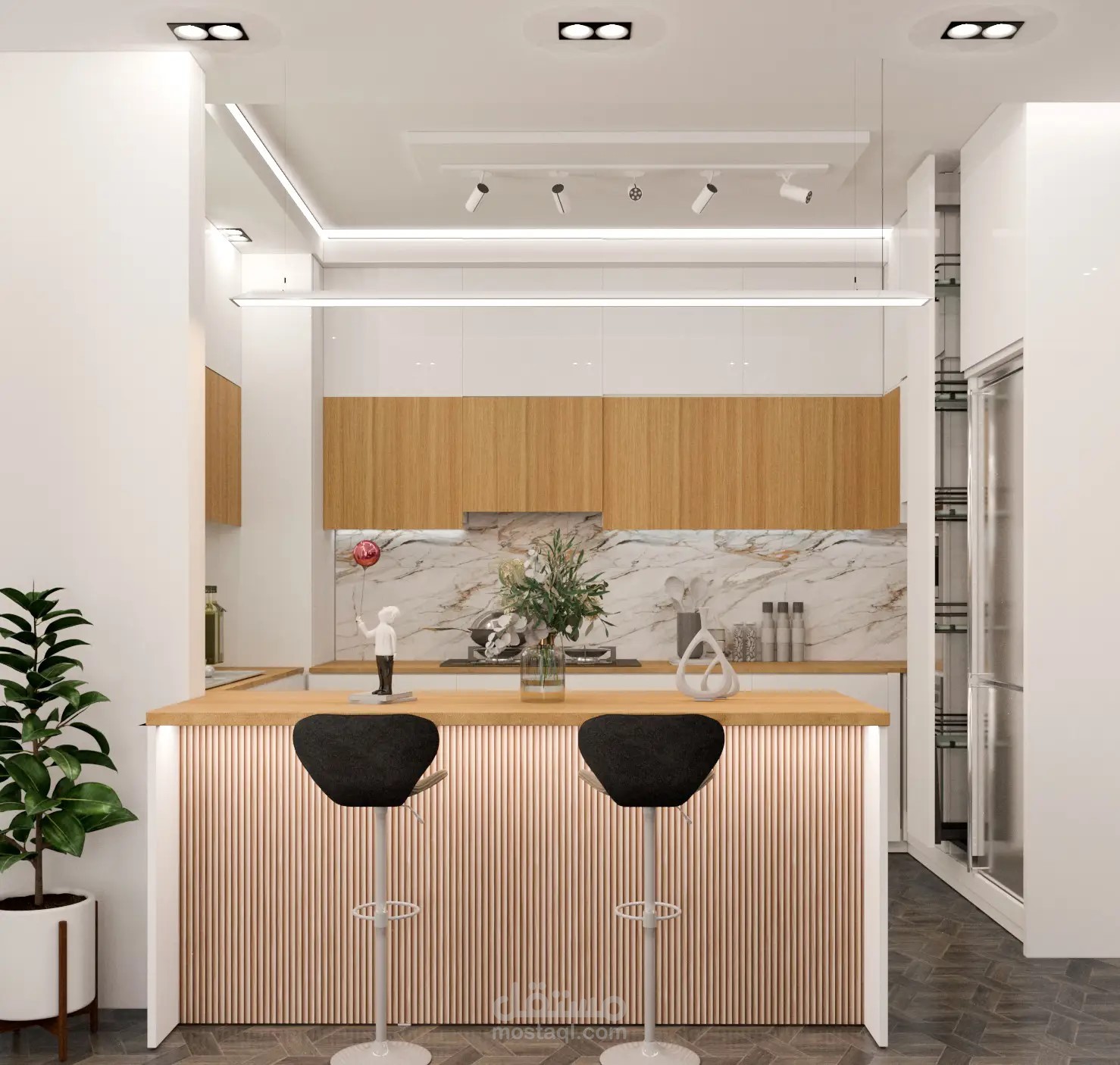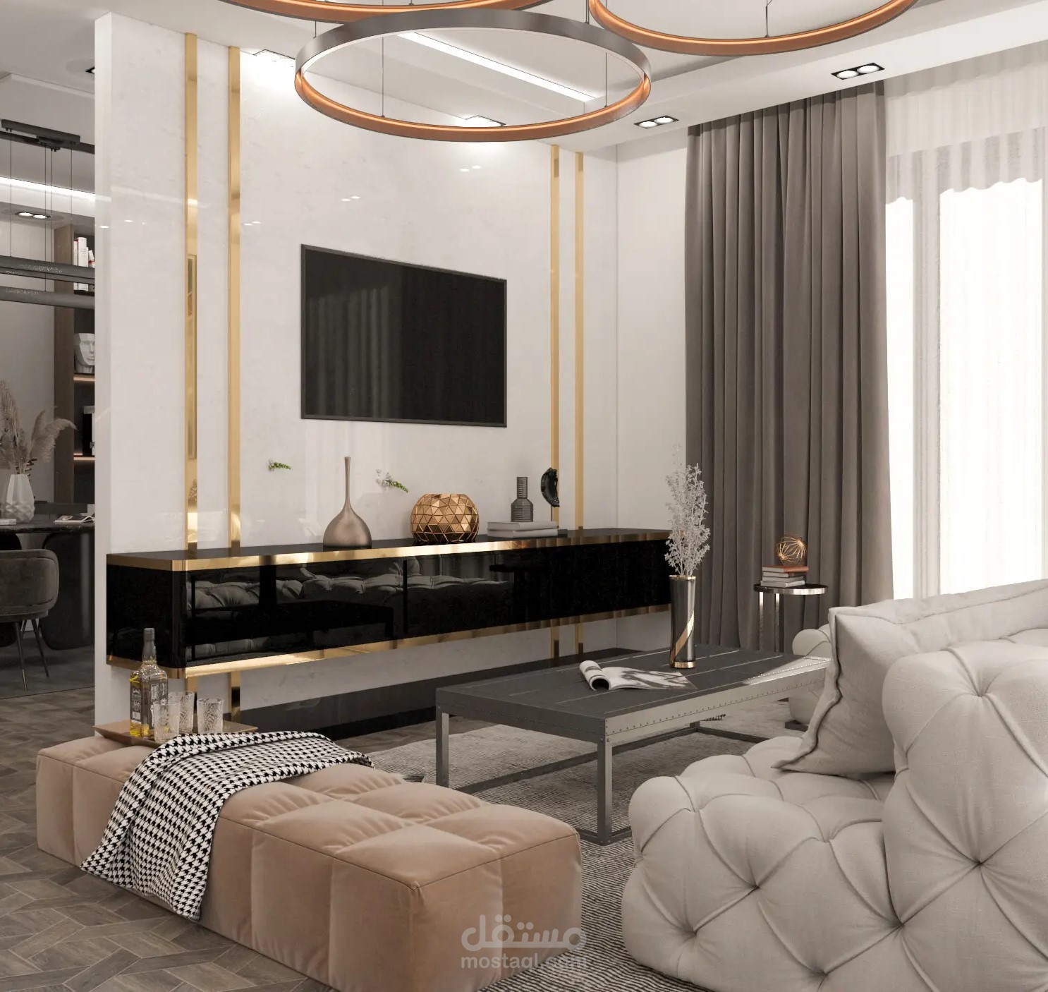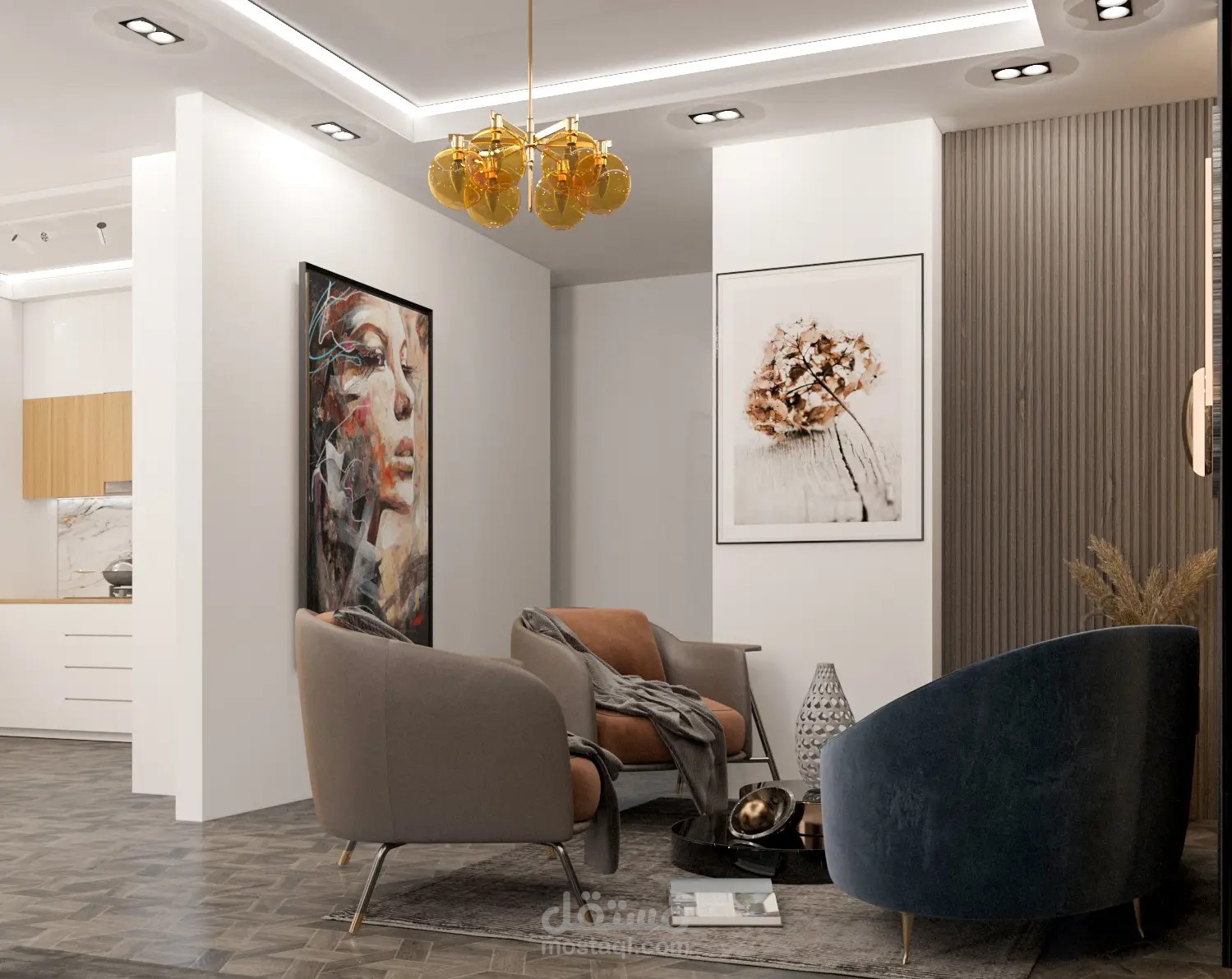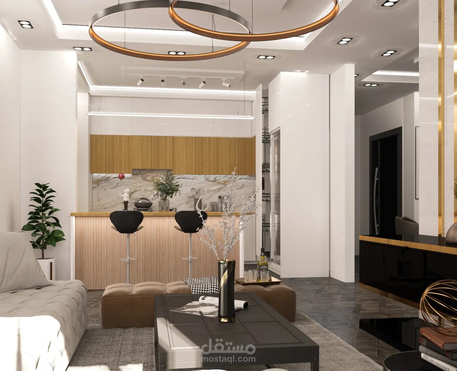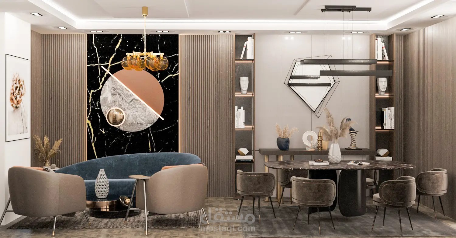 غرفة معيشة وغرفة استقبال ومطبخ و سفرة فى مكان واحد