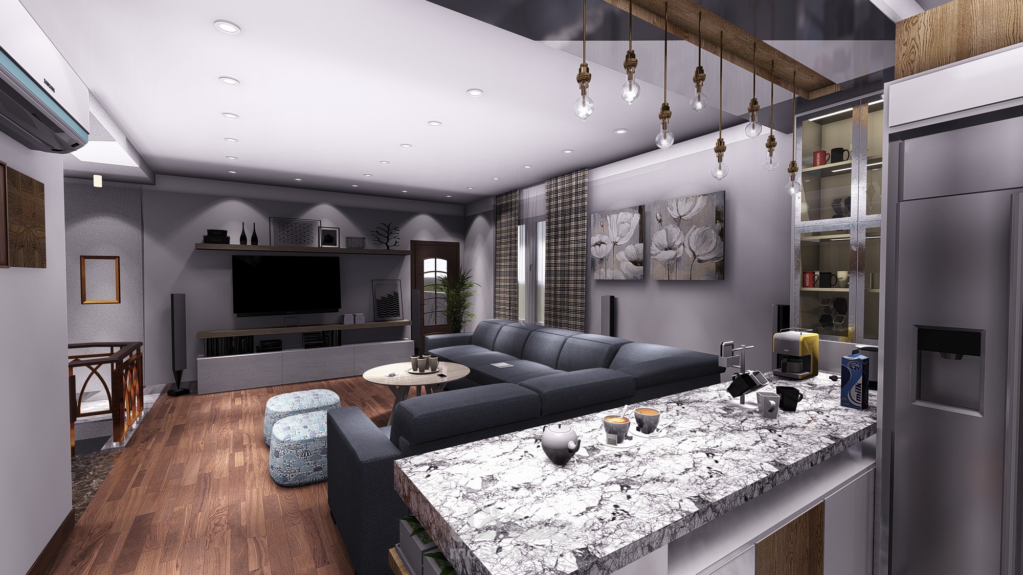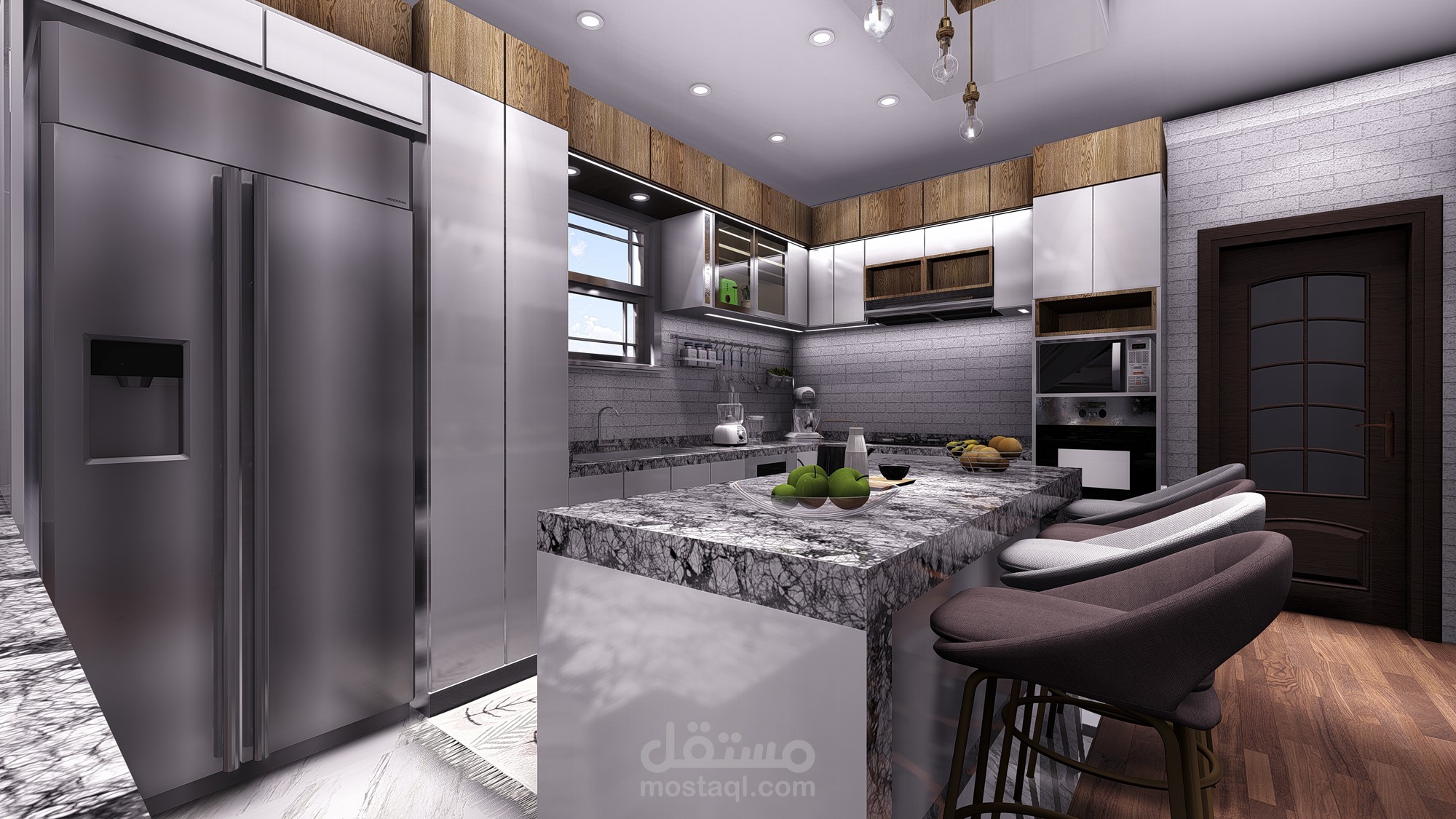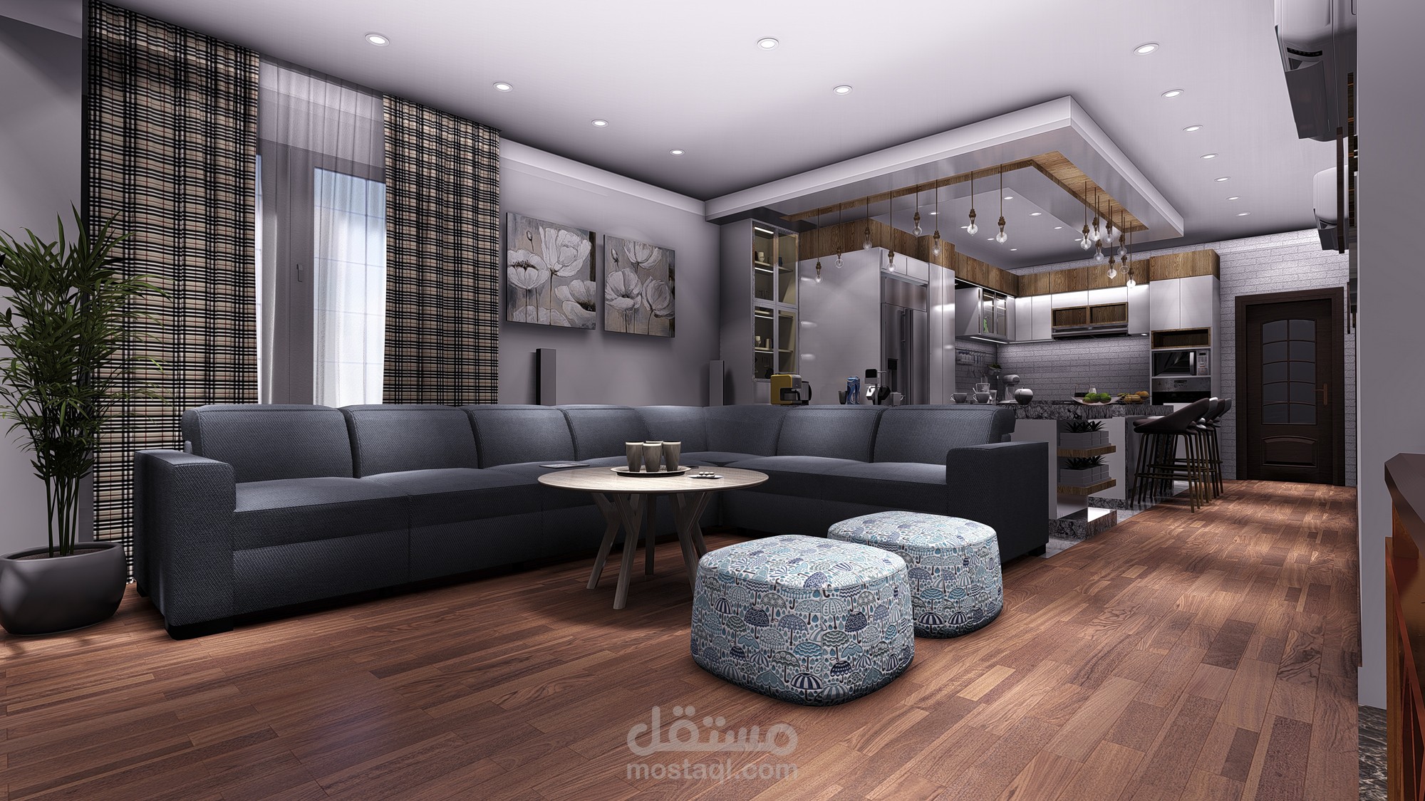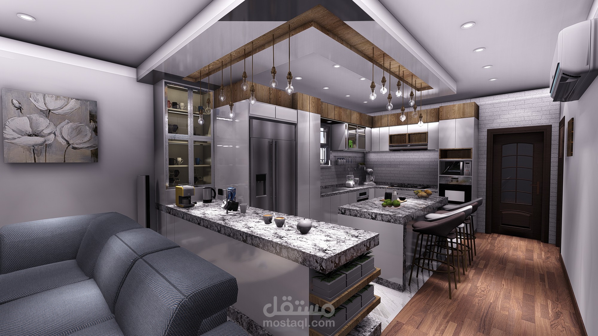 من الأساليب العصرية في هذه الآونة دمج غرفة المعيشة والمطبخ معا والتي تعطي شعورا بكبر المساحة، وحريه كبيره بالحركه والتقاء كل افراد الاسره مع بعضهم البعض