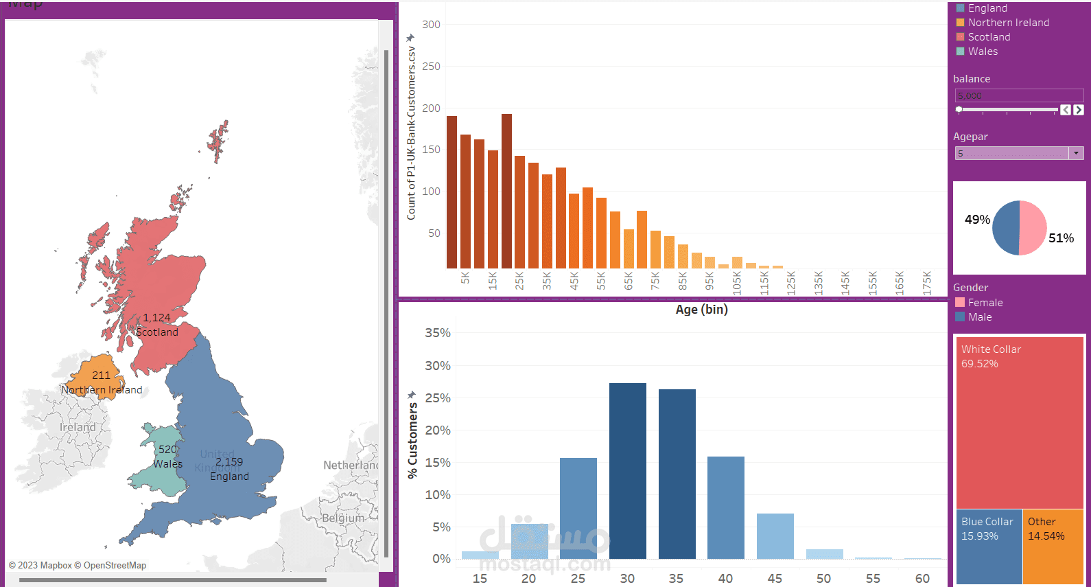 dashboard for bank accounts in UK using Tableau contains age and jobs of customers in whole uk