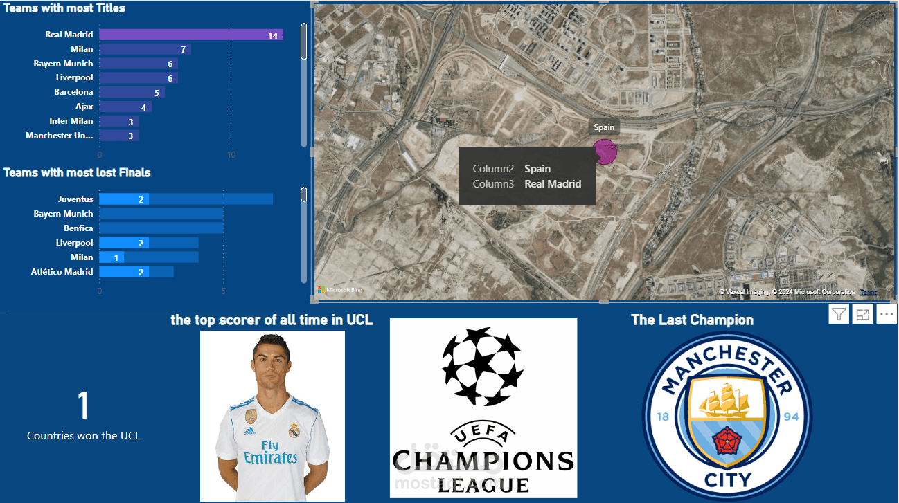 The dashboard shows the history of UCL and the teams that hold the title and the title holder and the best player in the championship.