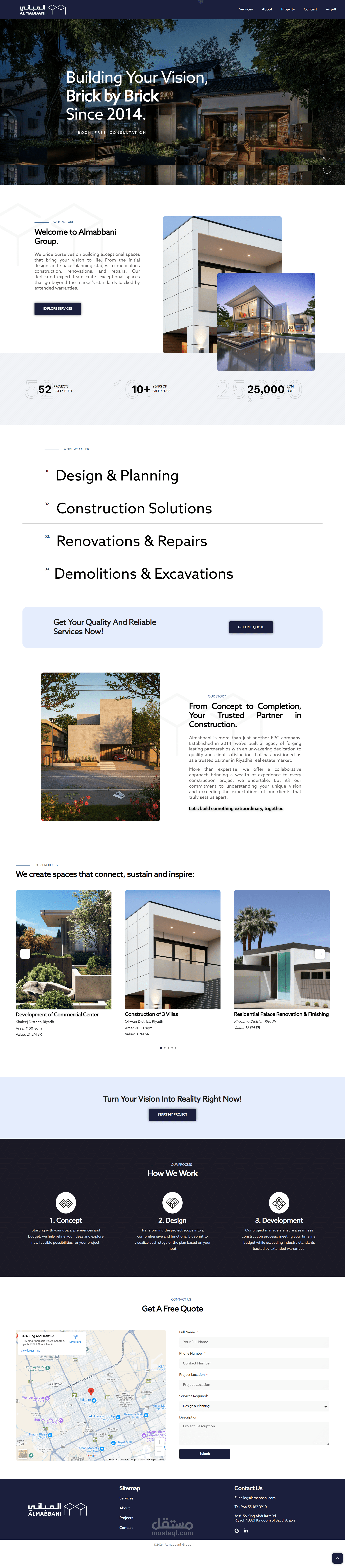 تصميم وتطوير صفحة هبوط عقارية عصرية ونظيفة لشركة إنشاءات وتطوير عقاري. تشمل الصفحة تصميماً متجاوباً بالكامل، إبراز الخدمات، عرض المشاريع، ودمج عناصر لجذب العملاء وتوليد العملاء المحتملين.
