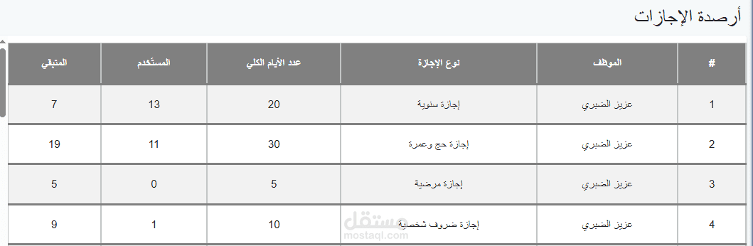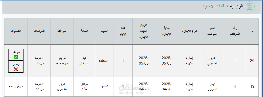 إدارة الإجازات - تقديم طلب من الموظف وقبولها او رفضها من المدير و حساب رصيد الإجازات - امكانية رفع ملفات عند طلب إجازة