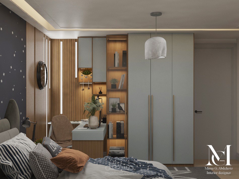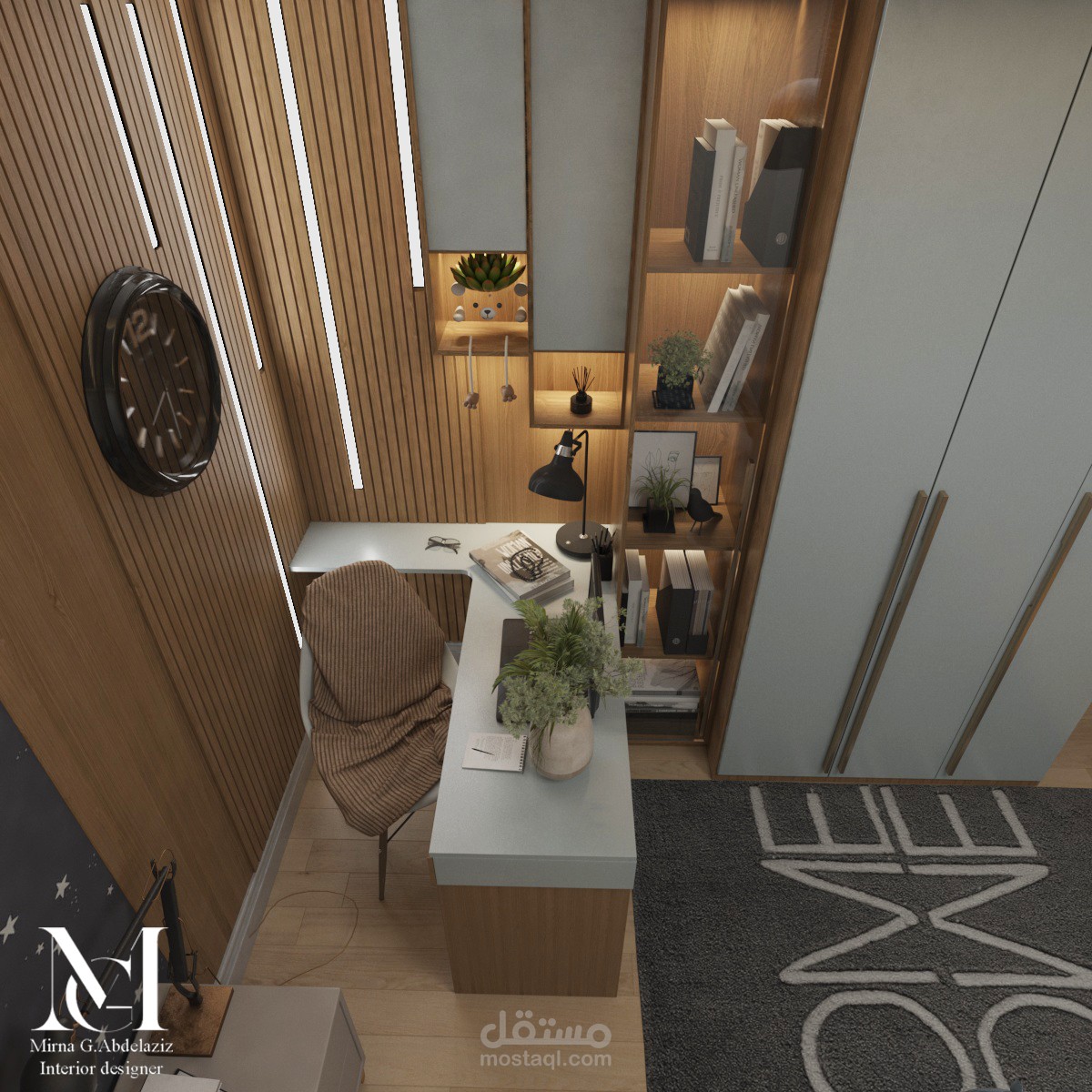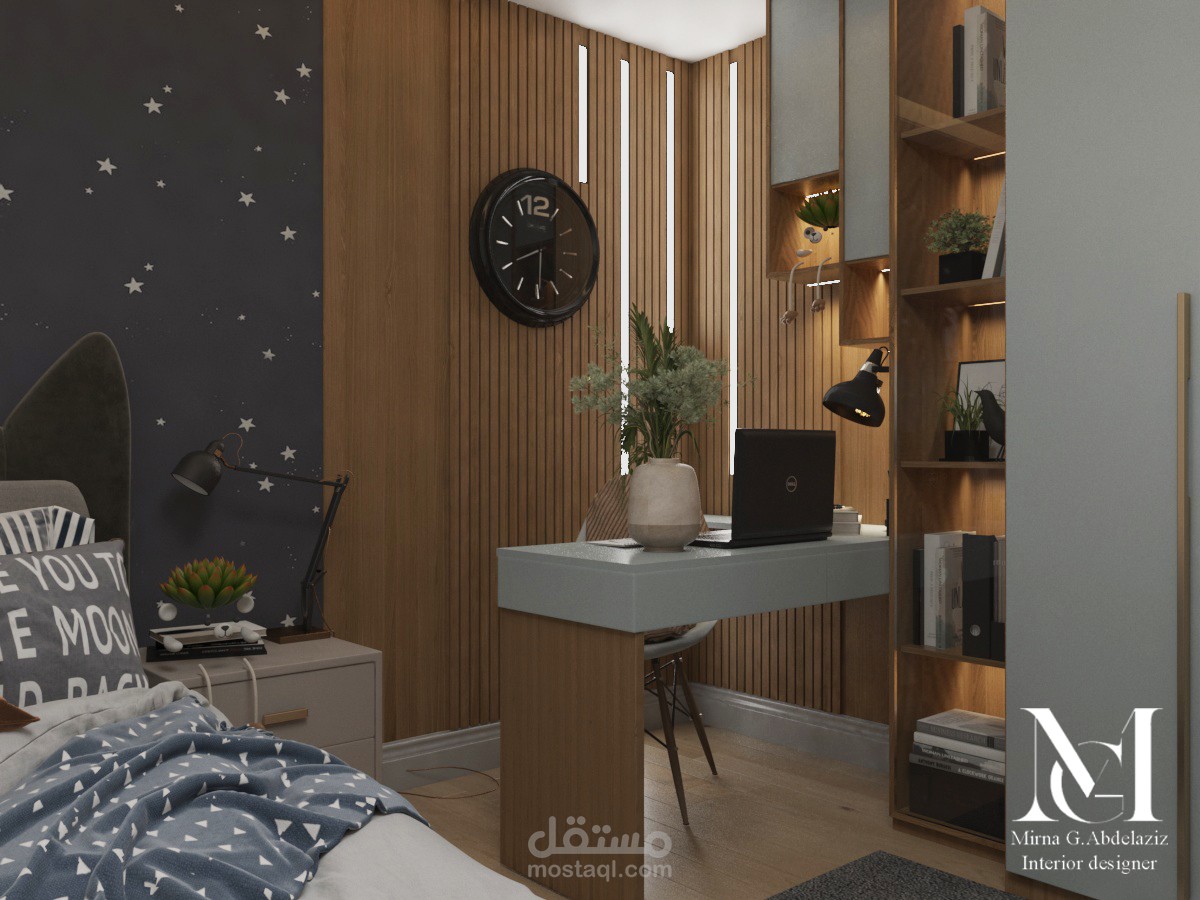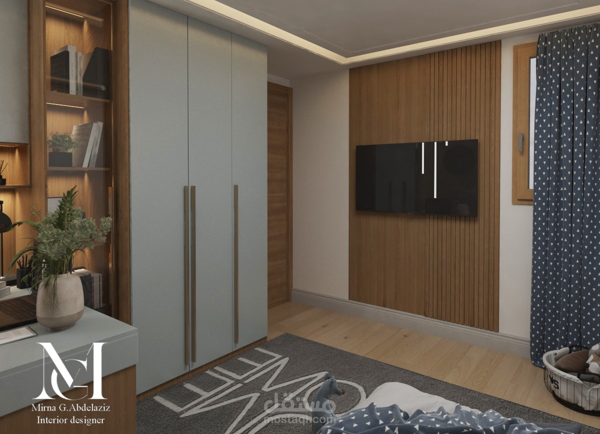 غرفة اطفال شبابيه بها مكتب وسرير و وحده تخزين ملابس تحت التصميم المودرن والوان محدده من الخشب الجوزي والازرق والرمادي مع مراعاة مسارات الحركه.