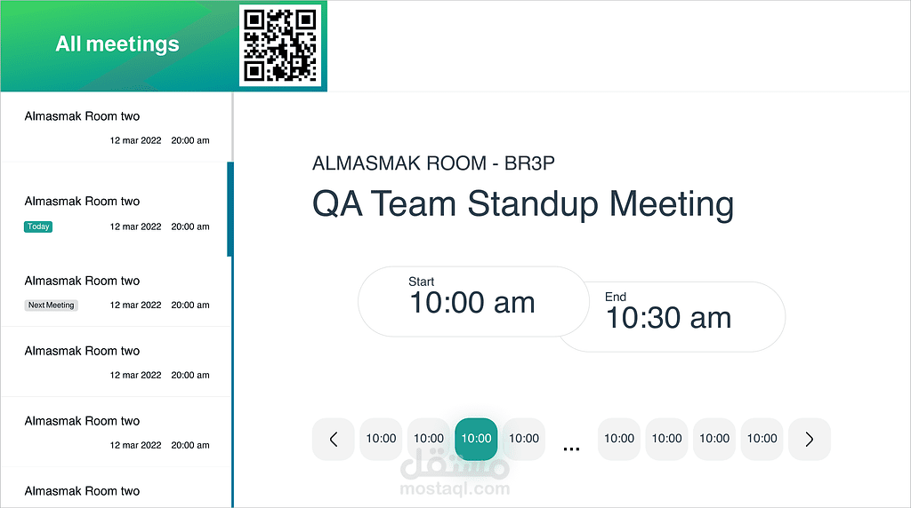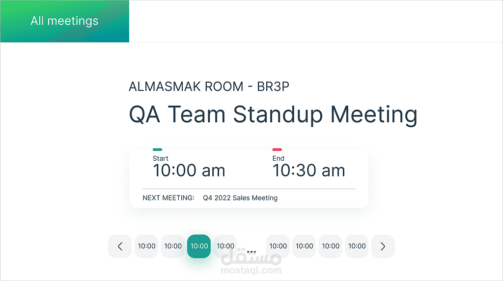A brief overview of a screen displaying upcoming meetings used within companies and organizations for employees. Each meeting displays the meeting name, start time, end time, and location of the meeting. This screen is utilized to help employees organize their schedules and plan their daily activities based on the upcoming meeting schedule. Administrators can easily update the information using a content management system. This screen assists employees in quickly and easily accessing essential information about upcoming meetings.