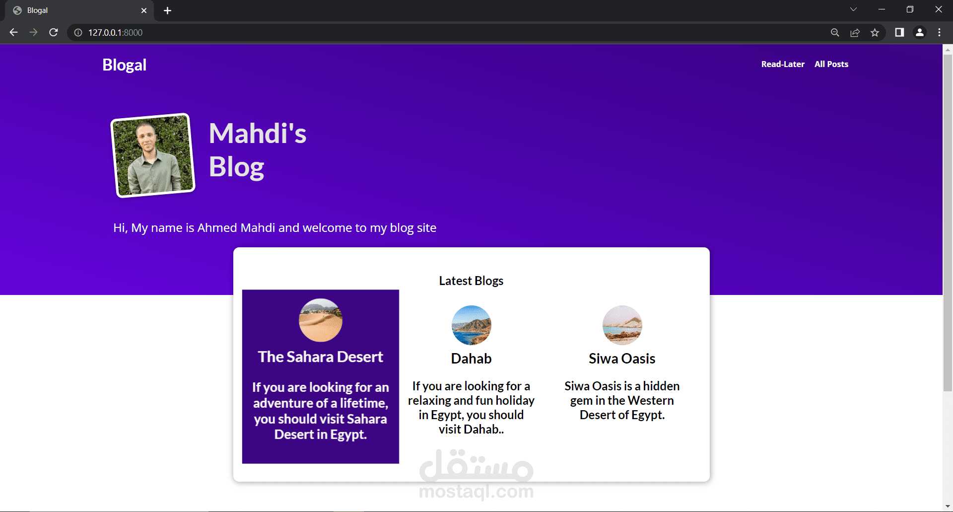 1- صفحة الهبوط وتحتوي علي تفاصيل صاحب الموقع و اخر 3 blog تم نشرها ع موقعه ونبذة عن هوياته.