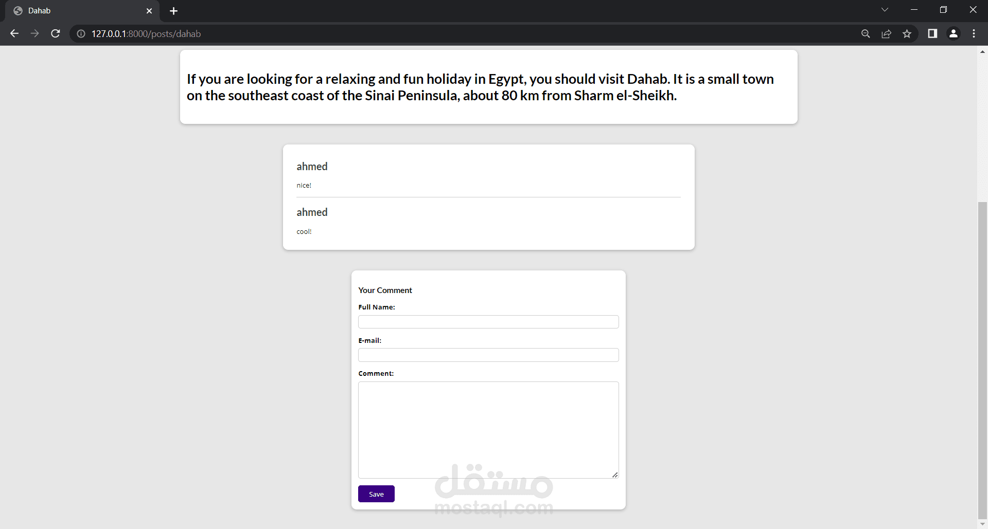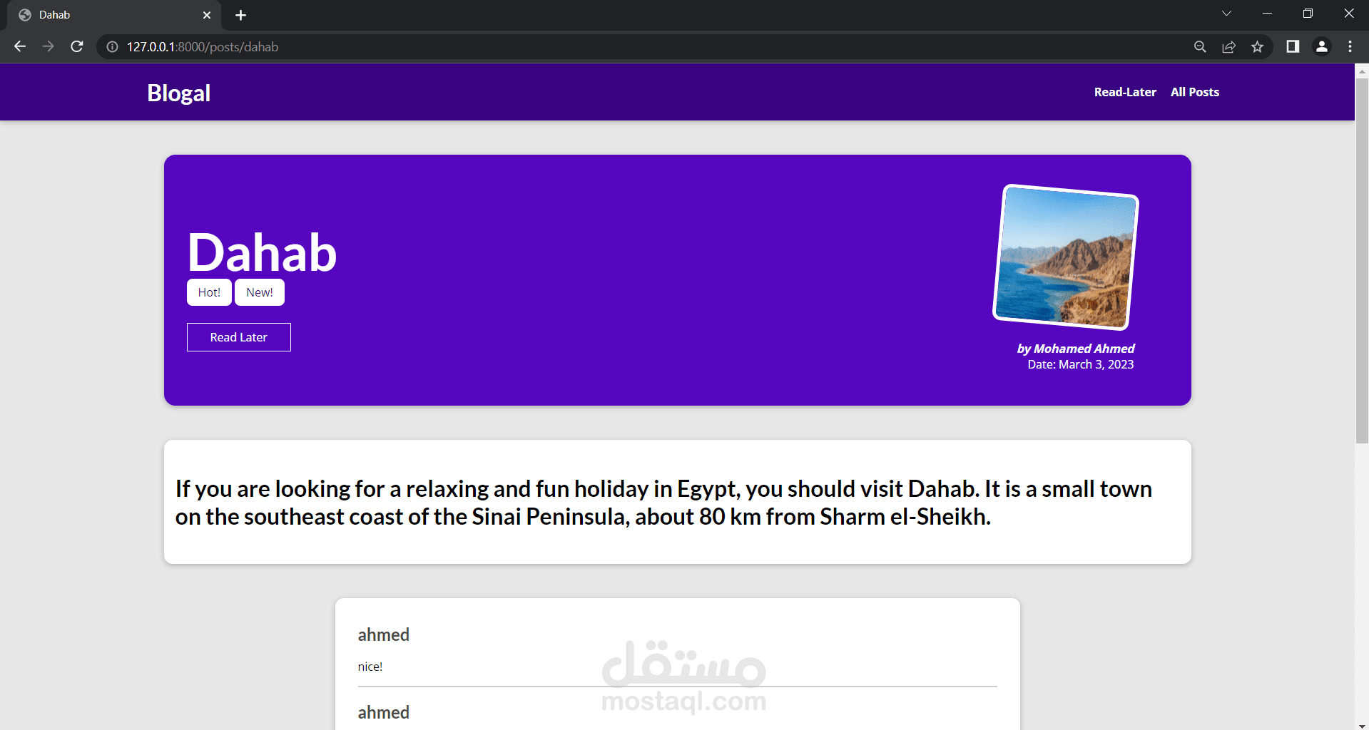 3- صفحة لعرض تفاصيل ال blog مع امكانية اضافة تعليق اسفل ال blog و امكانية اضافه ال blog الي قائمة القراءة لاحقا.