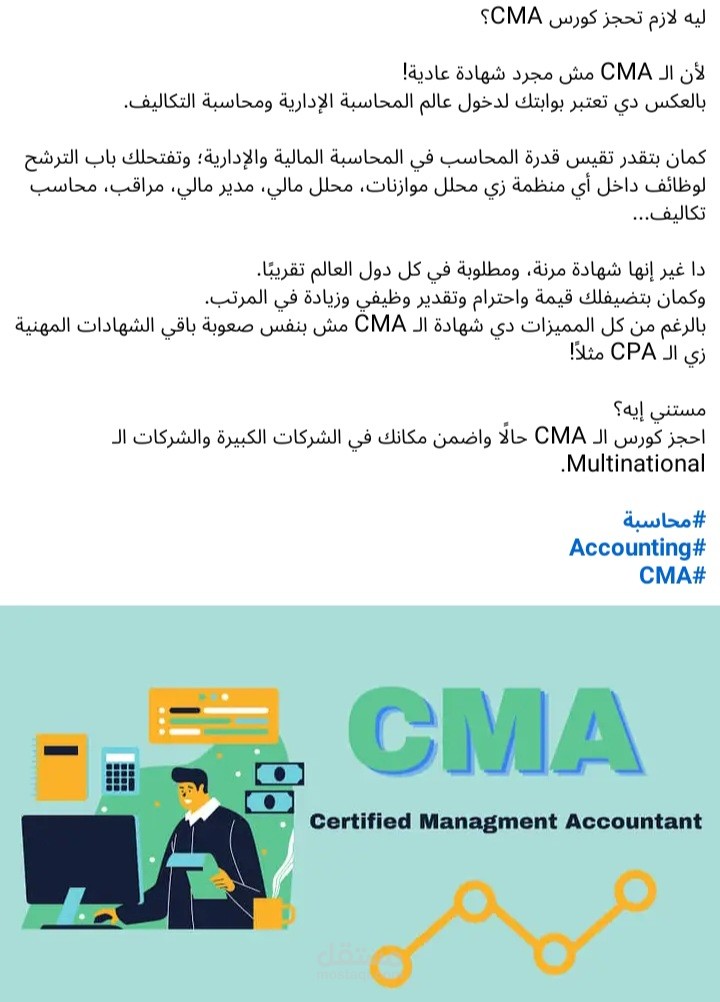 يبدأ المحتوى الإعلاني بسؤال يعطي شعور للعميل بأنه يجب عليه حجز كورس CMA.