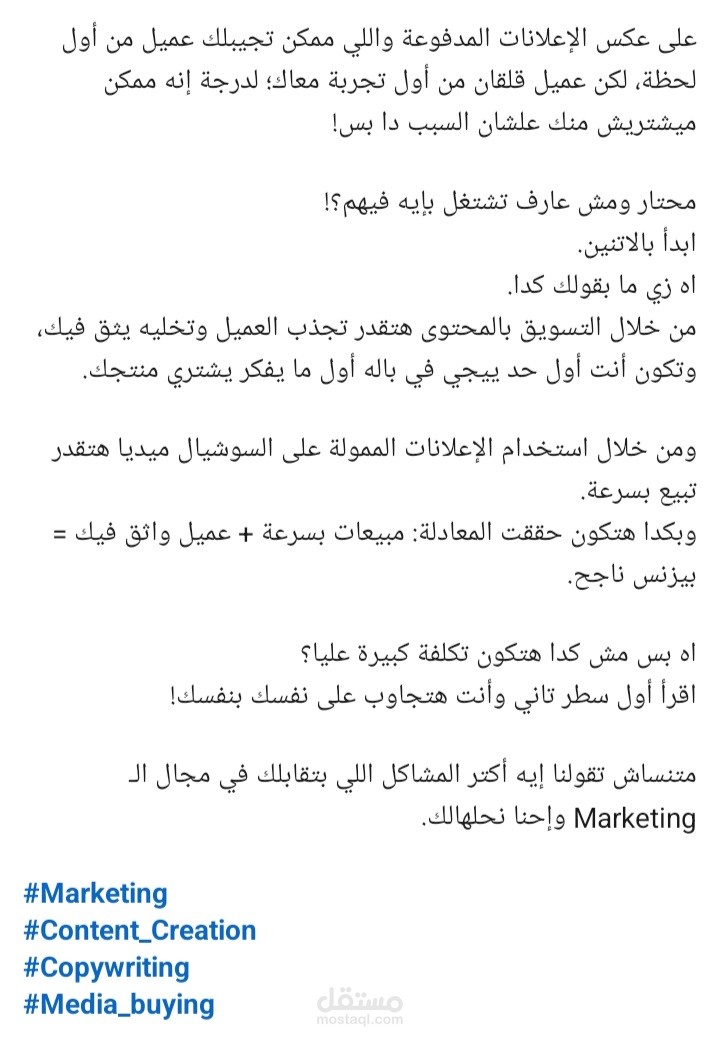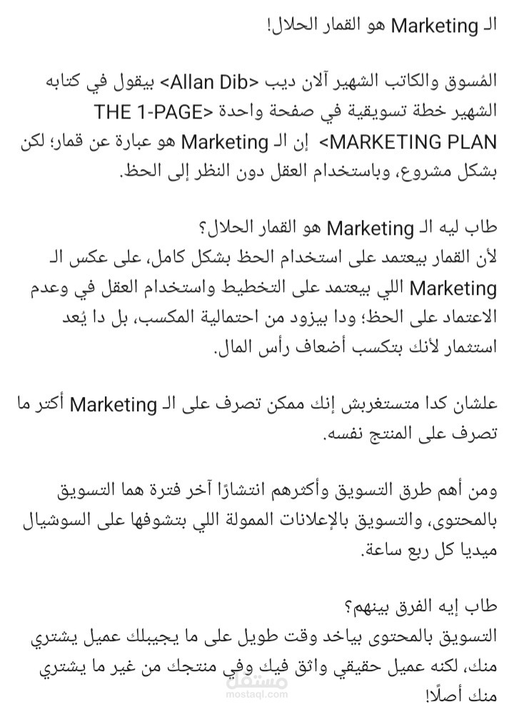 يبدأ المقال بعبارة تعبر عن حقيقة الـ Marketing، مع ذكر بعض أقوال علماء التسويق وتفسيرها.