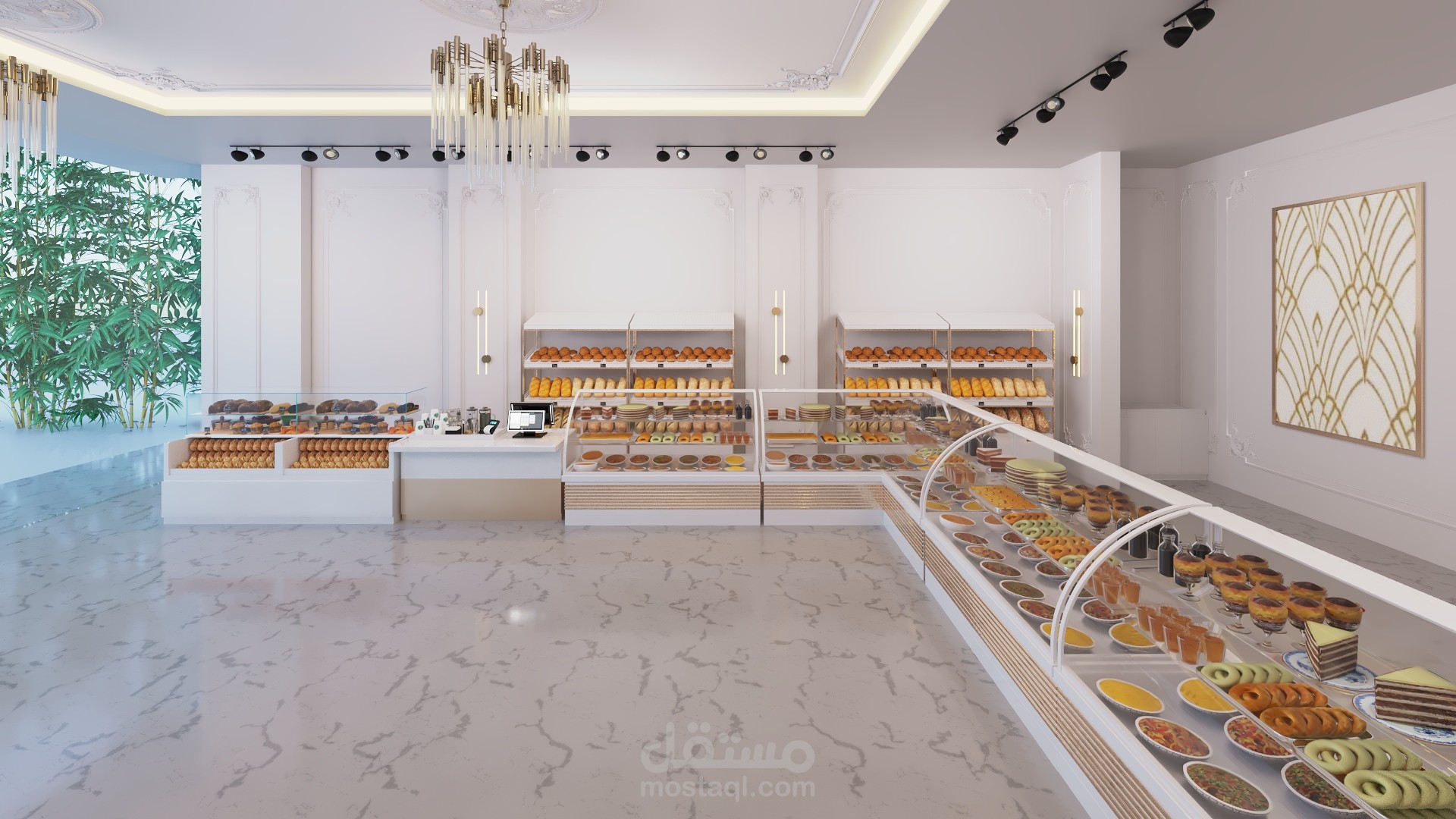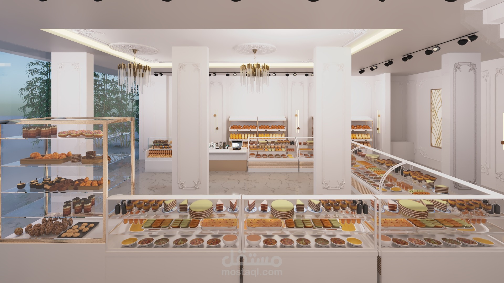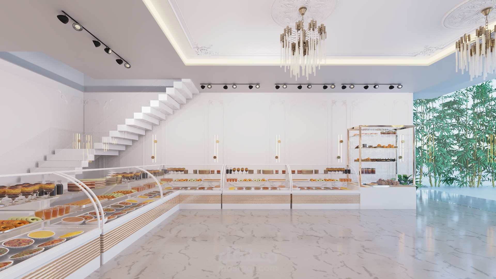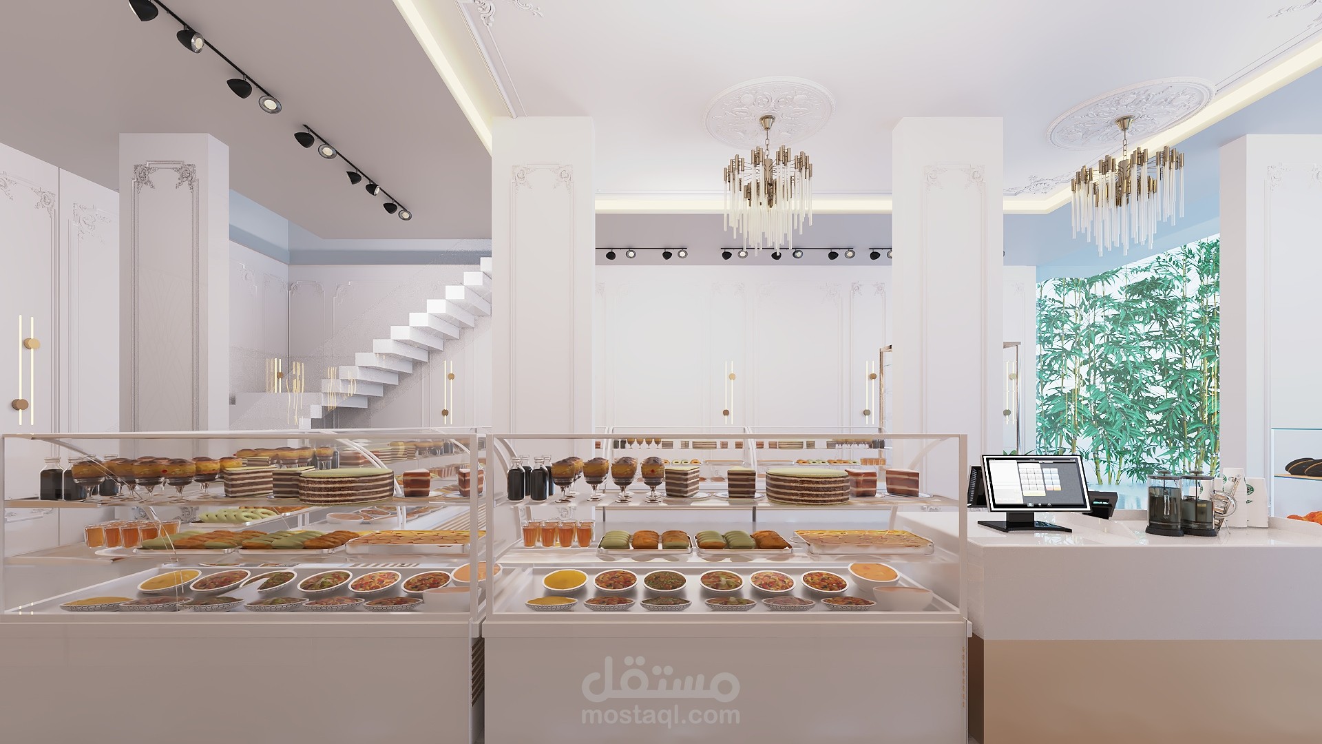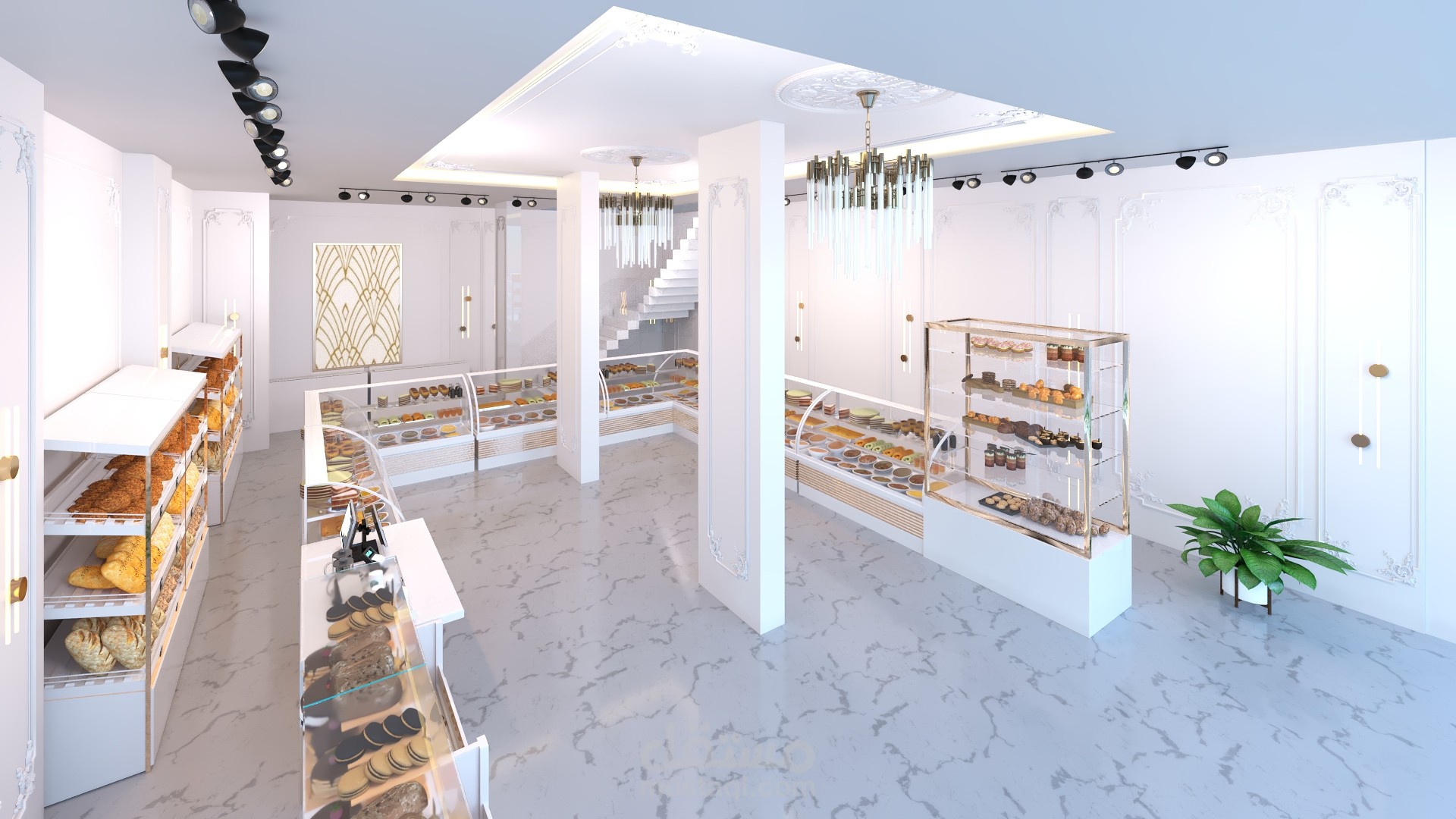 تصميم محل حلويات نيو كلاسيك تصميم بسيط غير مكلف ب الوان ابيض و دهبي