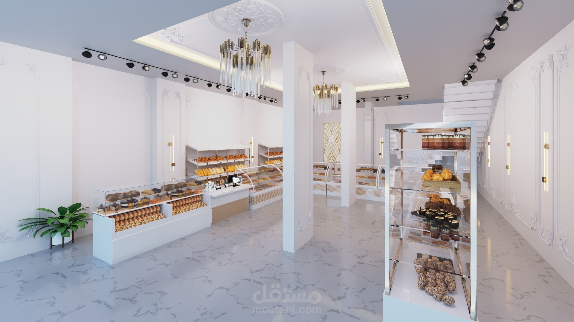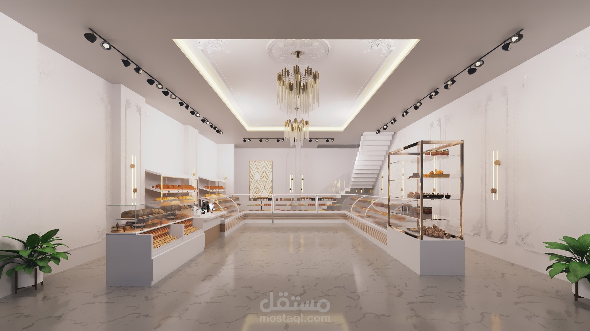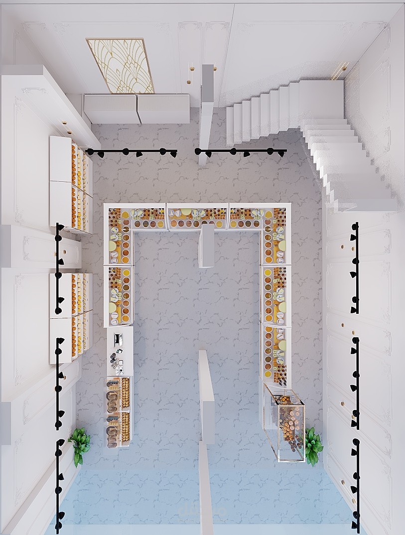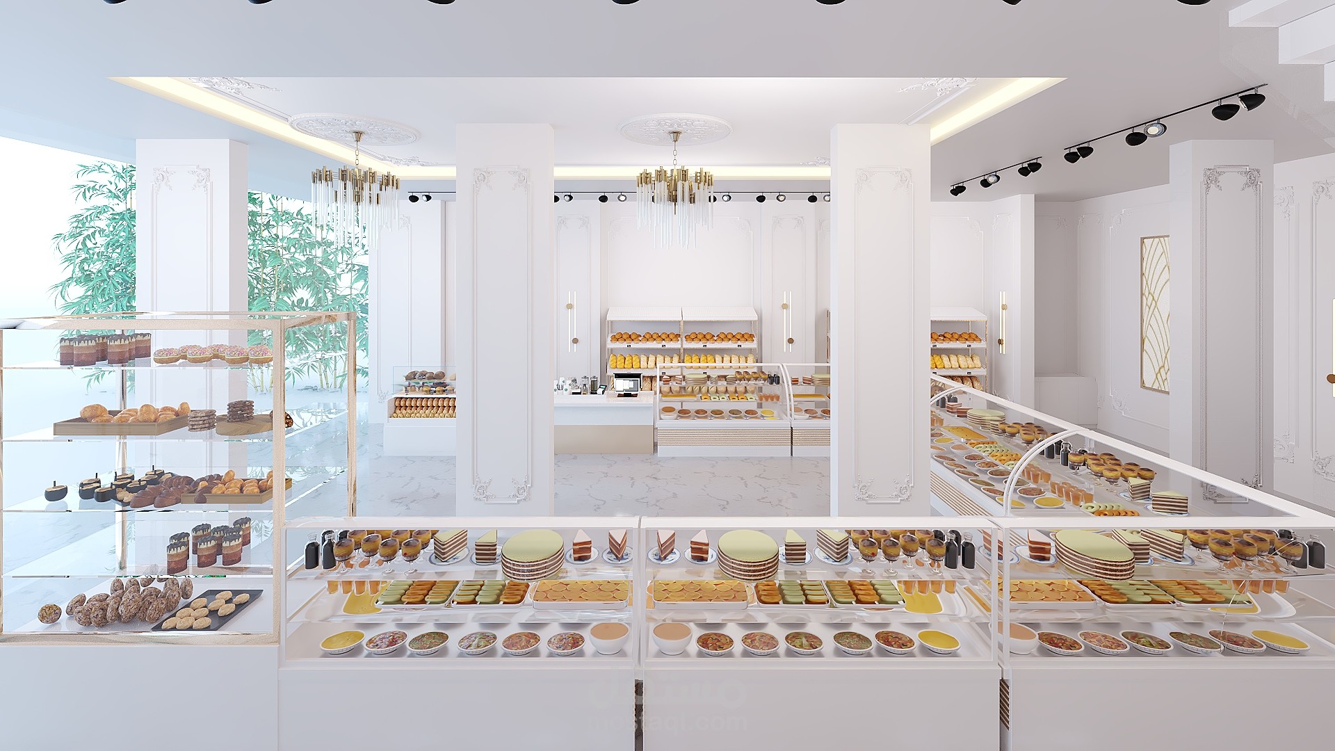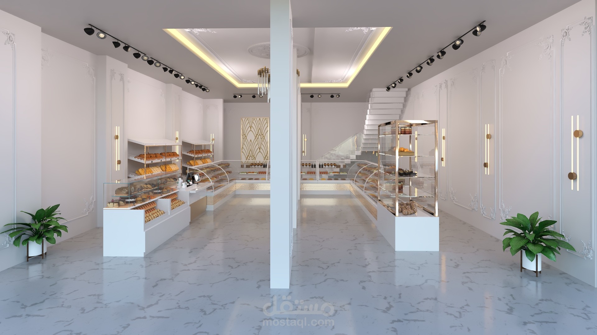 تصميم محل حلويات نيو كلاسيك تصميم بسيط غير مكلف ب الوان ابيض و دهبي