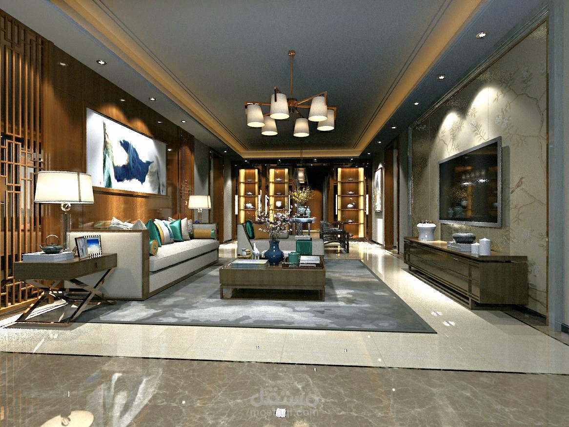 تم استخدام افضل انواع المواد وتوزيع الانارة بشكل مدروس وتوزيع الفرش حسب الفراغ وعدم اعطاء ضيق في المساحة او العكس