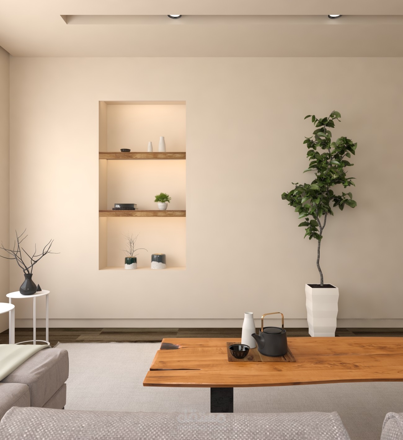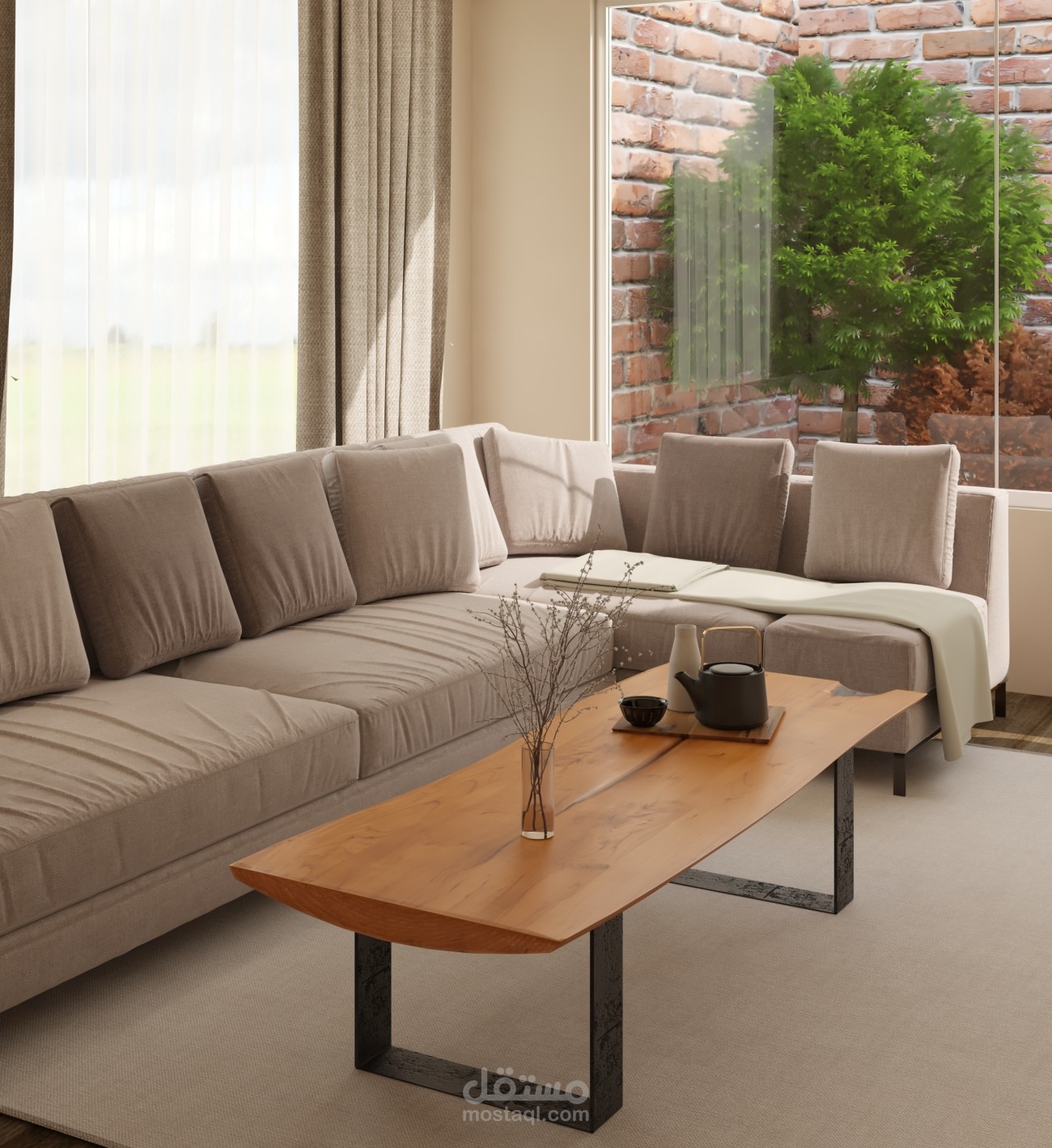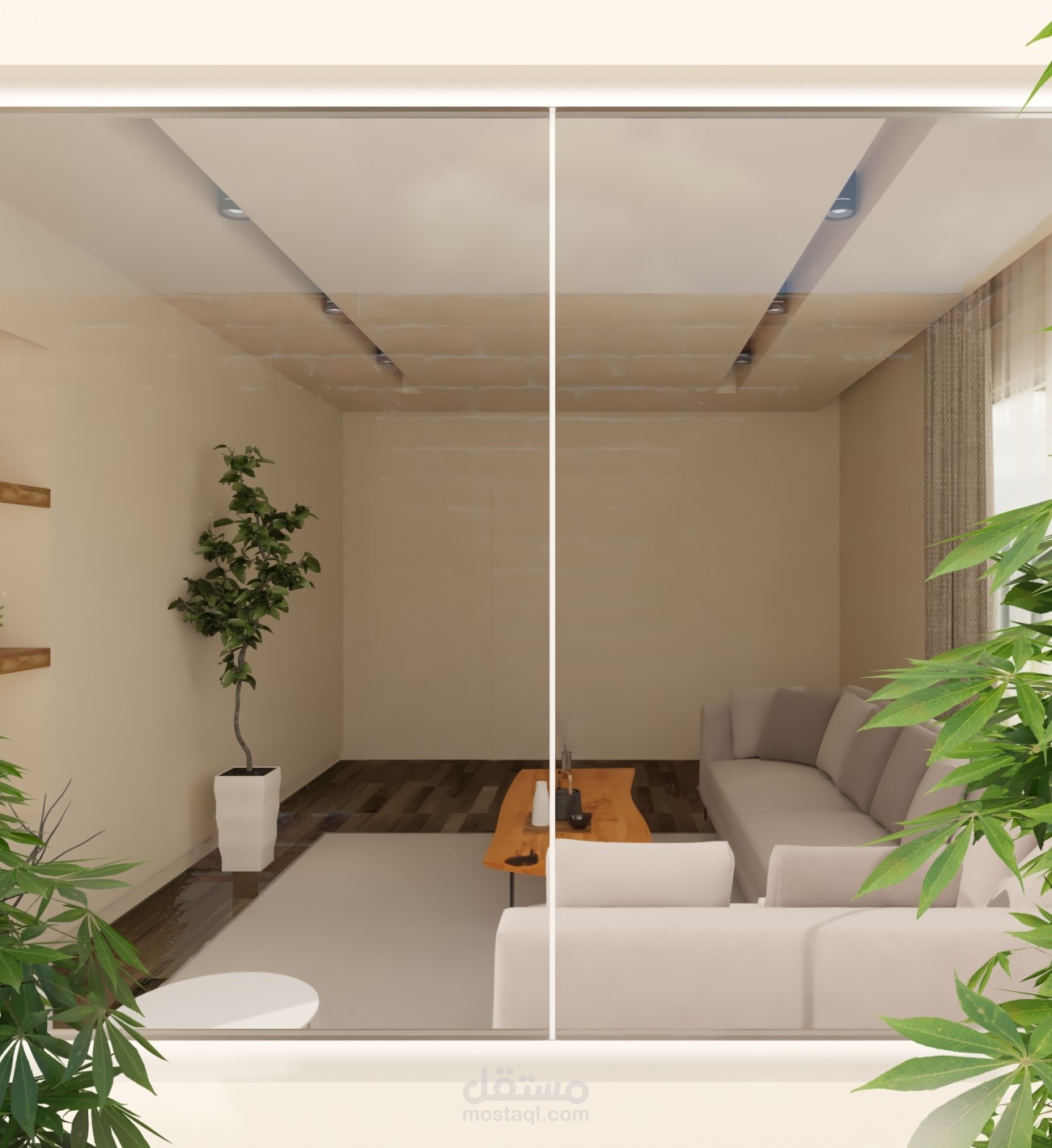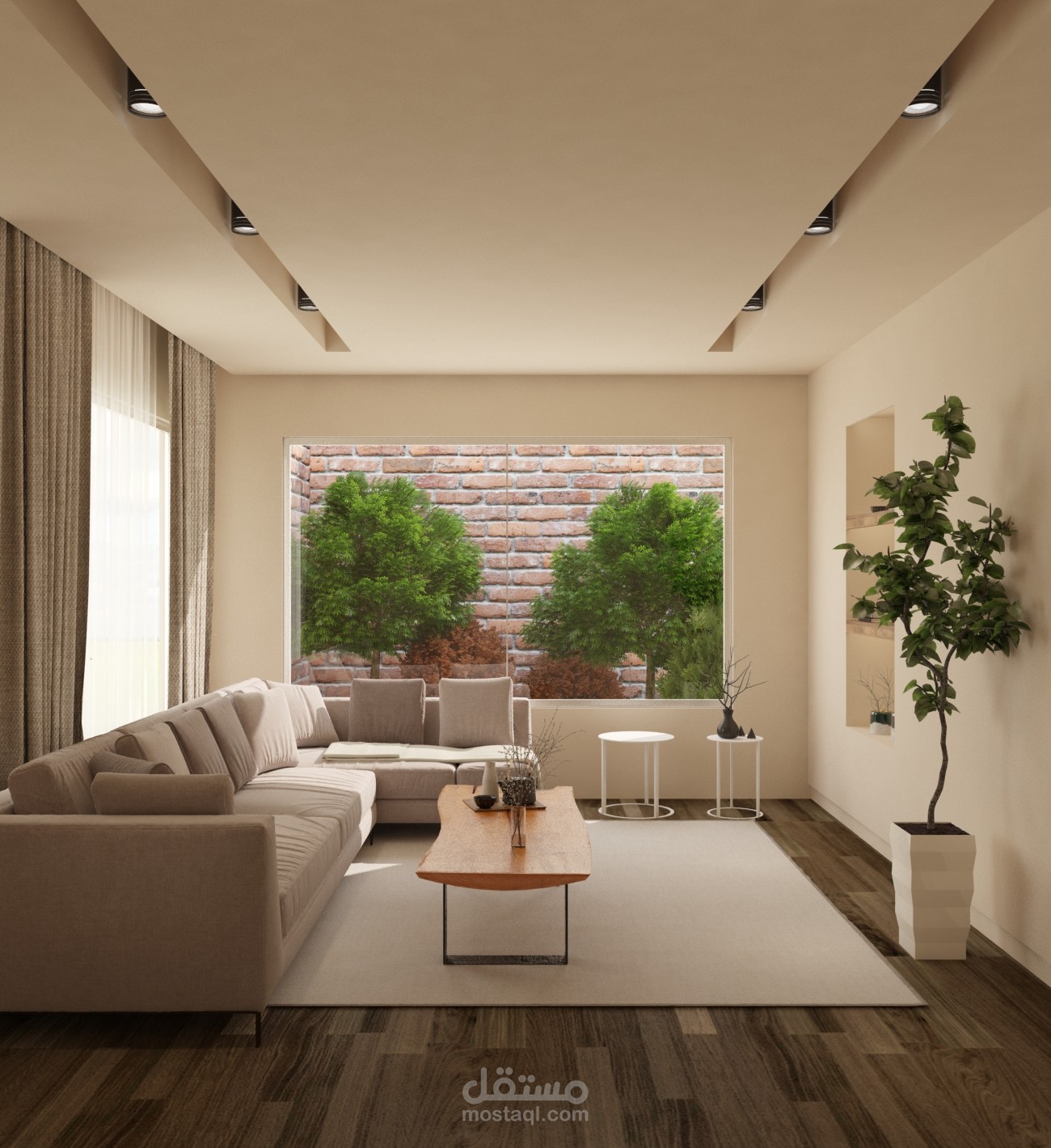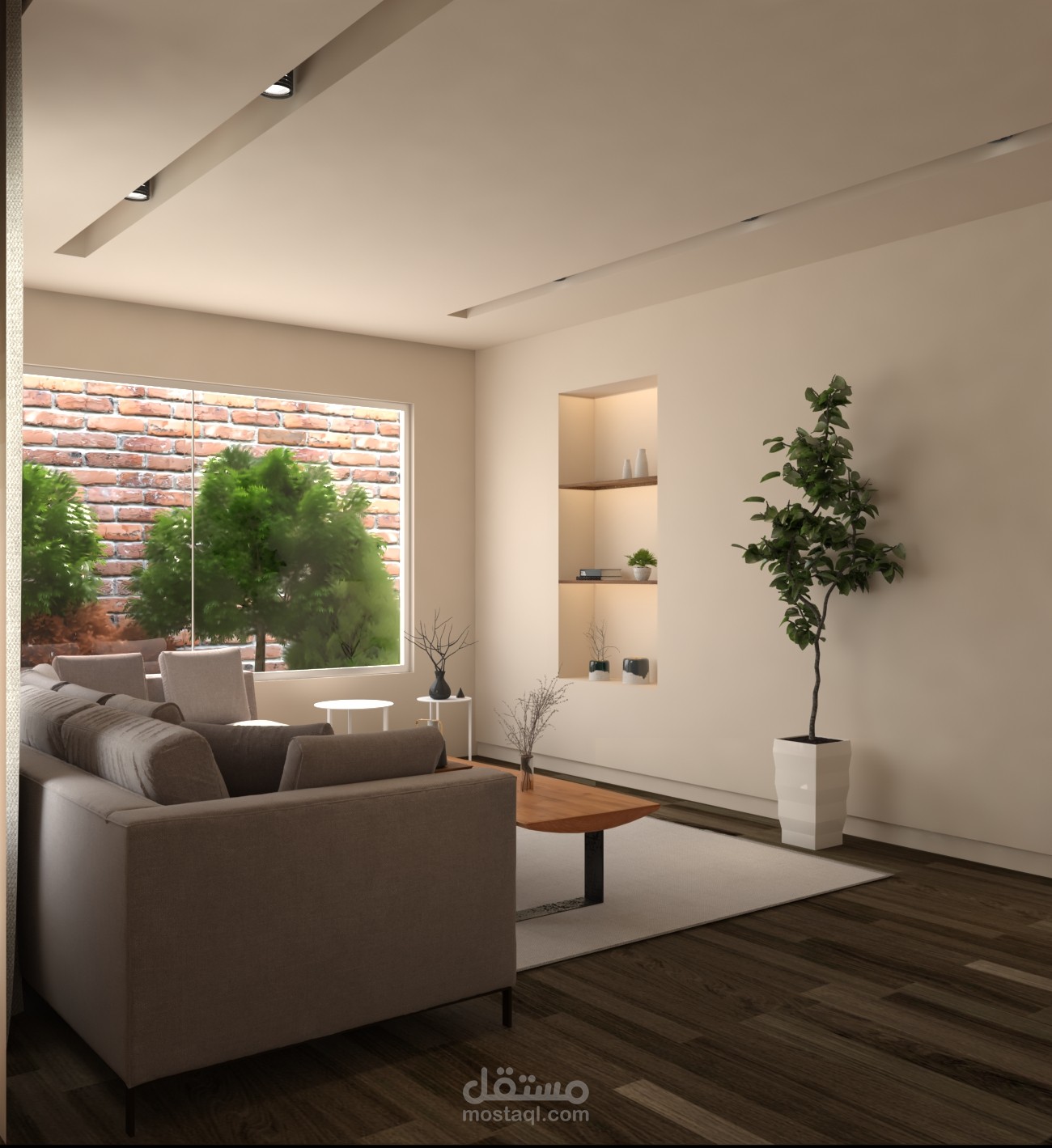 تصميم داخلي وديكور لغرفة معيشة وفق مبدأ الMinimalism في التصميم الداخلي واستخدام Moodboard الألوان الترابية والأرض مع تحقيق الإستدامة والراحة البدنية والنفسية في الفراغ الداخلي.