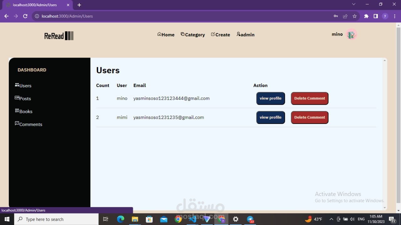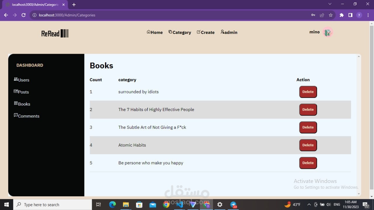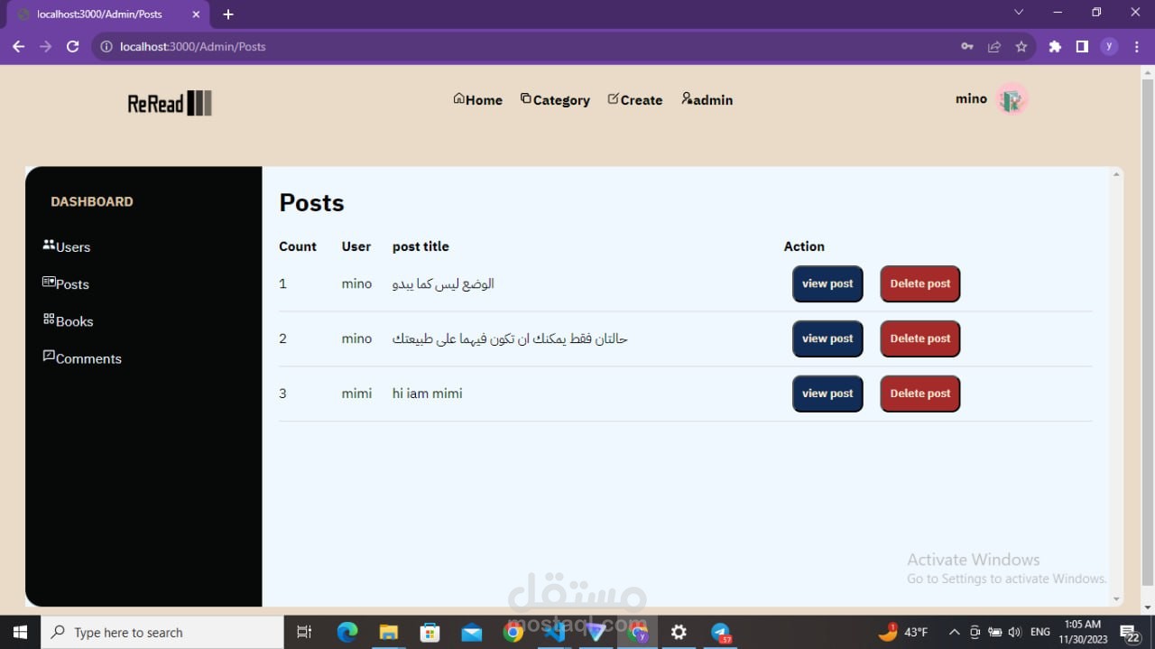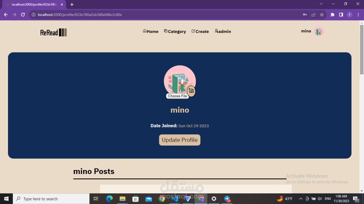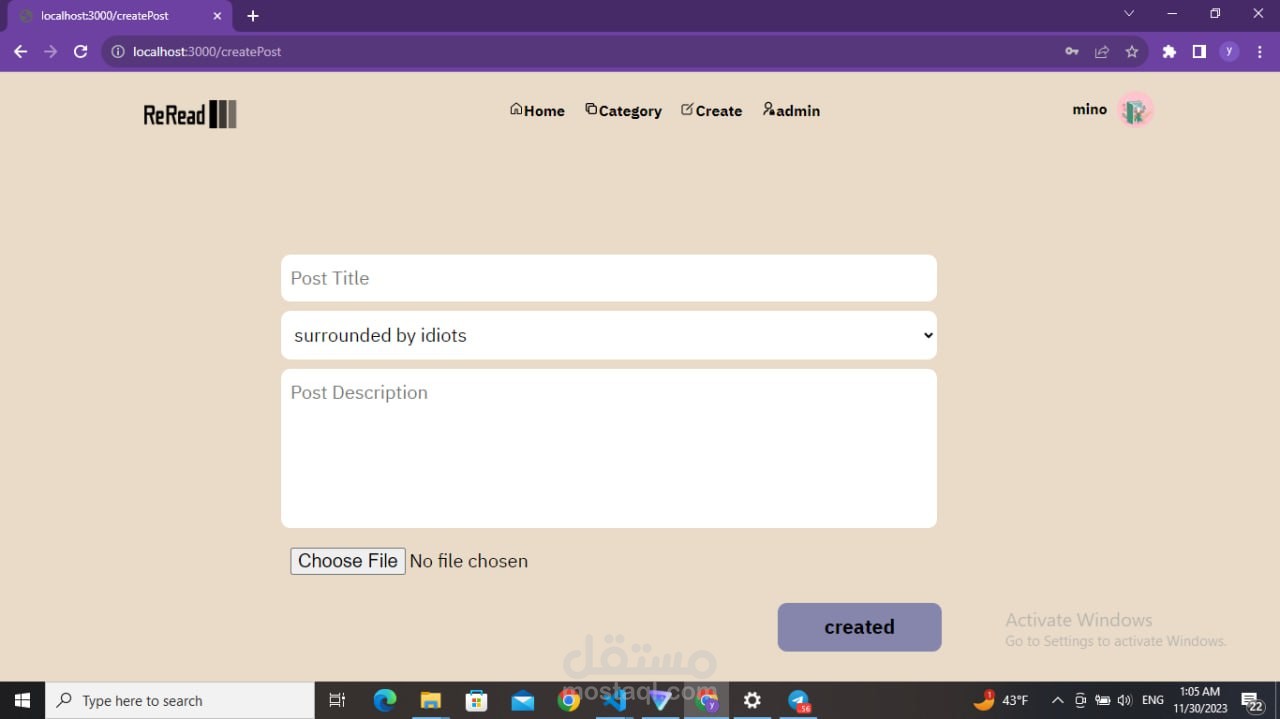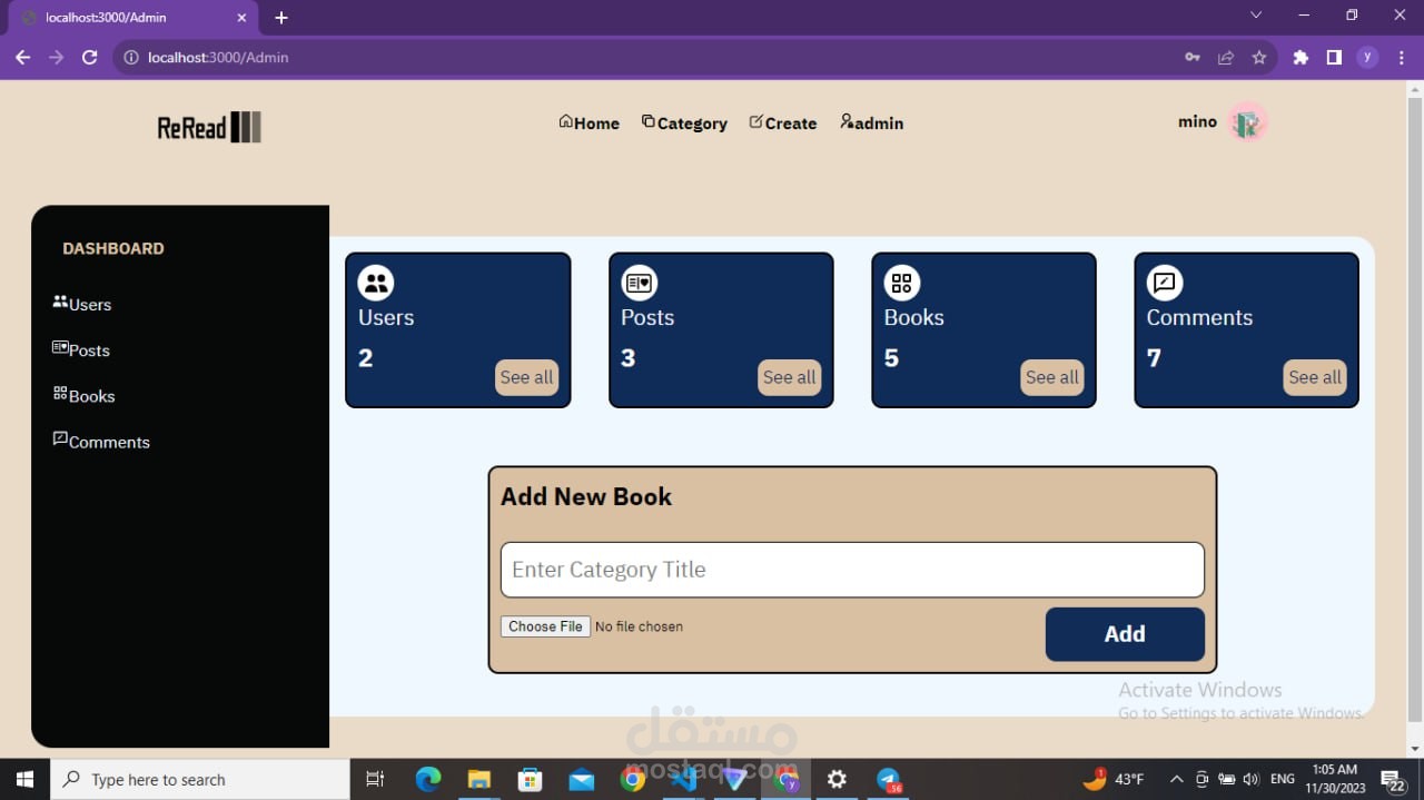 ▶️When you logged in as normal user apear for you create where you can publish a new post and connection it with any book you already have and add "comment" and "like" on posts