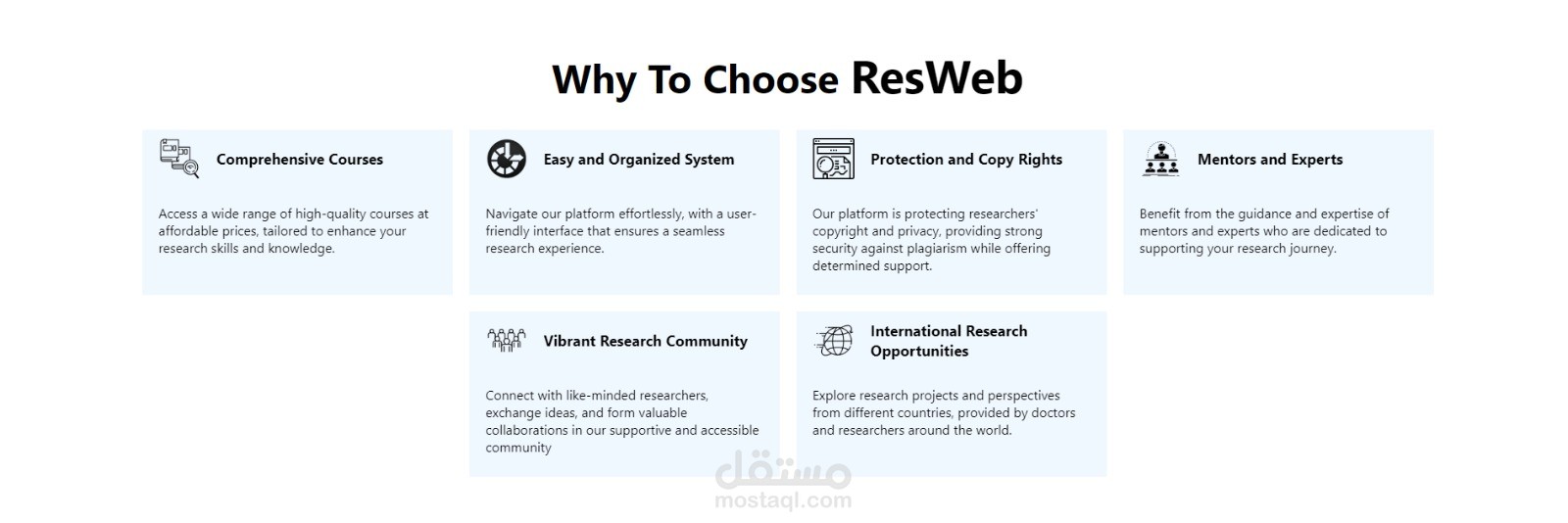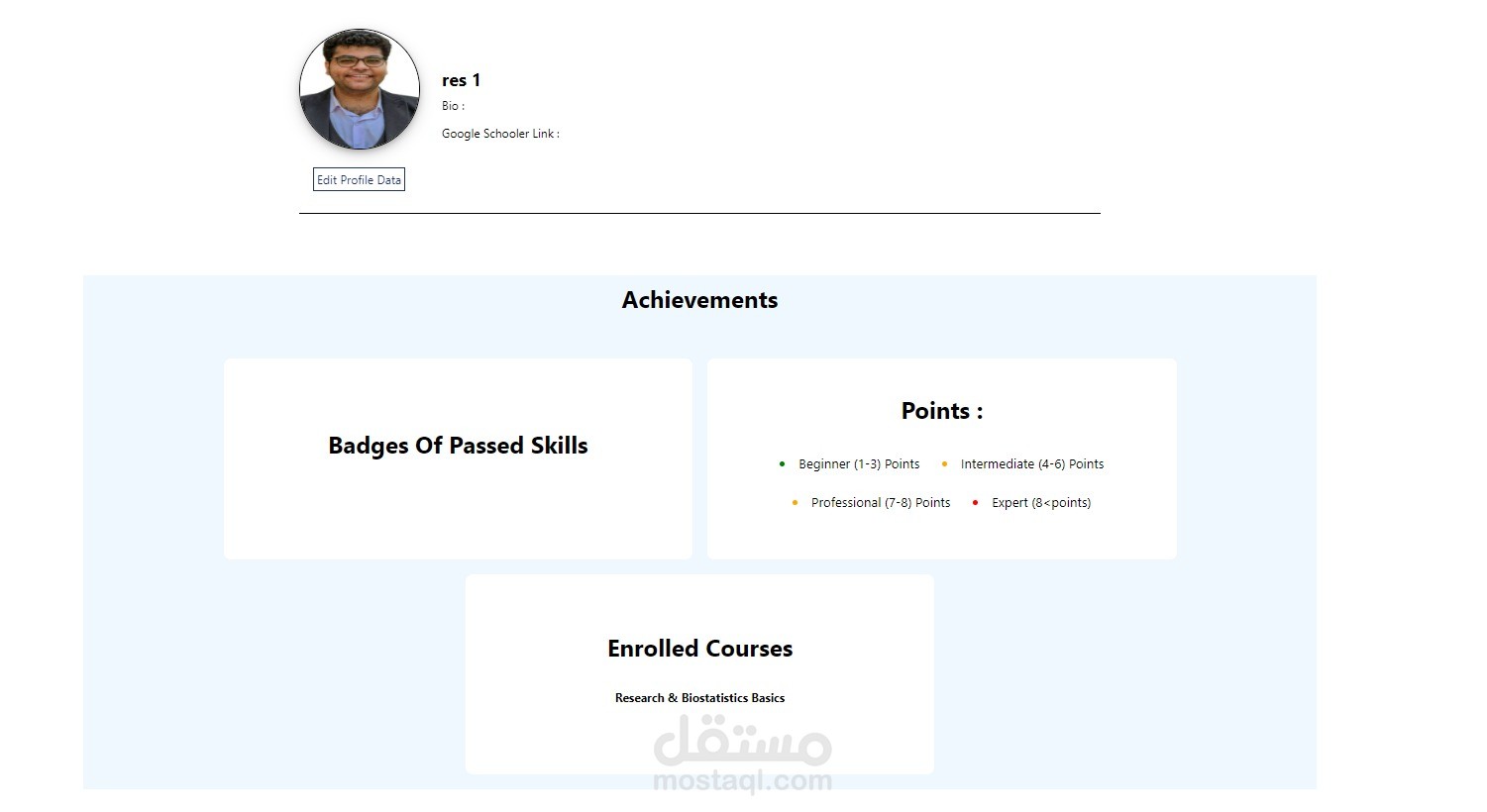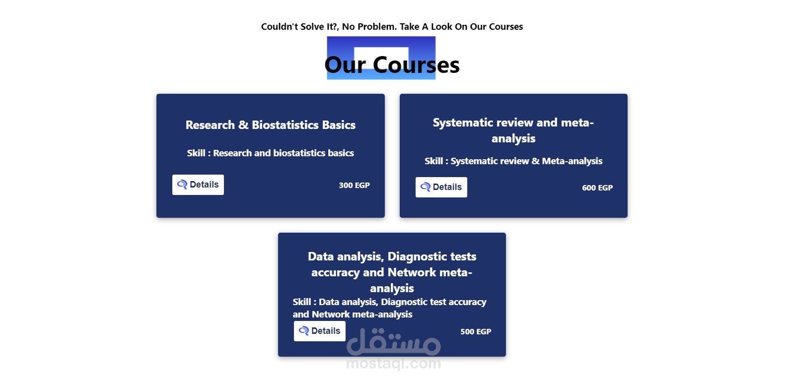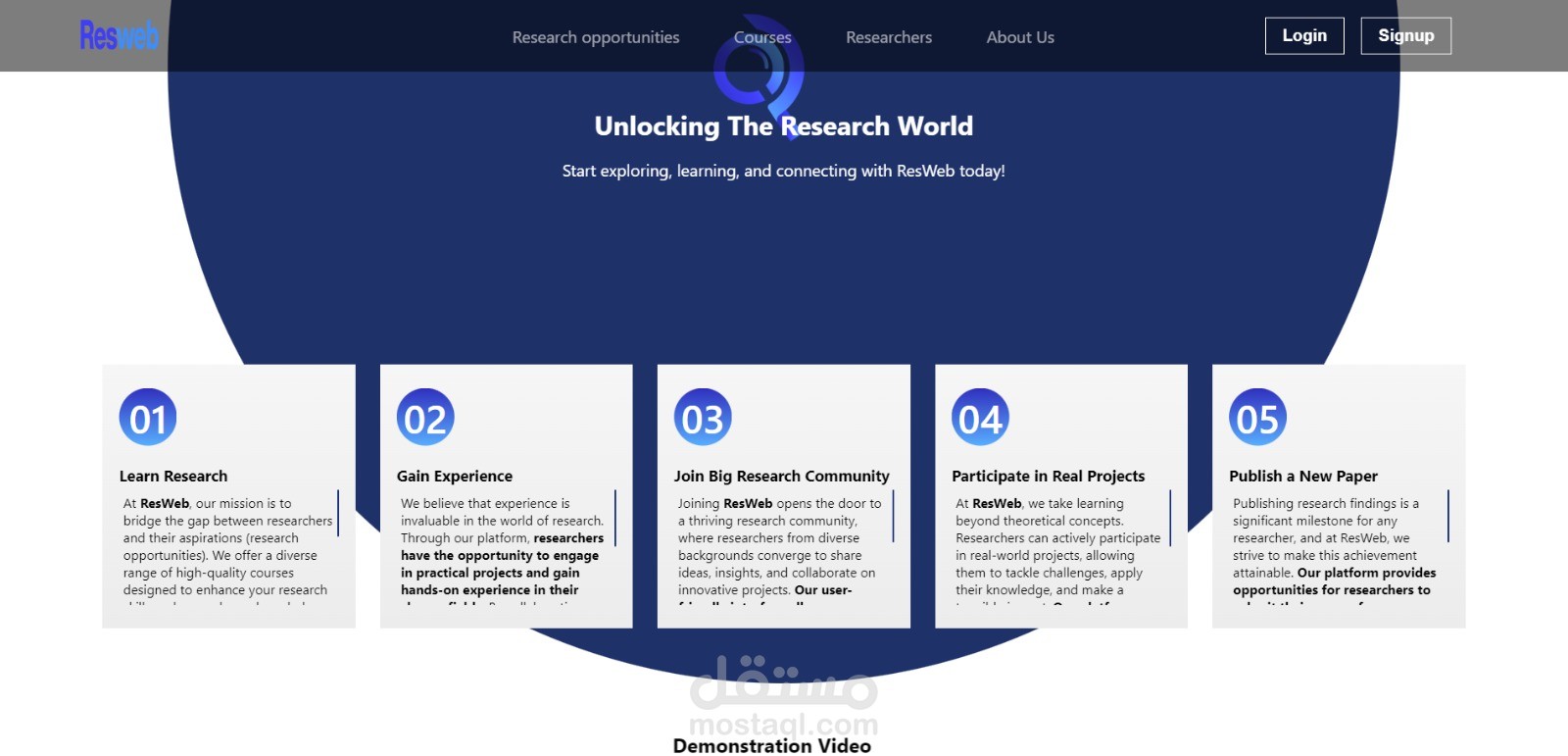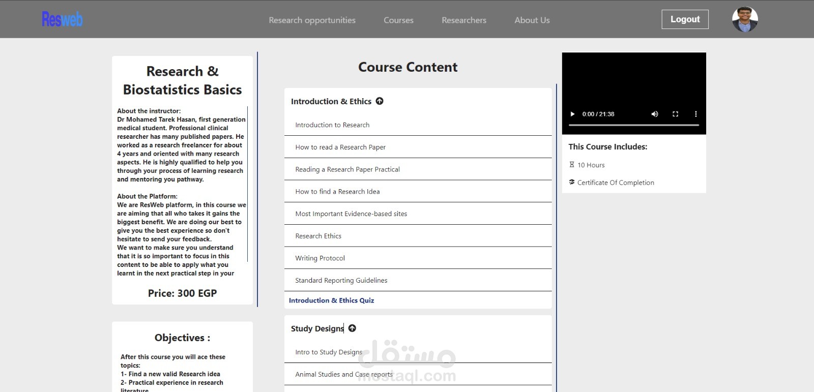 قمت بتطوير موقع تعليمي شامل يتكون من أقسام متنوعة. يتيح الموقع للمستخدمين الوصول إلى دورات تعليمية مع مقاطع فيديو، وضمنت تأمين الوصول بحيث يمكن للأشخاص المشترين للمحتوي فقط الوصول إلى هذه الدورات. أنشأت قسمًا خاصًا للباحثين يمكنهم كتابة وتحرير ونشر أوراقهم البحثية بسهولة.